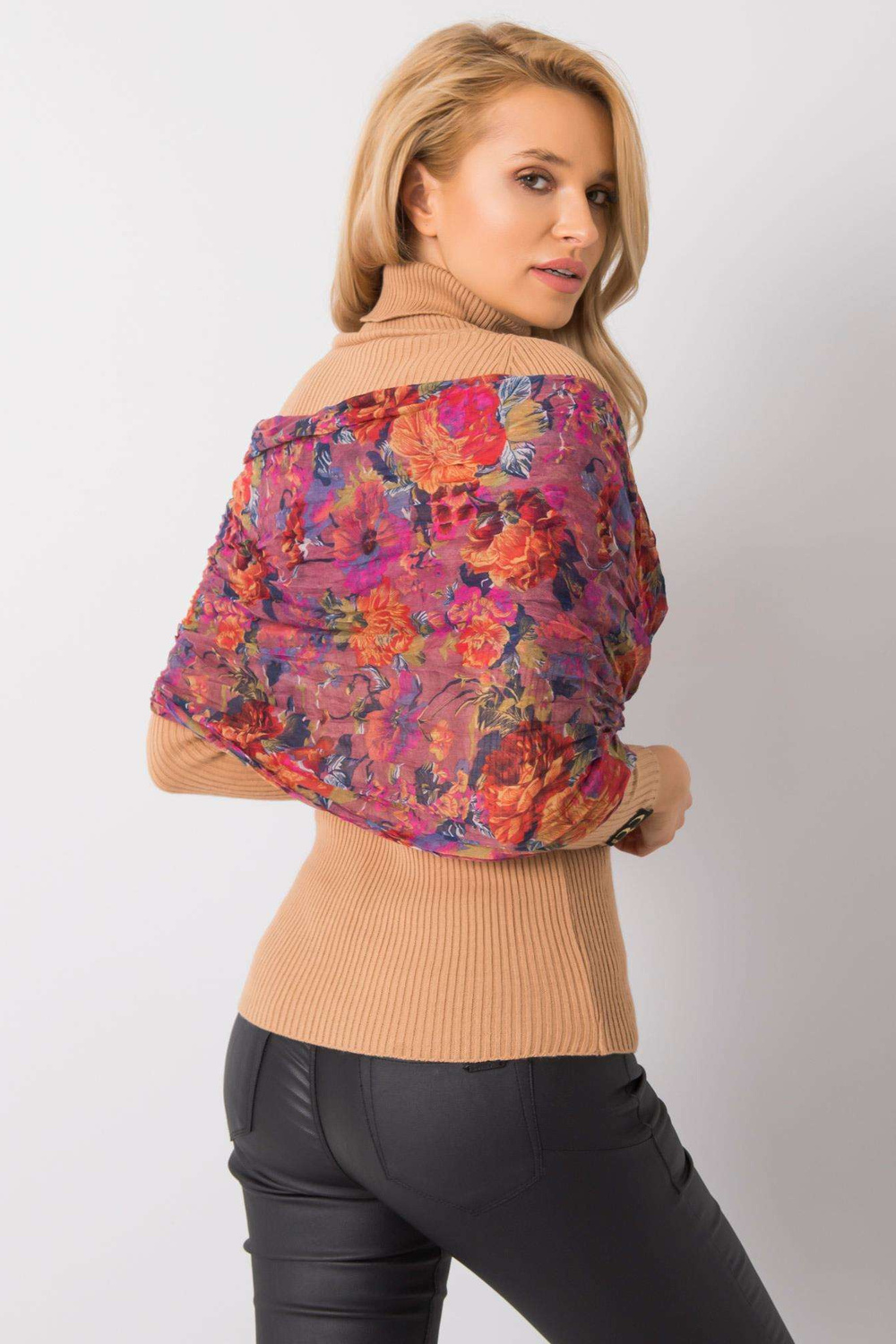 Nešvarios rožinės spalvos skarelė su gėlių raštais.