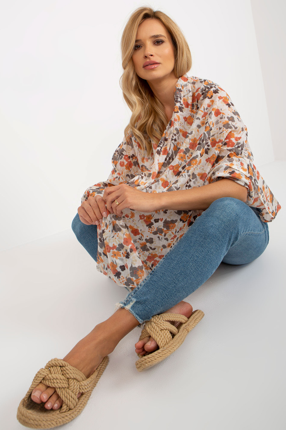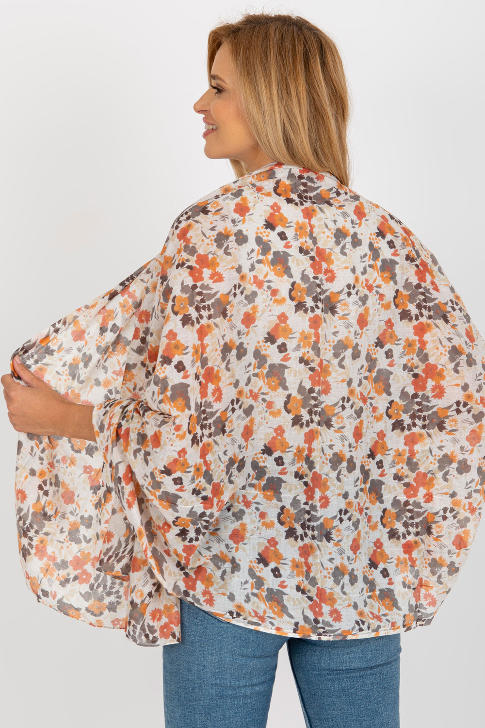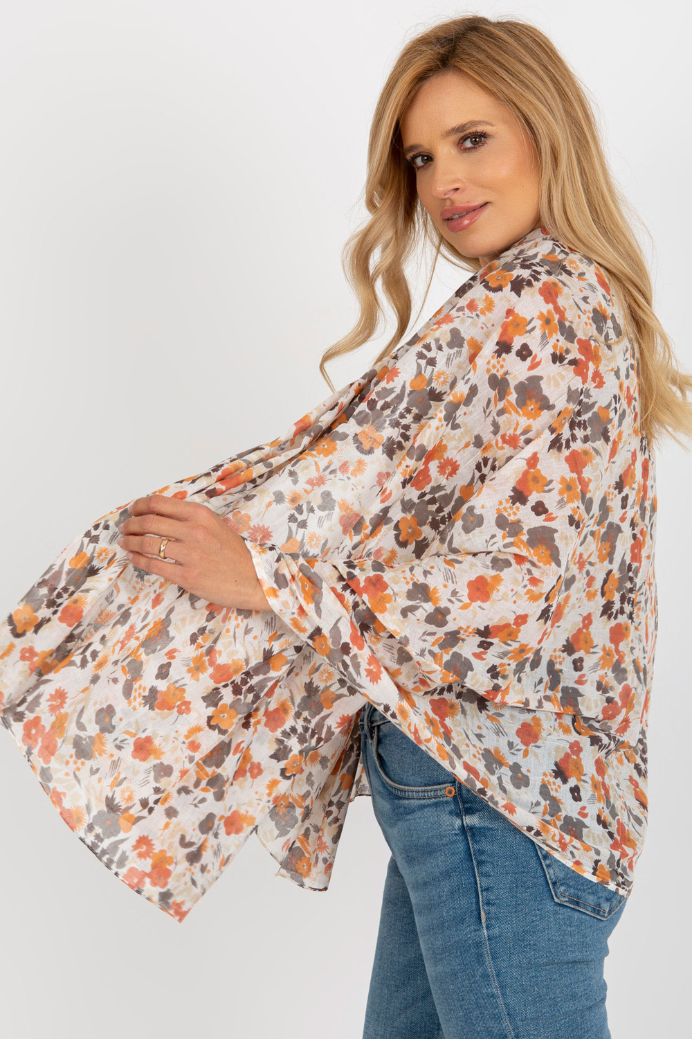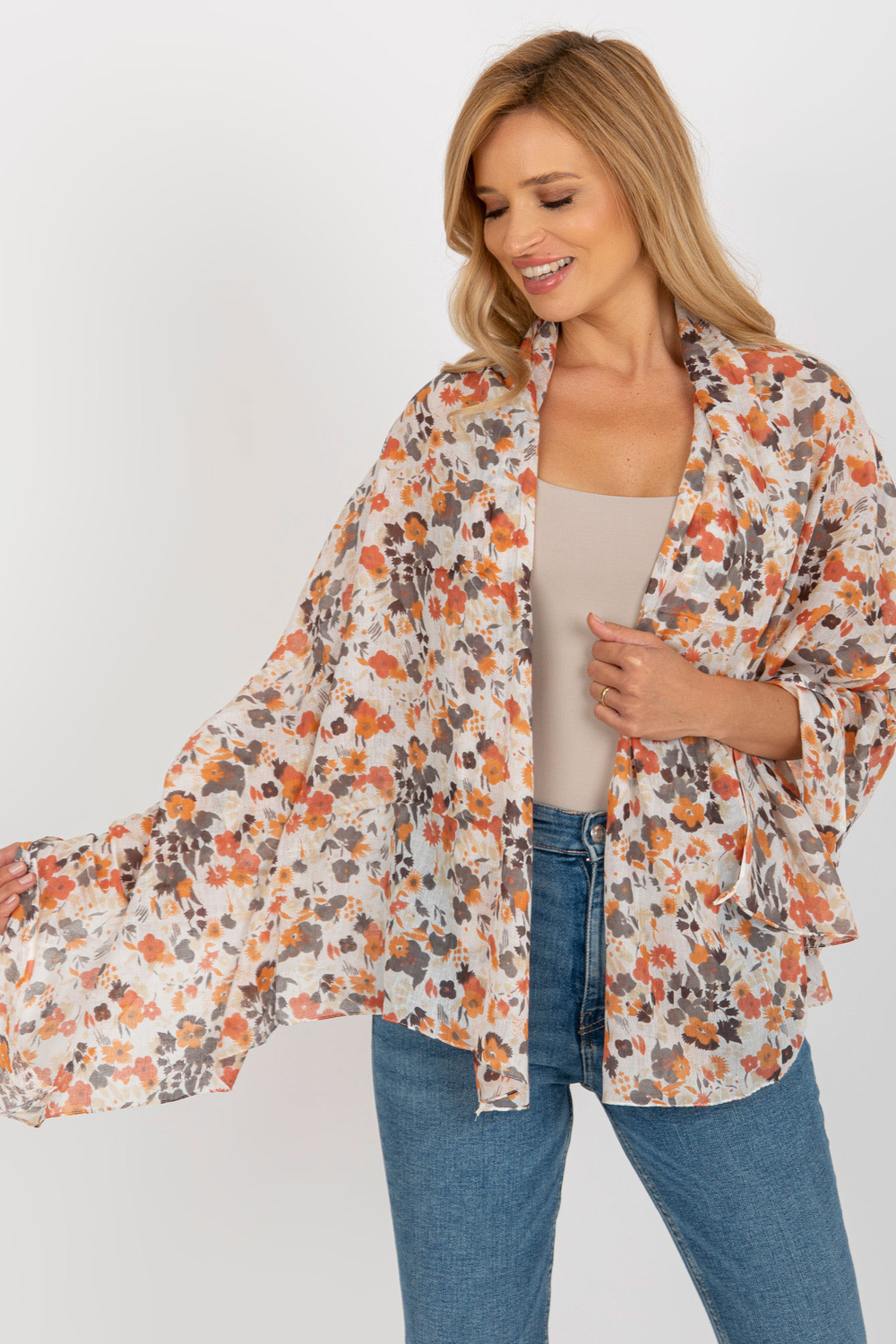 Oranžinis ir baltas gėlėtas medvilninis šalikas.