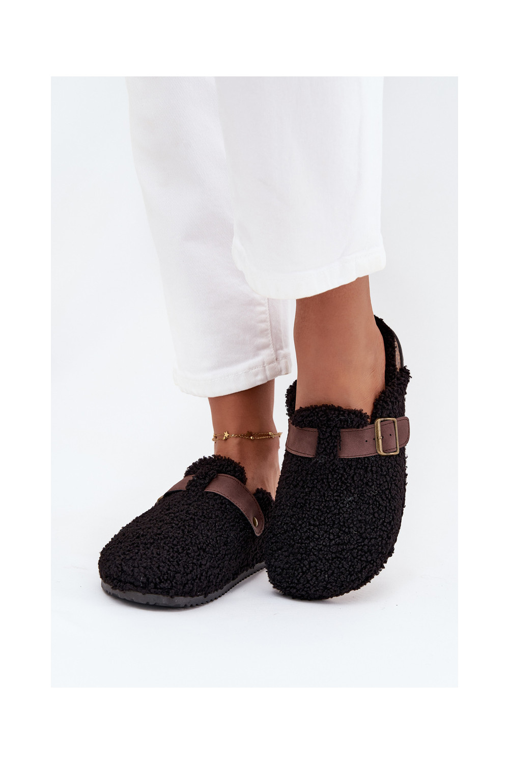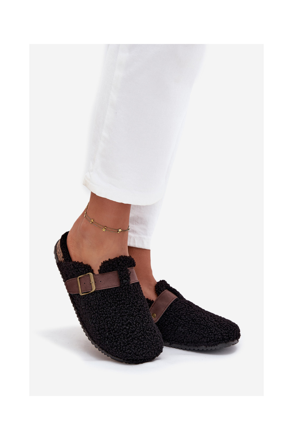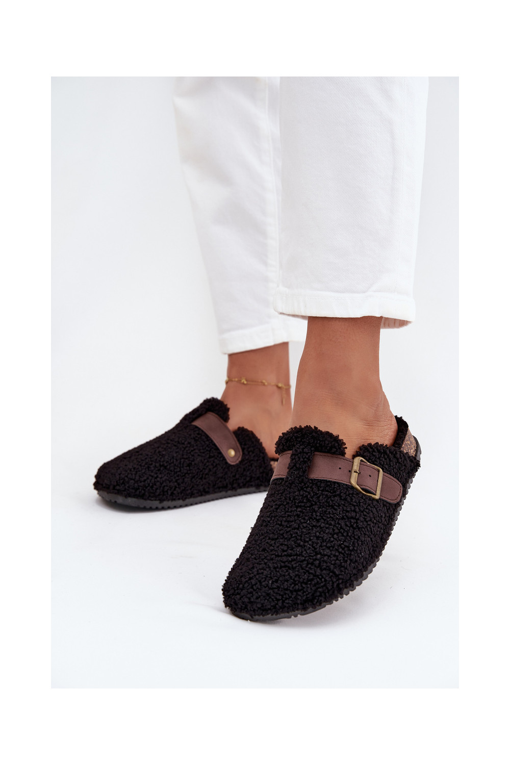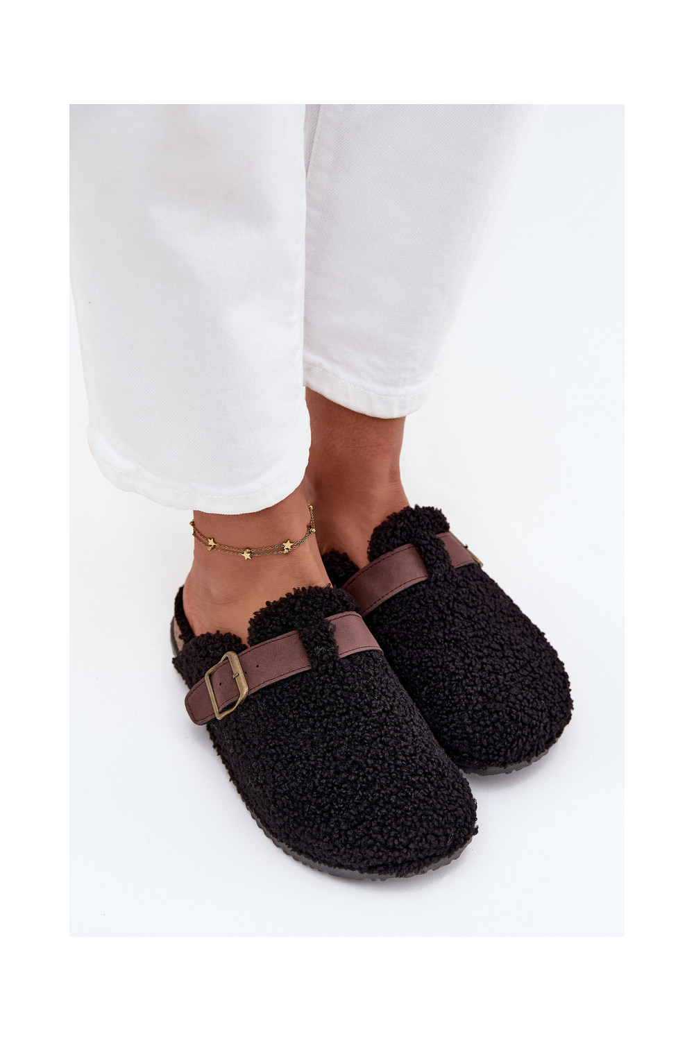 Moteriškos šlepetės su avikailio tipo kailiuku, juodos spalvos Lorivine