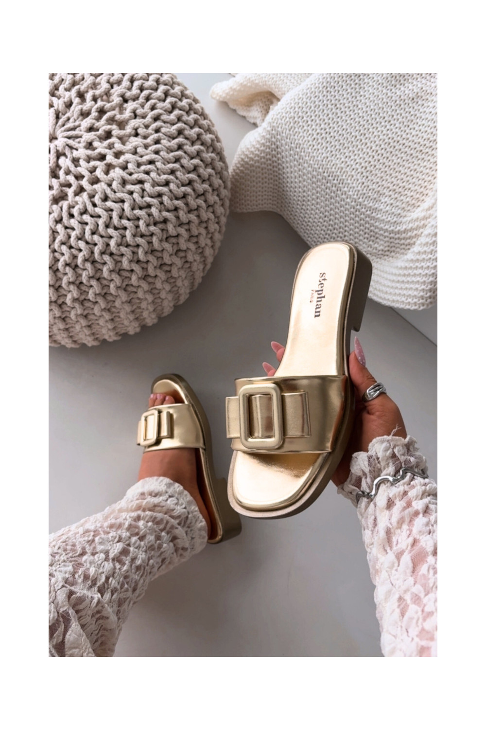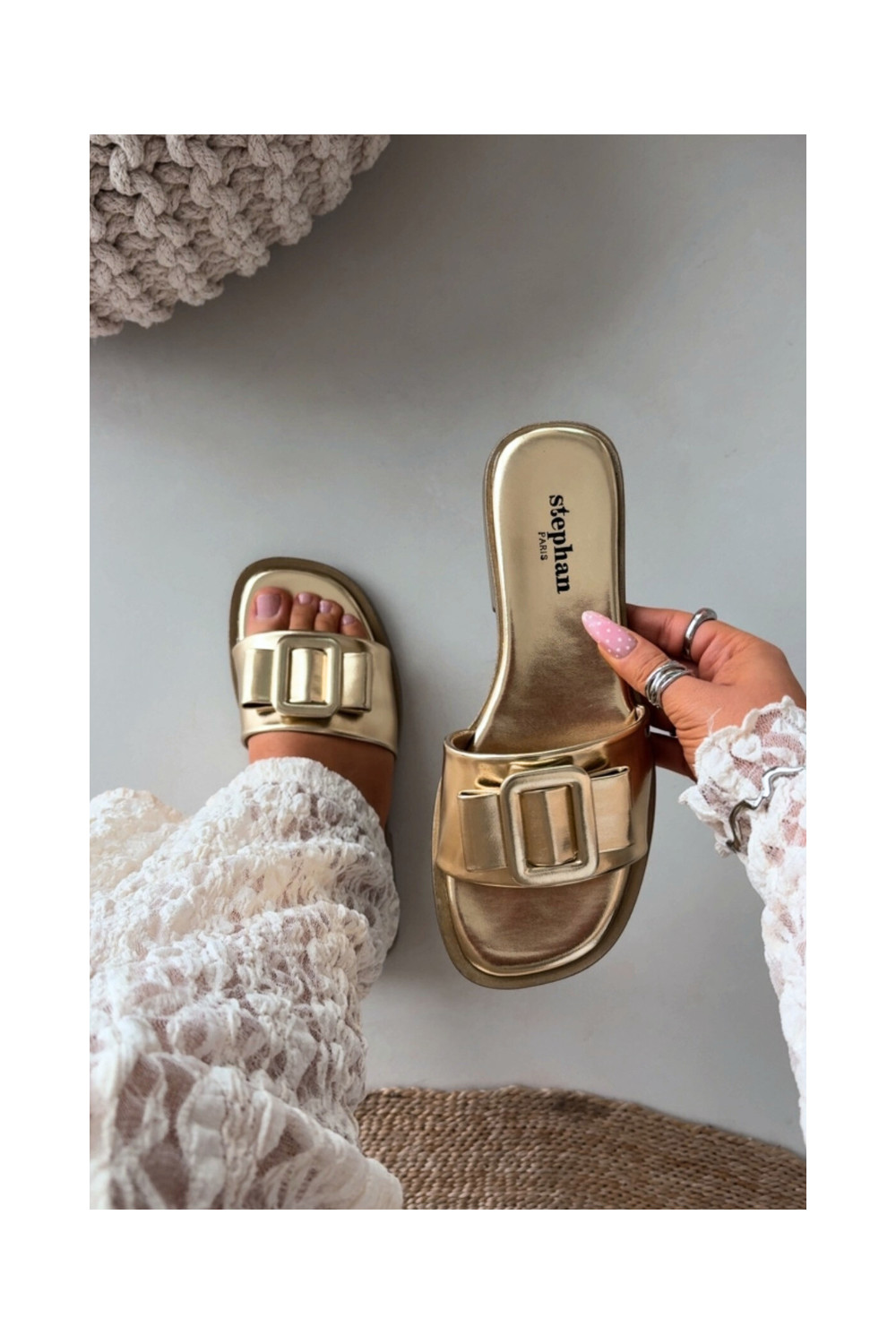 Moteriškos šlepetės su plačiais kulniukais su sagtimis aukso spalvos Melivra
