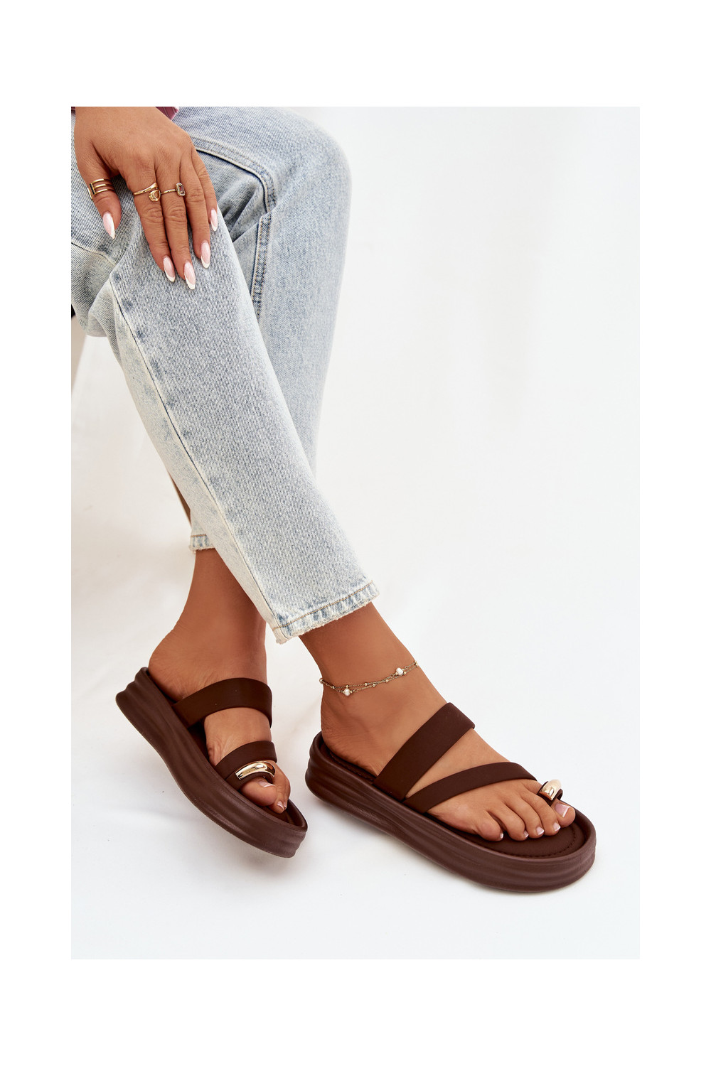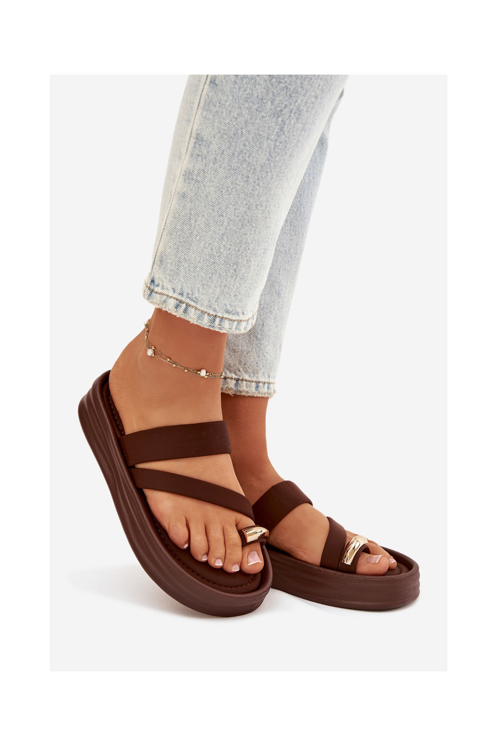 Moteriškos šlepetės su juostelėmis I aukso spalvosm Detalem Czekoladowe Farielle