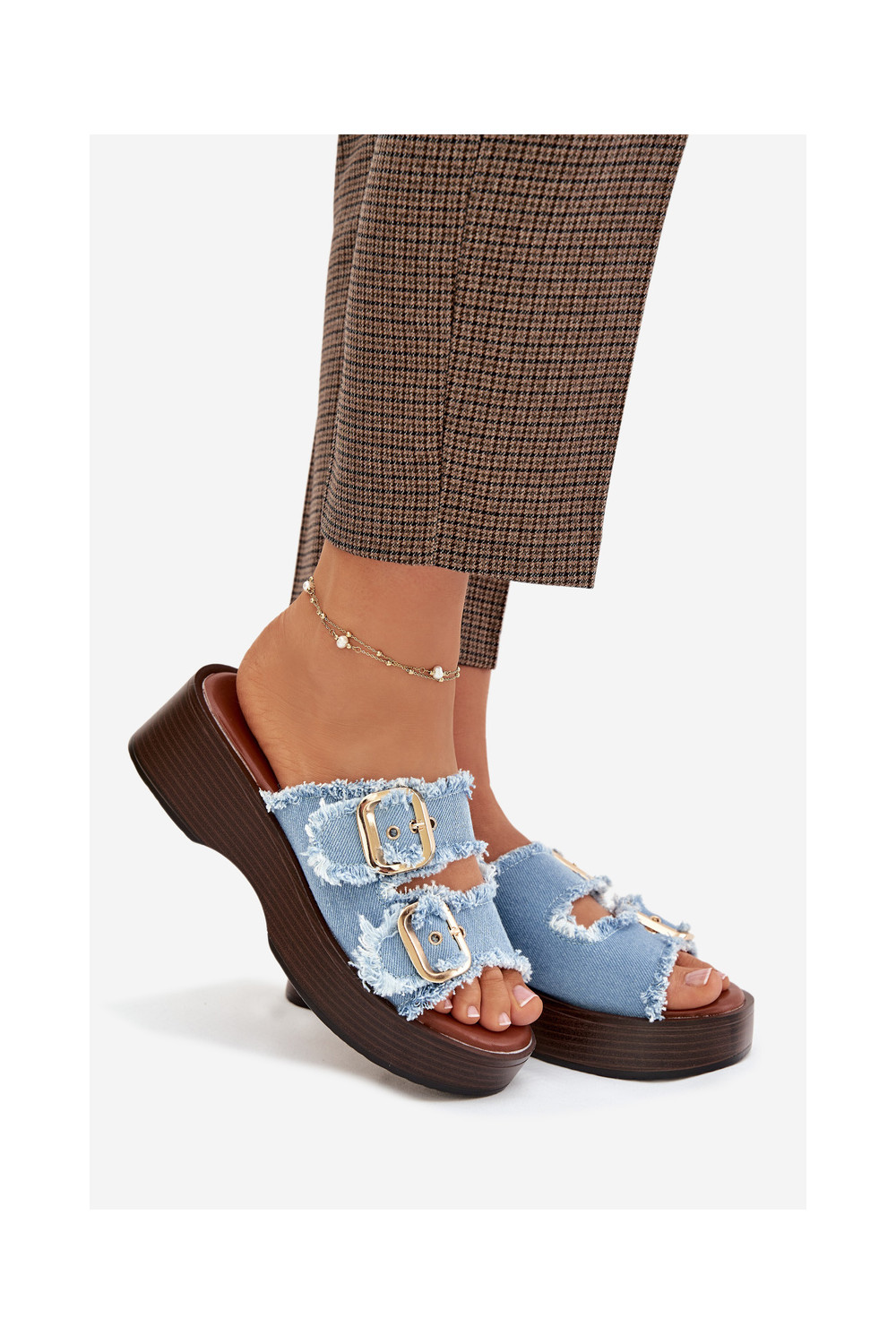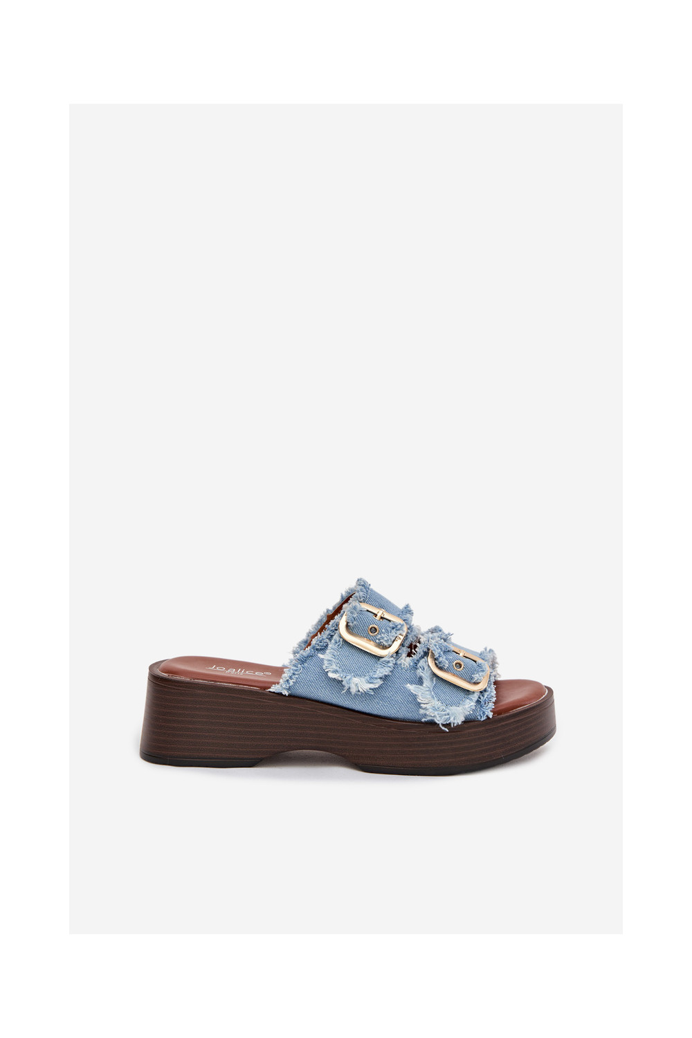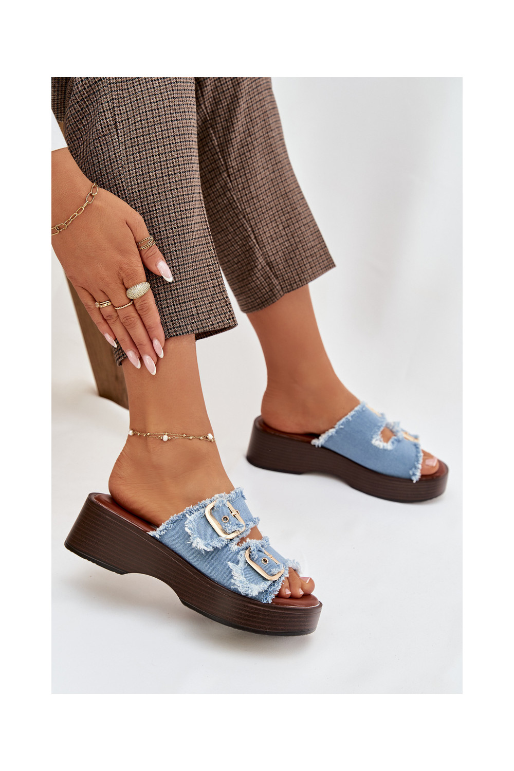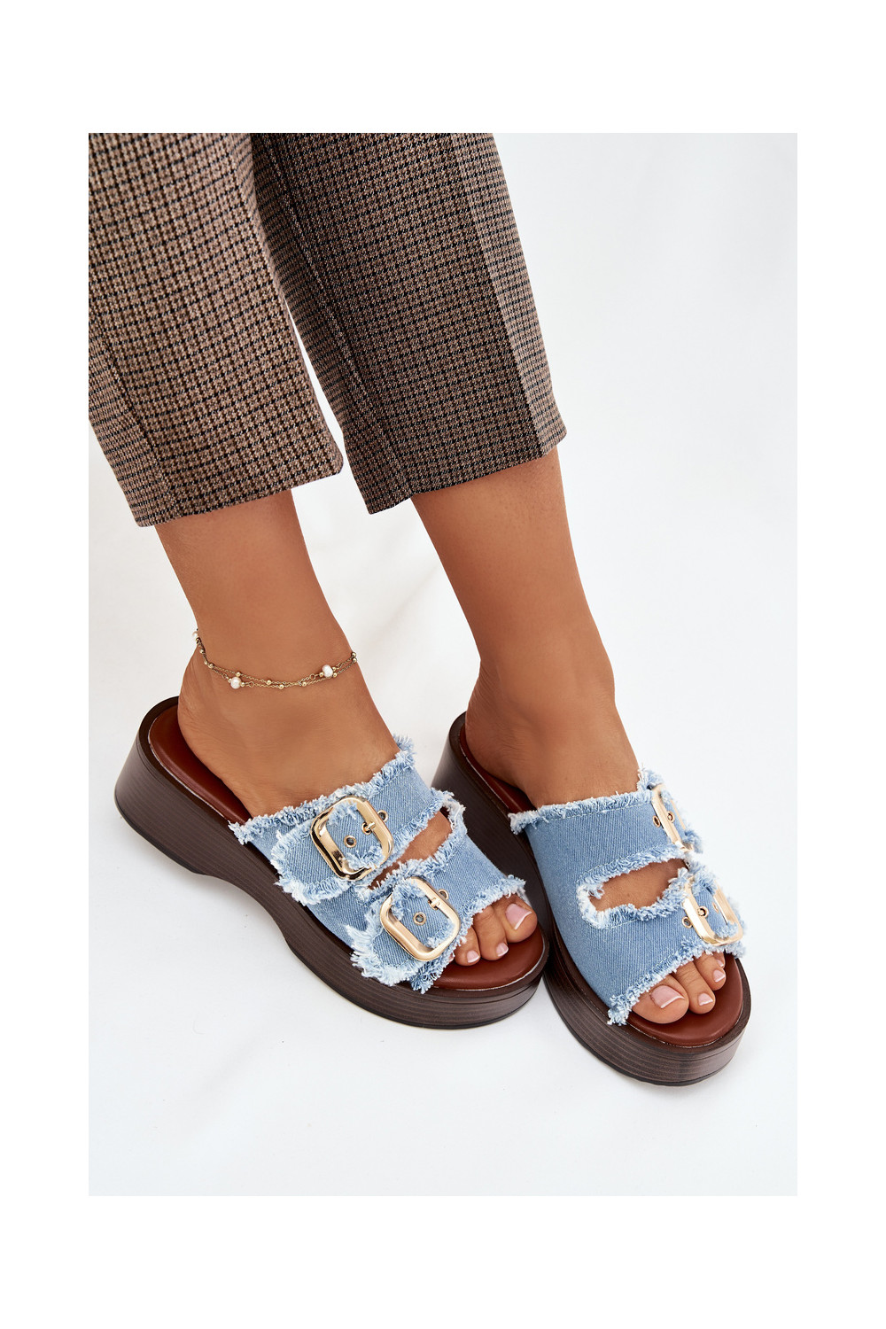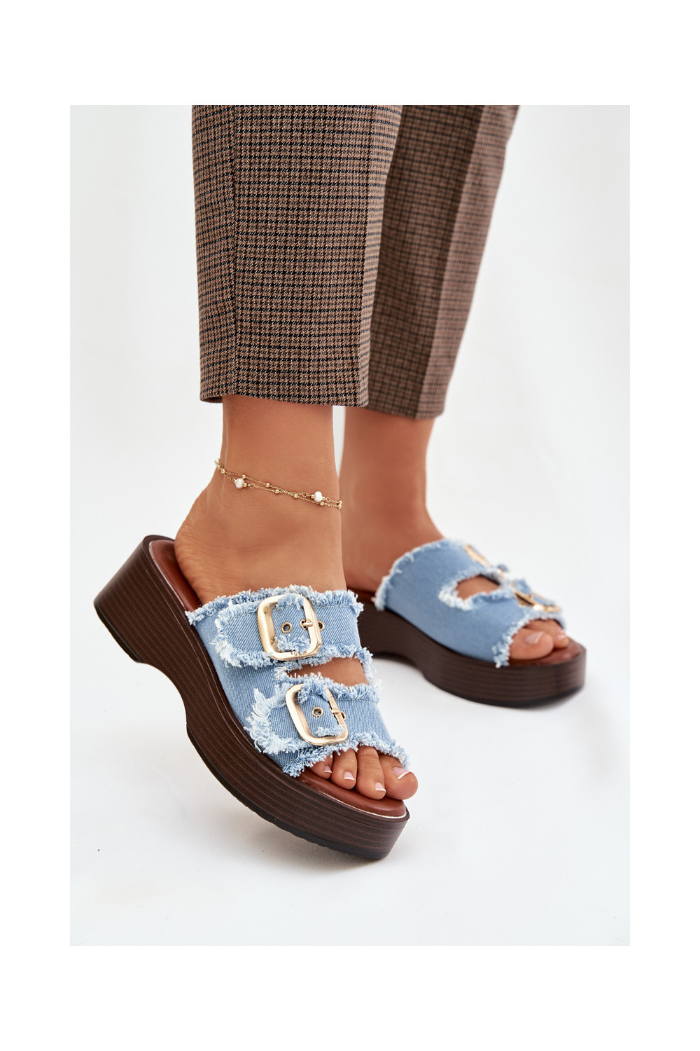 Moteriškos šlepetės su platforma Ze aukso spalvosmi su sagtimismi mėlynos spalvos Renelisse