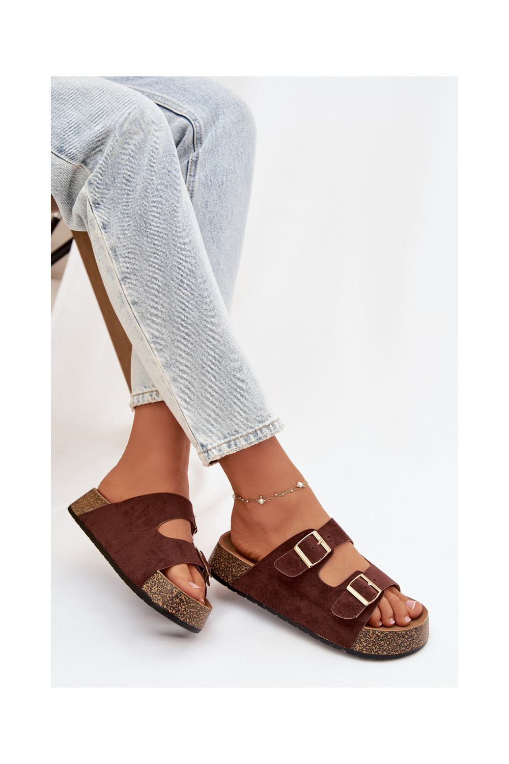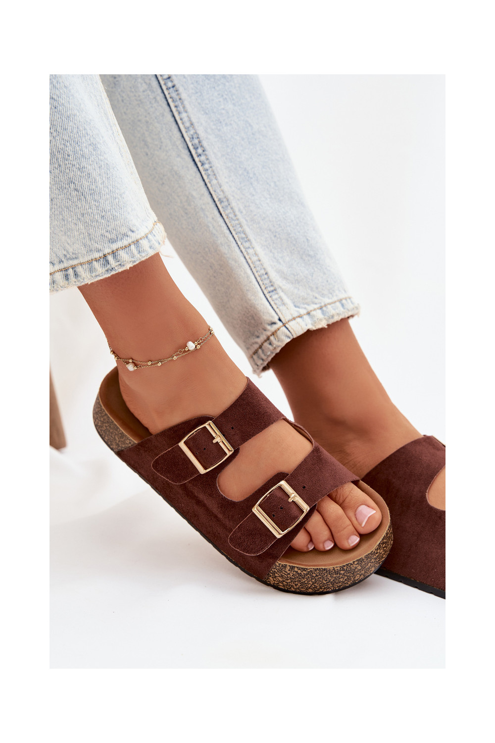 Moteriškos šlepetės su platforma Ze aukso spalvosmi su sagtimismi rudos spalvos Tovessa