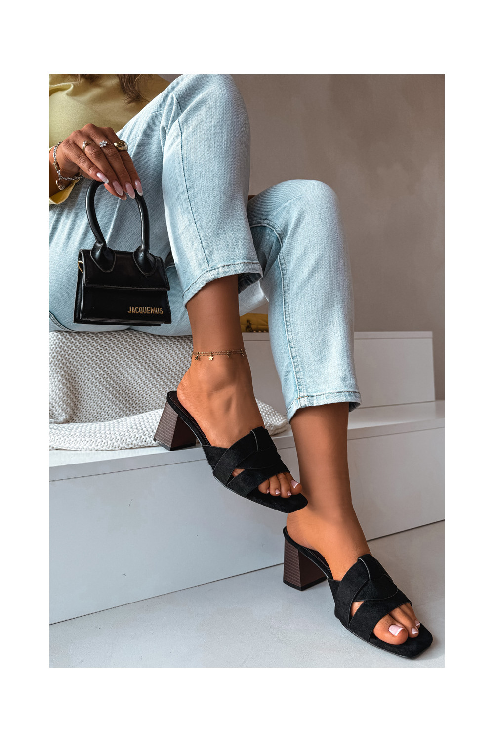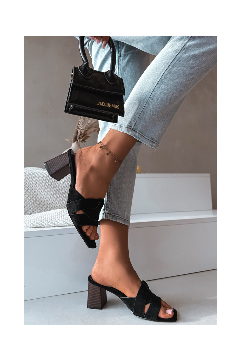 Moteriškos šlepetės su kulniukais su juostelėmis iš eko zomšosoĮe juodos spalvos Corivelle