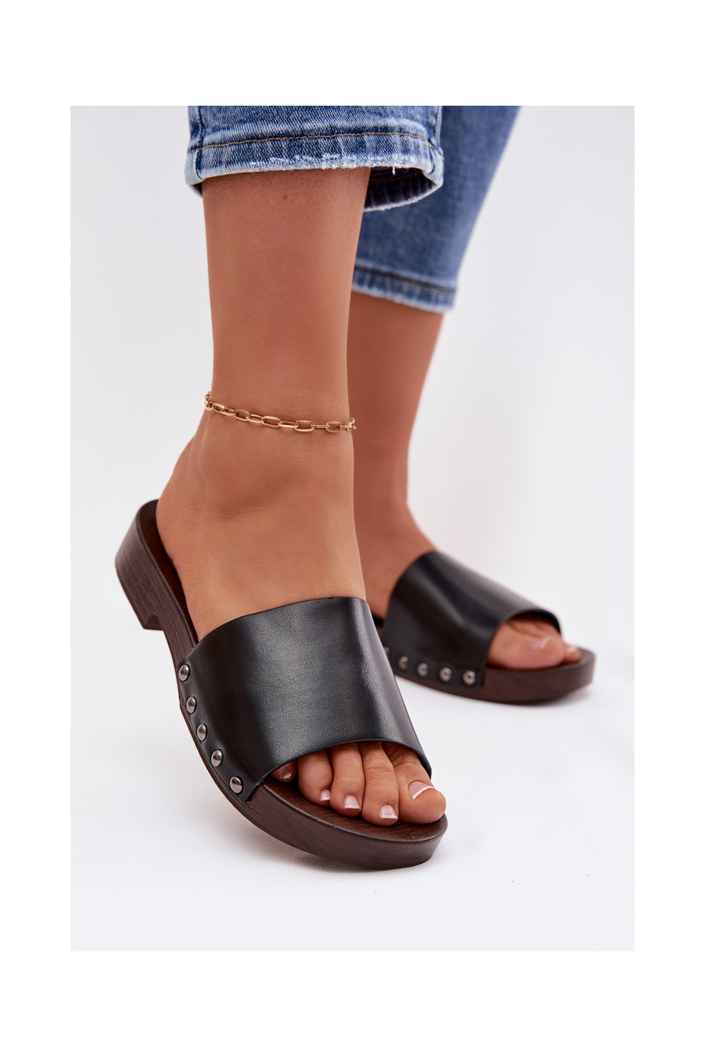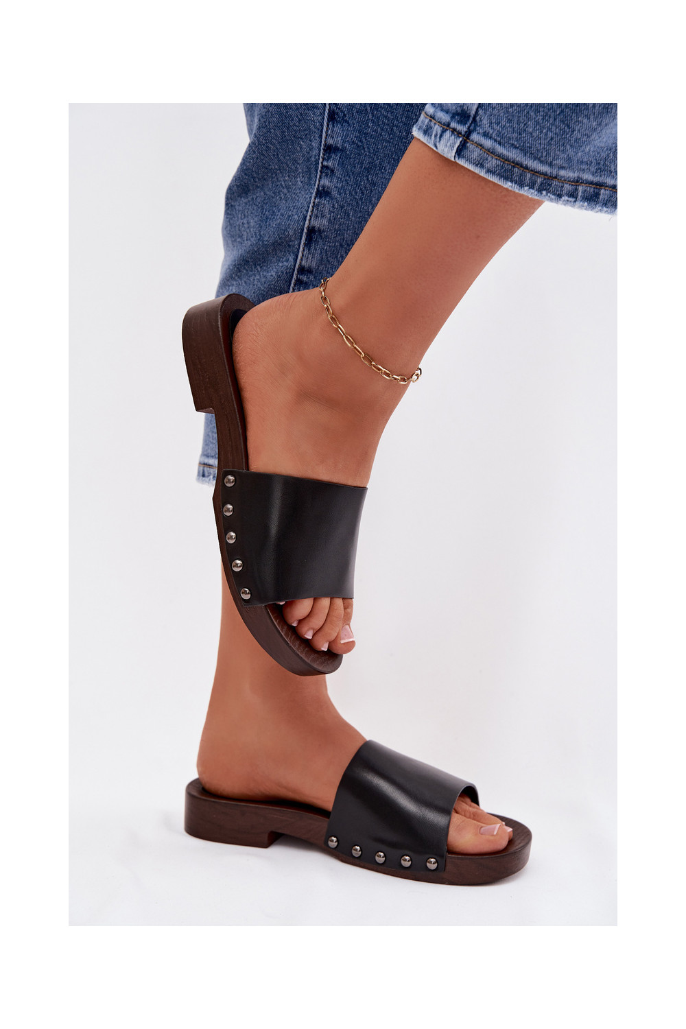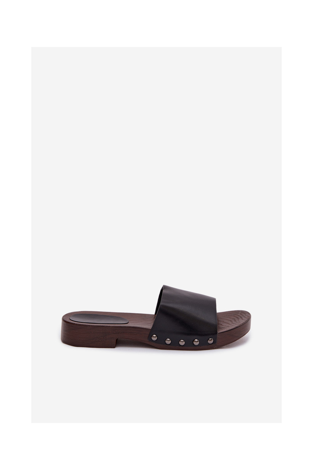 Moteriškos šlepetės su kniedėmis su plačiais kulniukais juodos spalvos Brinalle