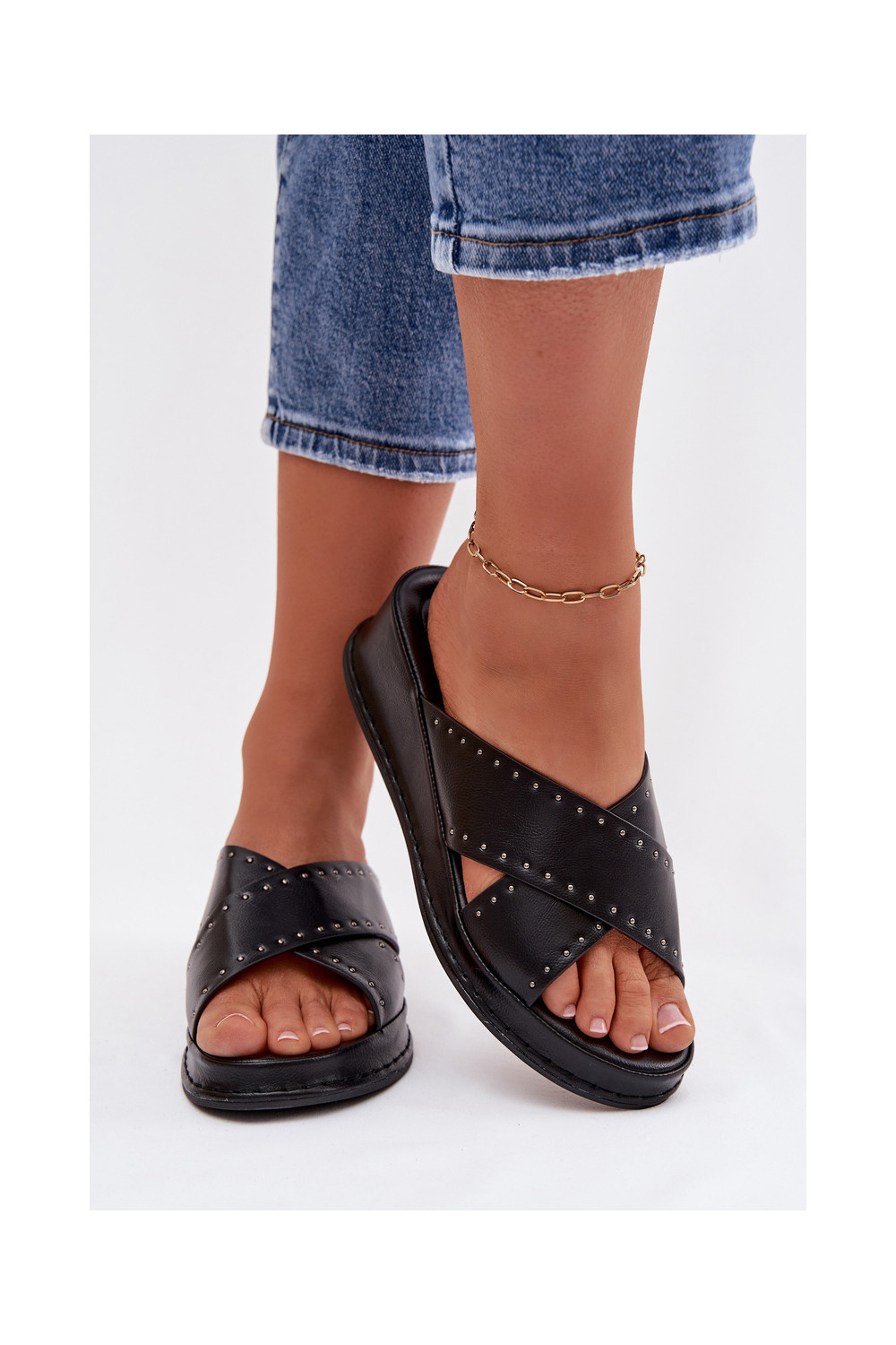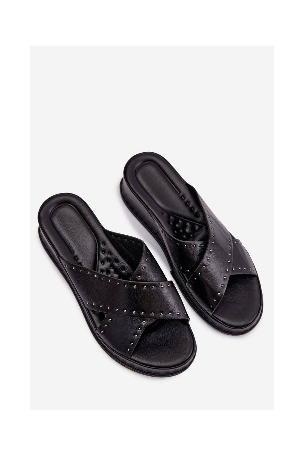 Dekoruotos Moteriškos šlepetės  iš eko odos Juodos spalvos Calorissa
