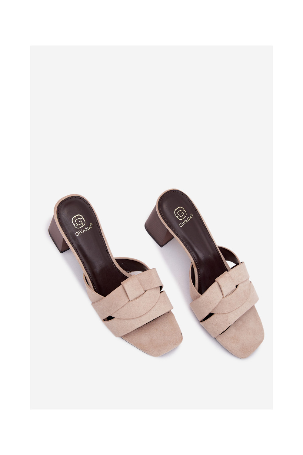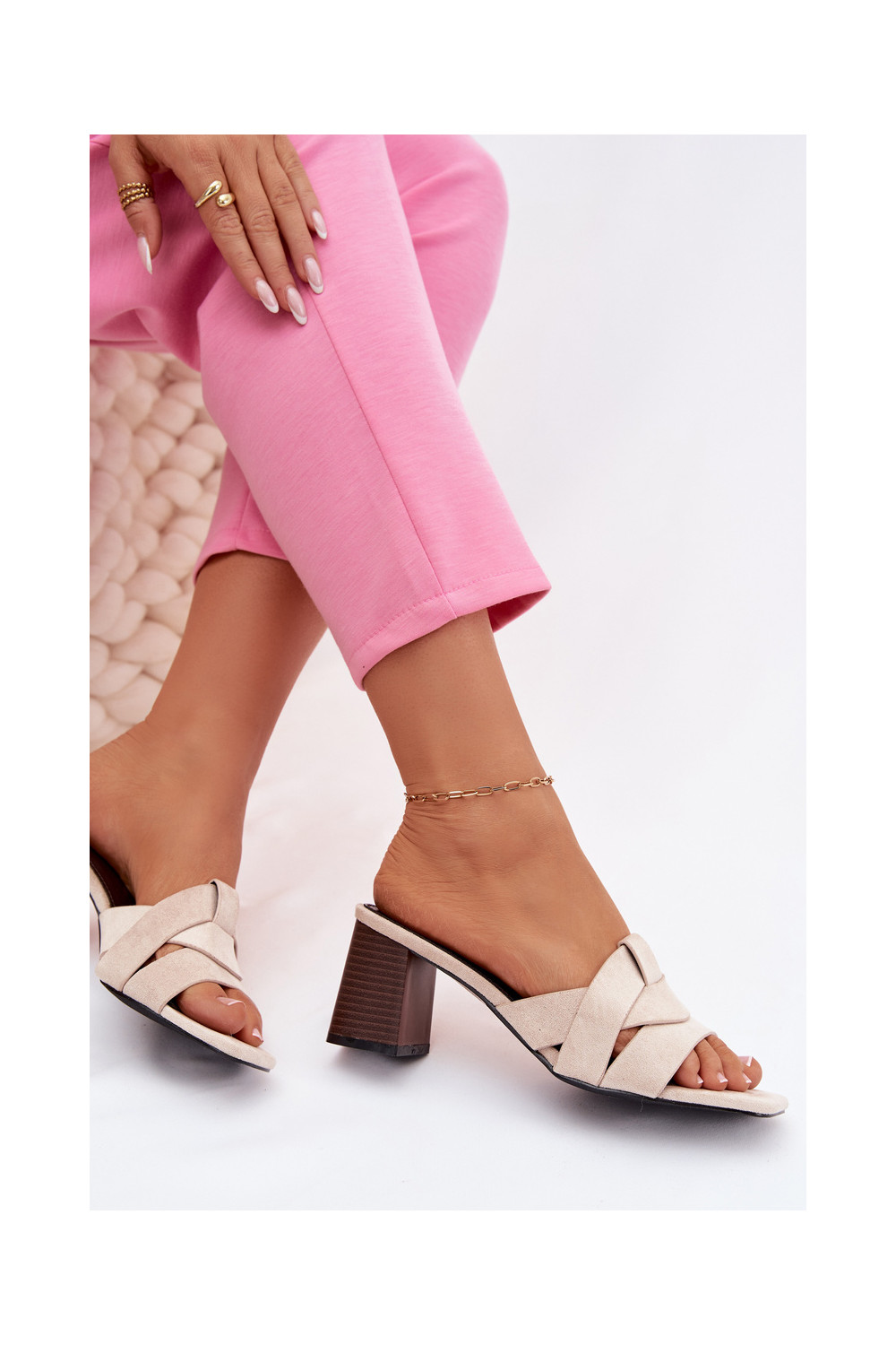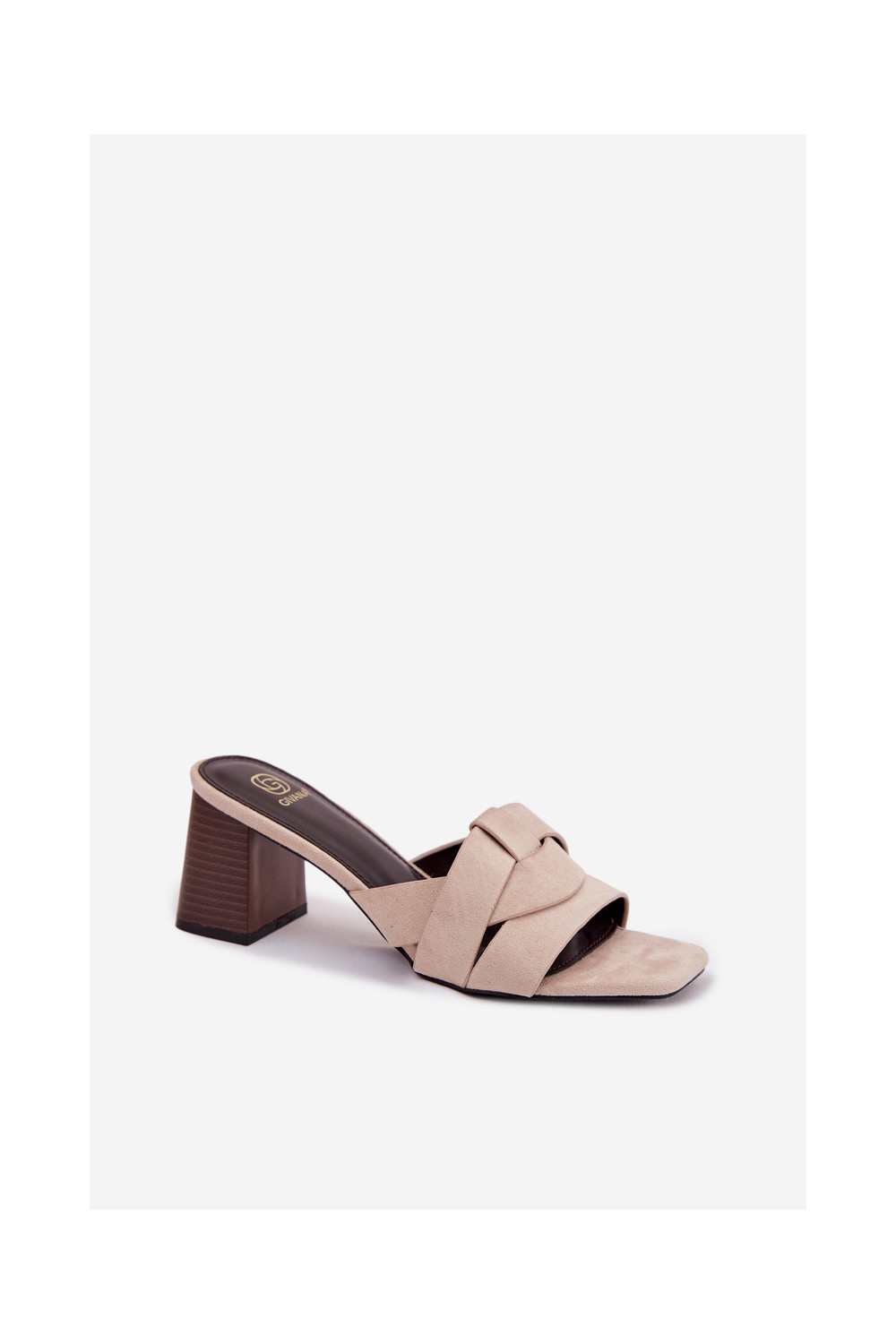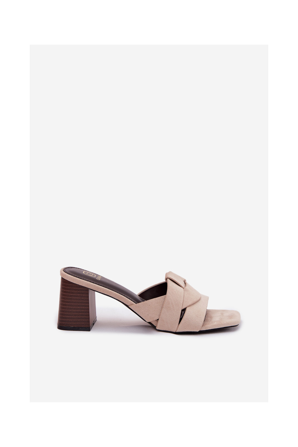 Moteriškos šlepetės su kulniukais su juostelėmis iš eko zomšosoĮe smėlio spalvos Corivelle