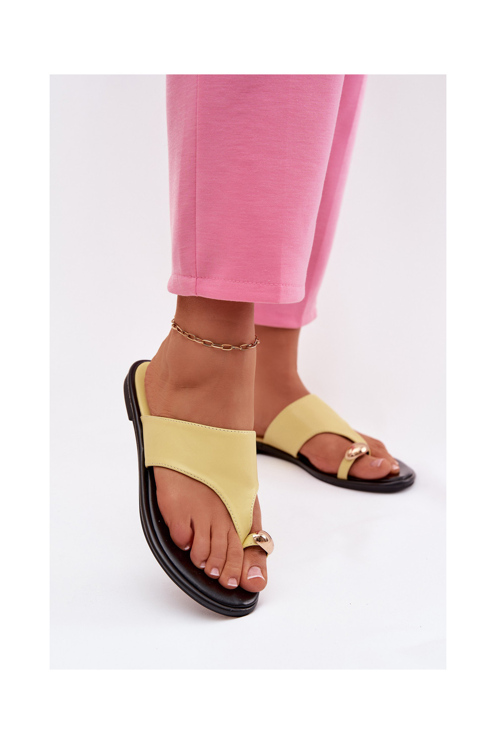Moteriškos plokščiapadės šlepetės iš dirbtinės odos su aukso spalvos detalėmis geltonos spalvos Lavessa