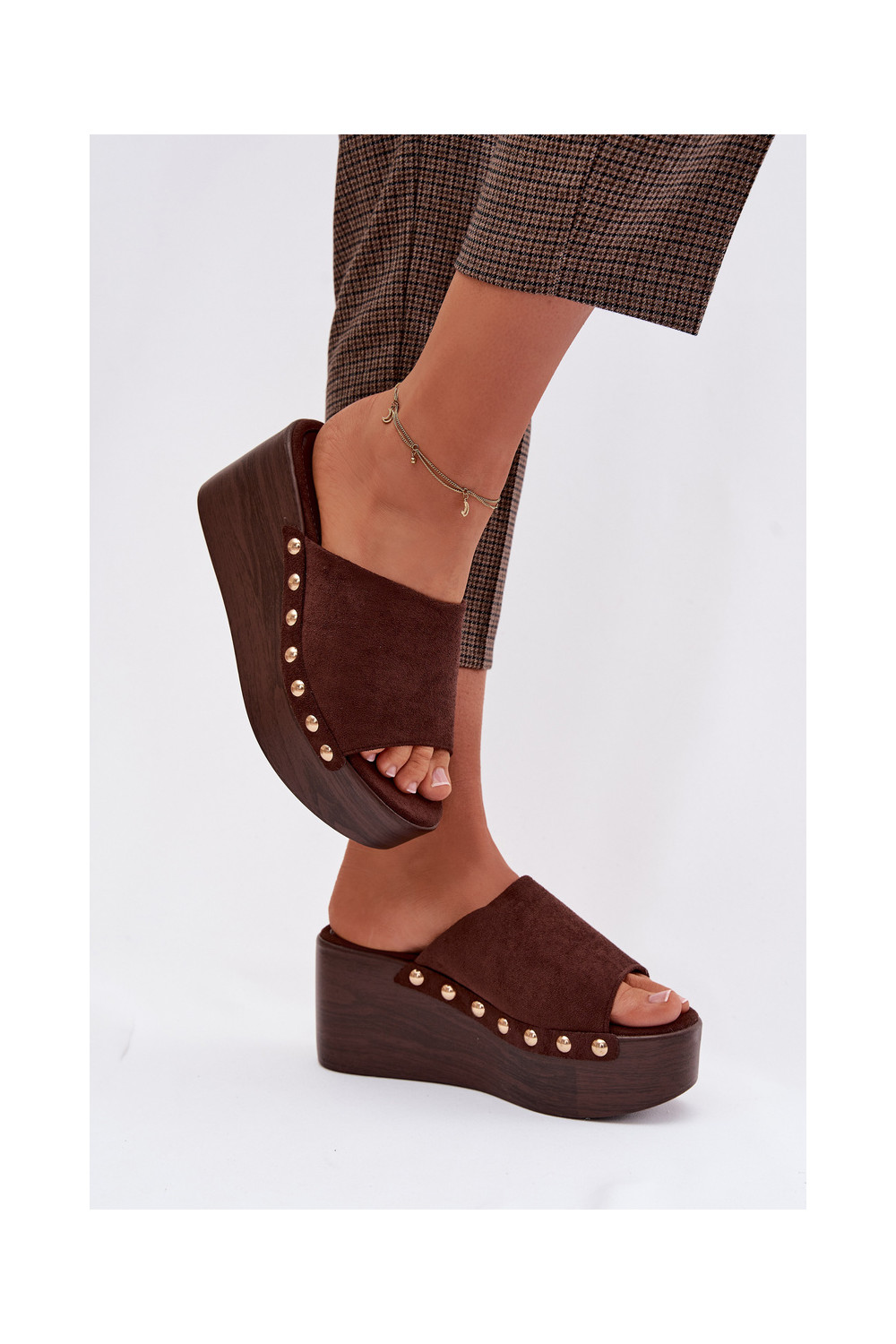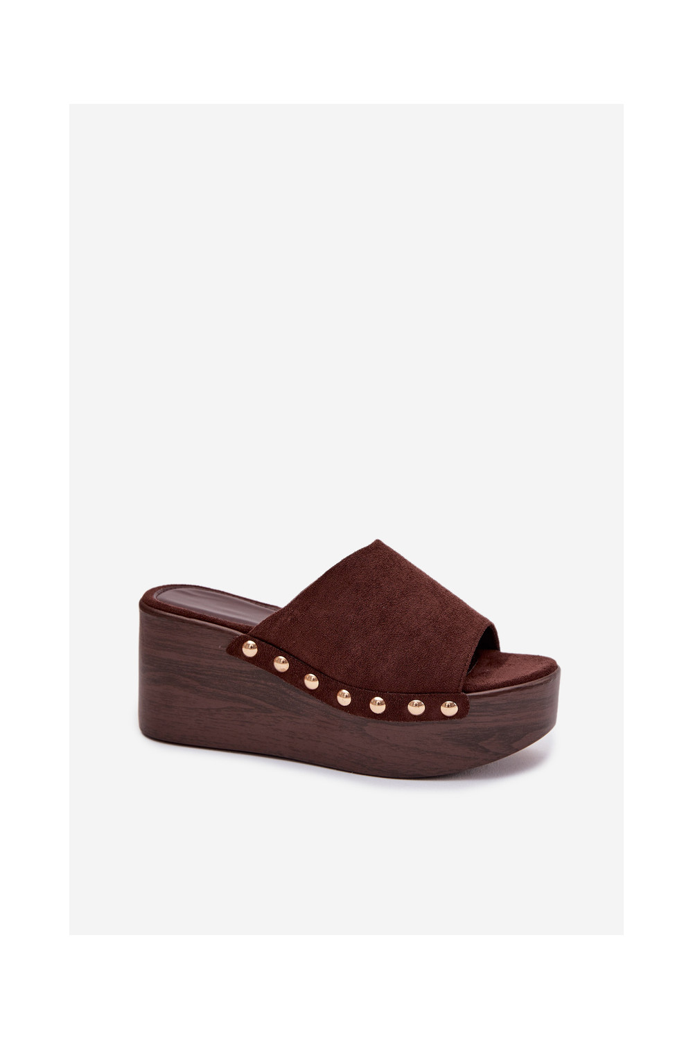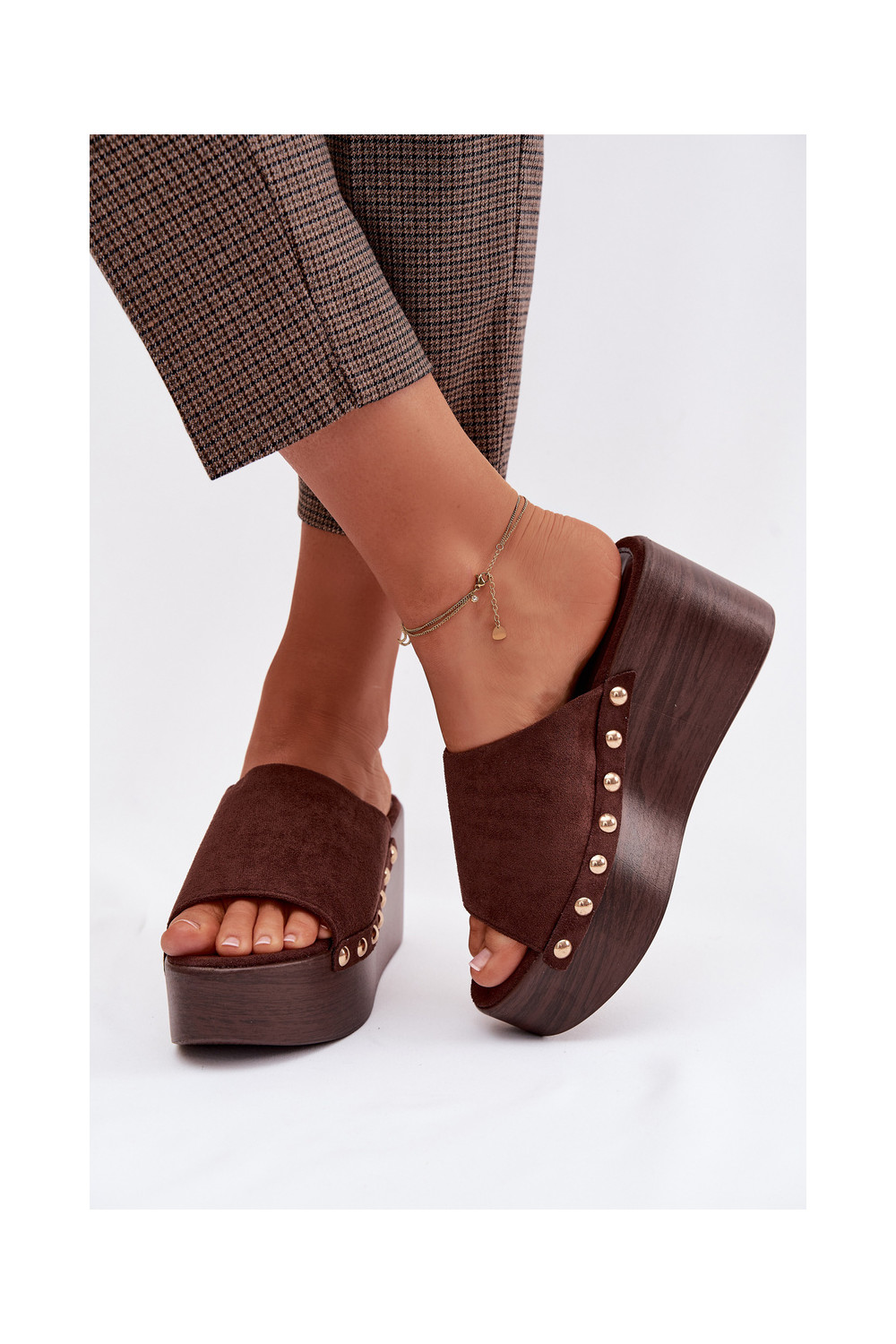 Moteriškos šlepetės Ant platformos Ze aukso spalvosmi Smeigės iš eko zomšosoĮe rudos spalvos Helivina