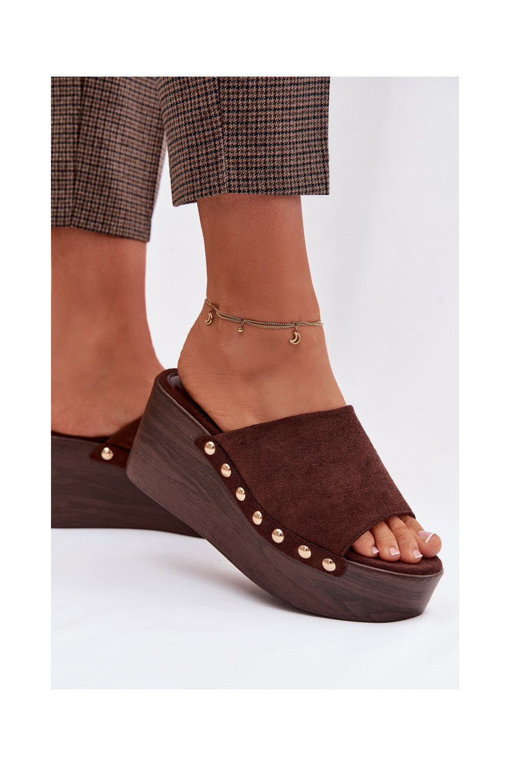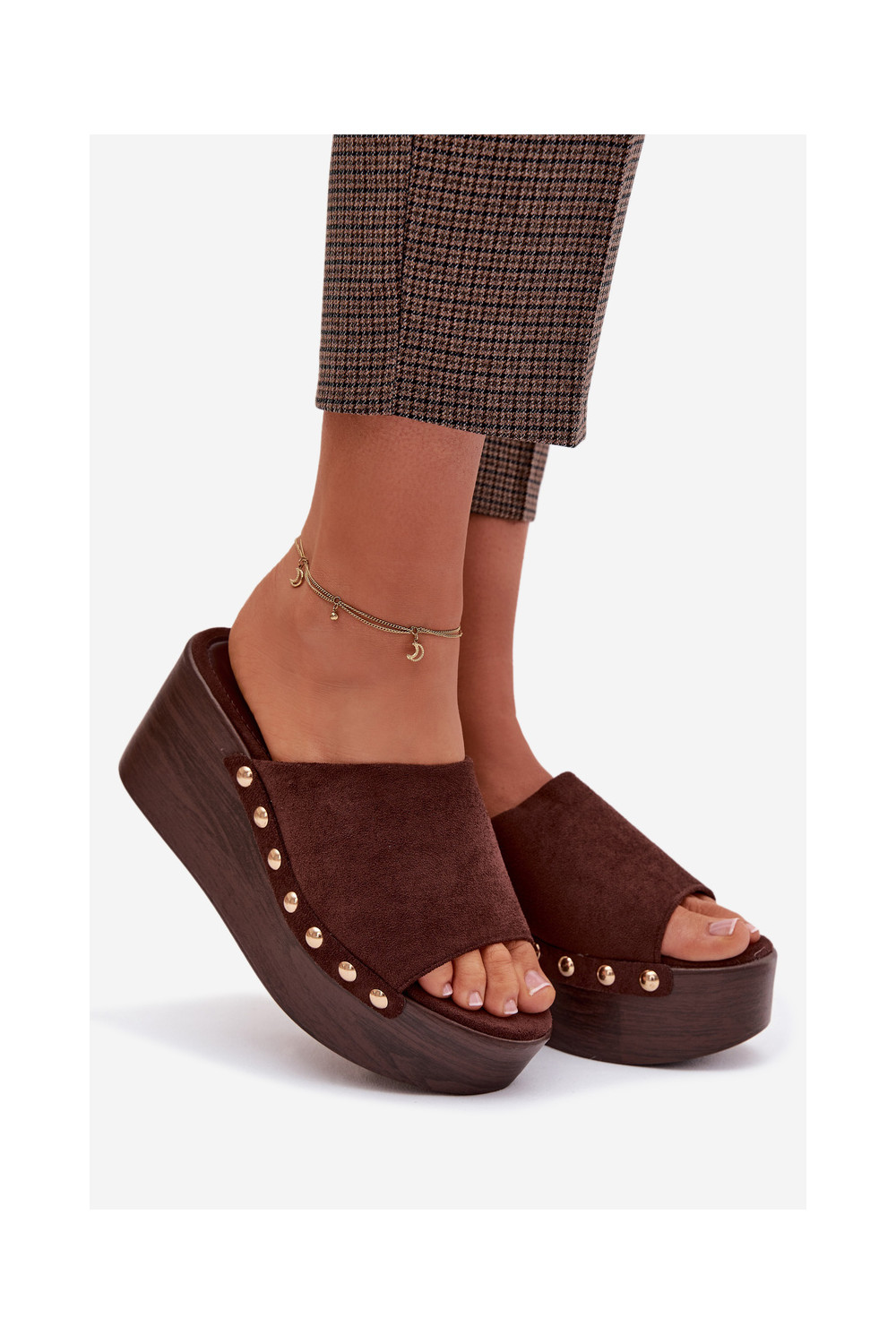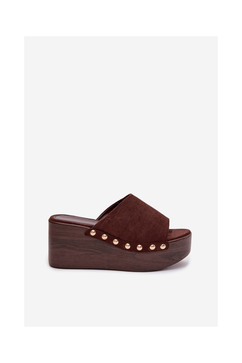 Moteriškos šlepetės Ant platformos Ze aukso spalvosmi Smeigės iš eko zomšosoĮe rudos spalvos Helivina