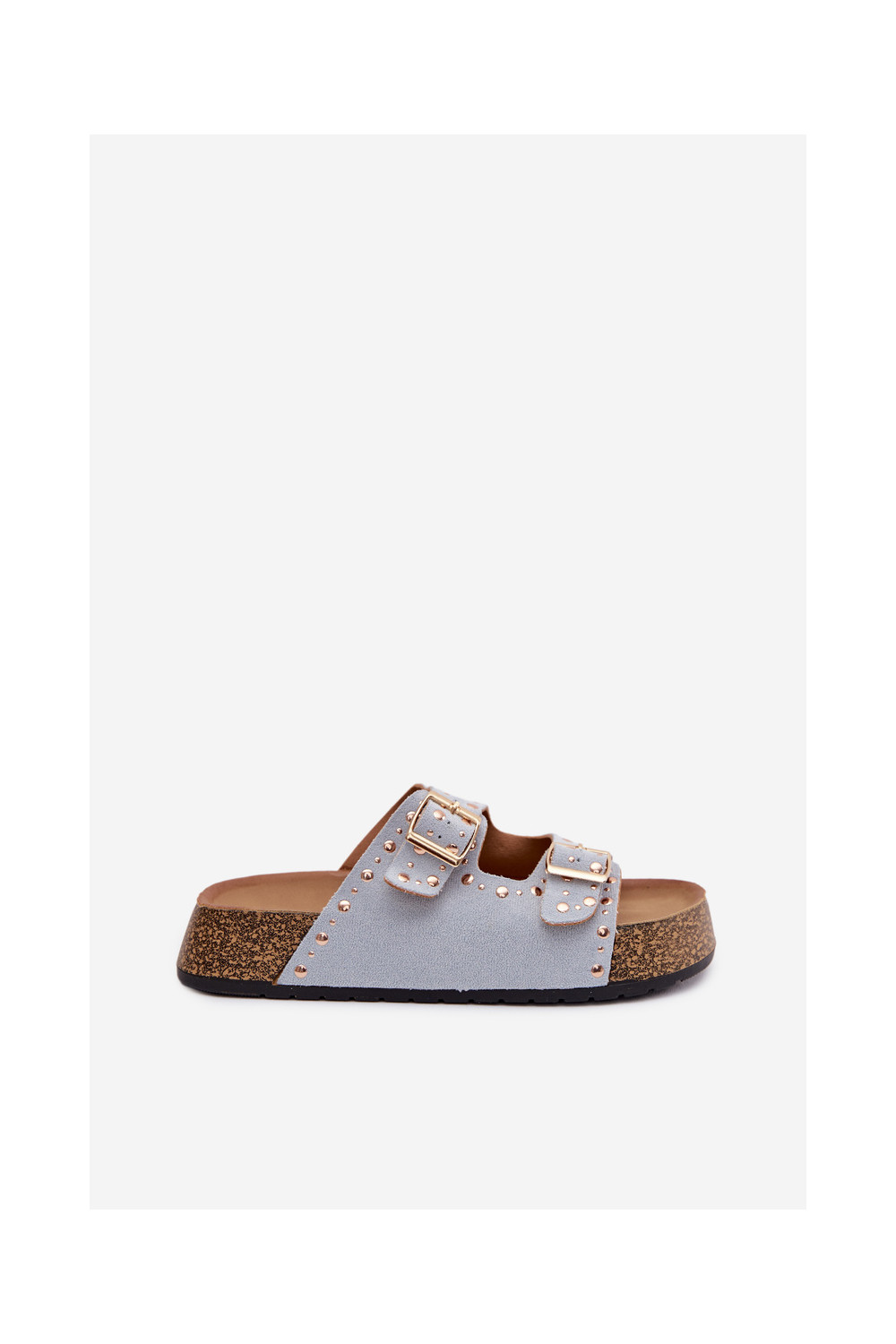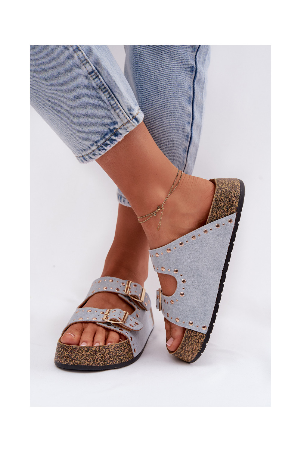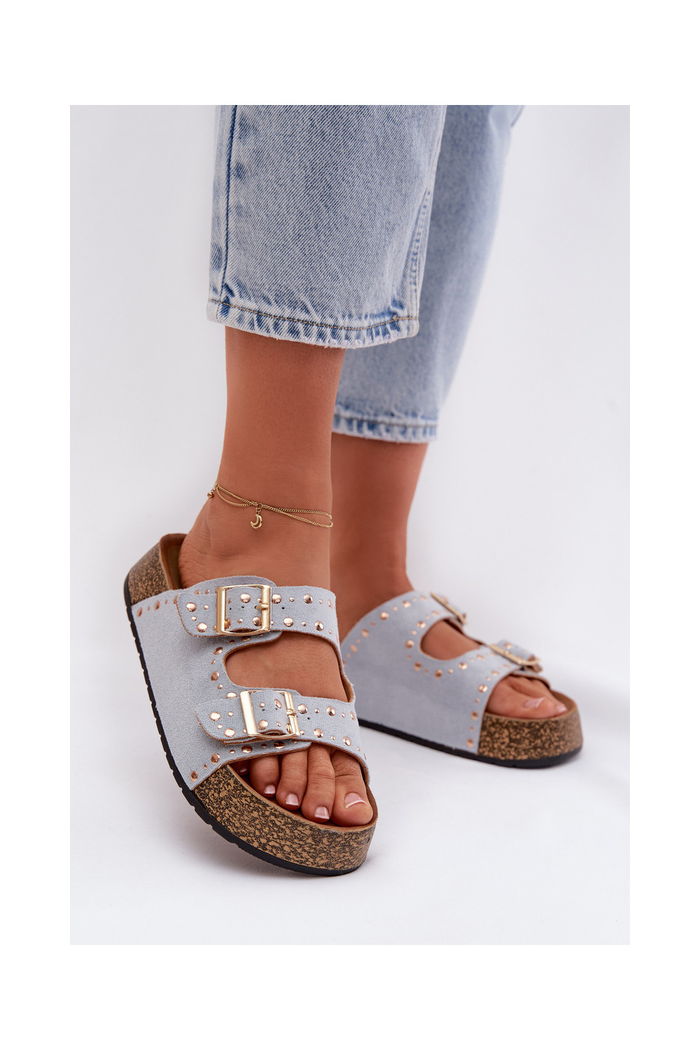 Moteriškos šlepetės Ze aukso spalvosmi su sagtimismi Ir smeigės šviesiai mėlynos spalvos Tervina