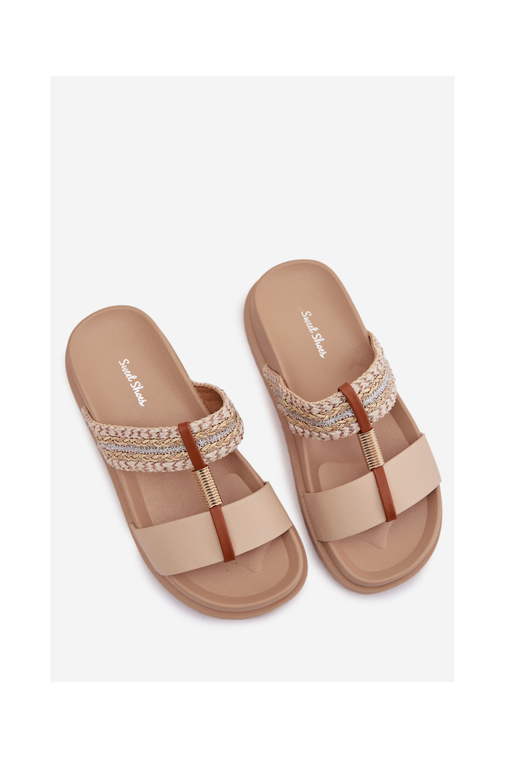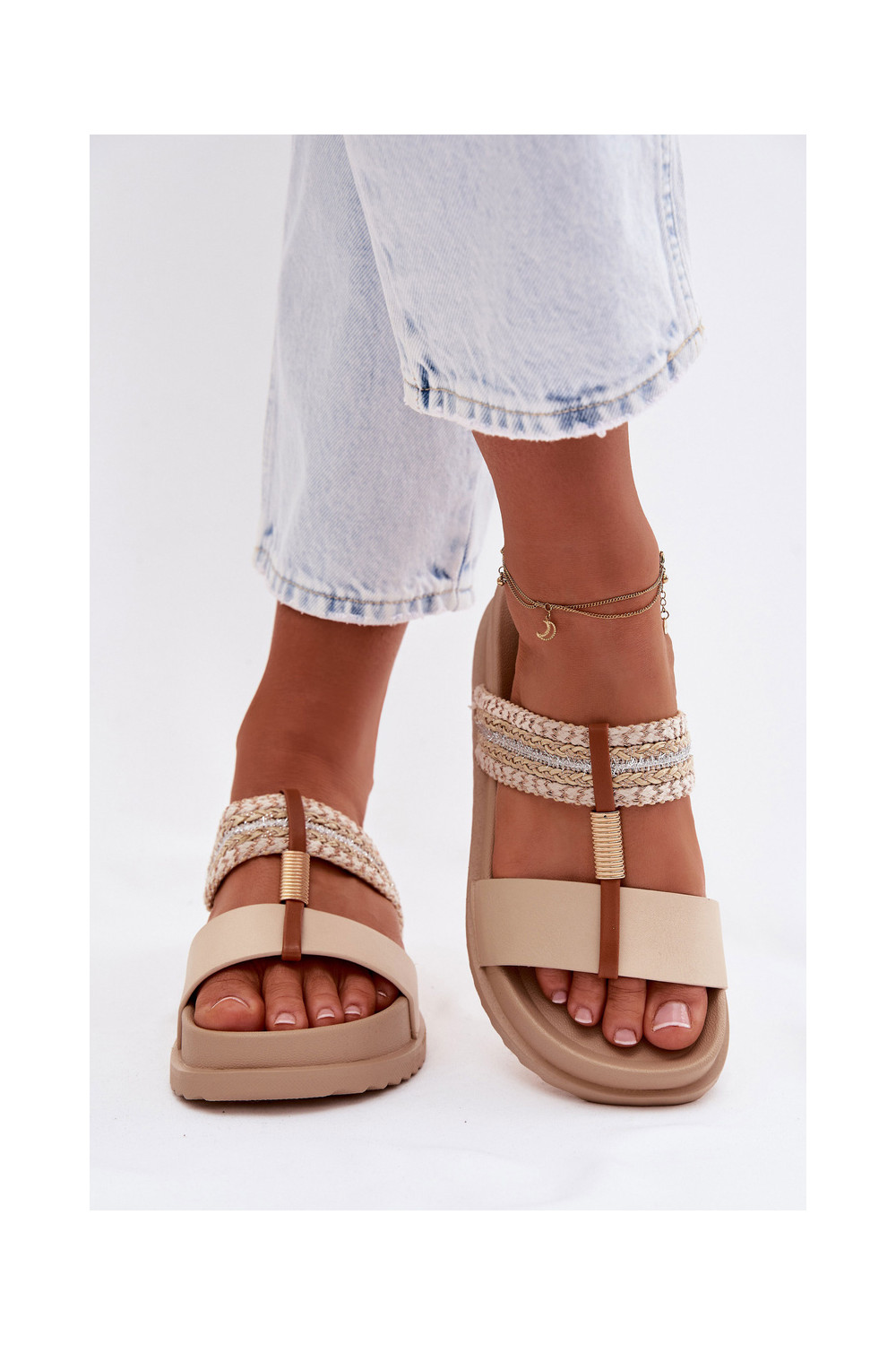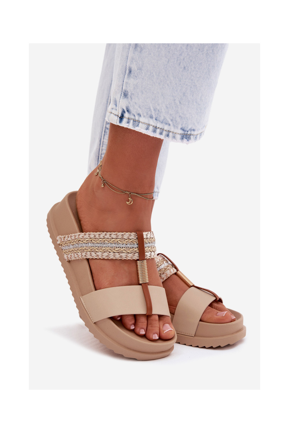 Moteriškos šlepetės su platforma su juostelėmis I aukso spalvosm Detalem smėlio spalvos Tahlia