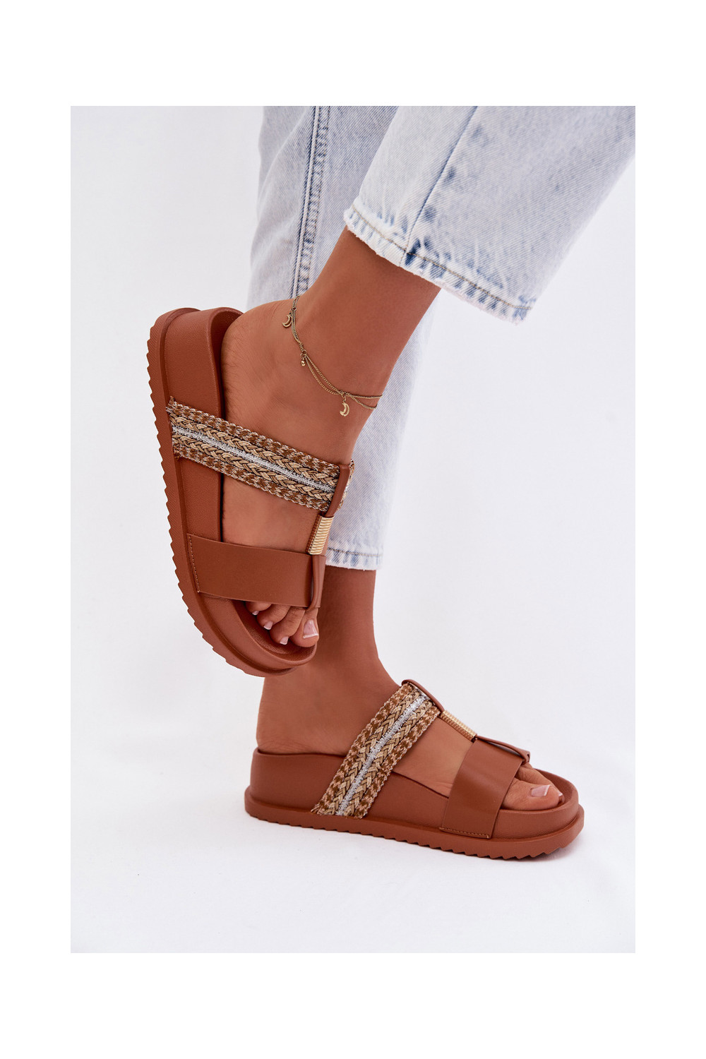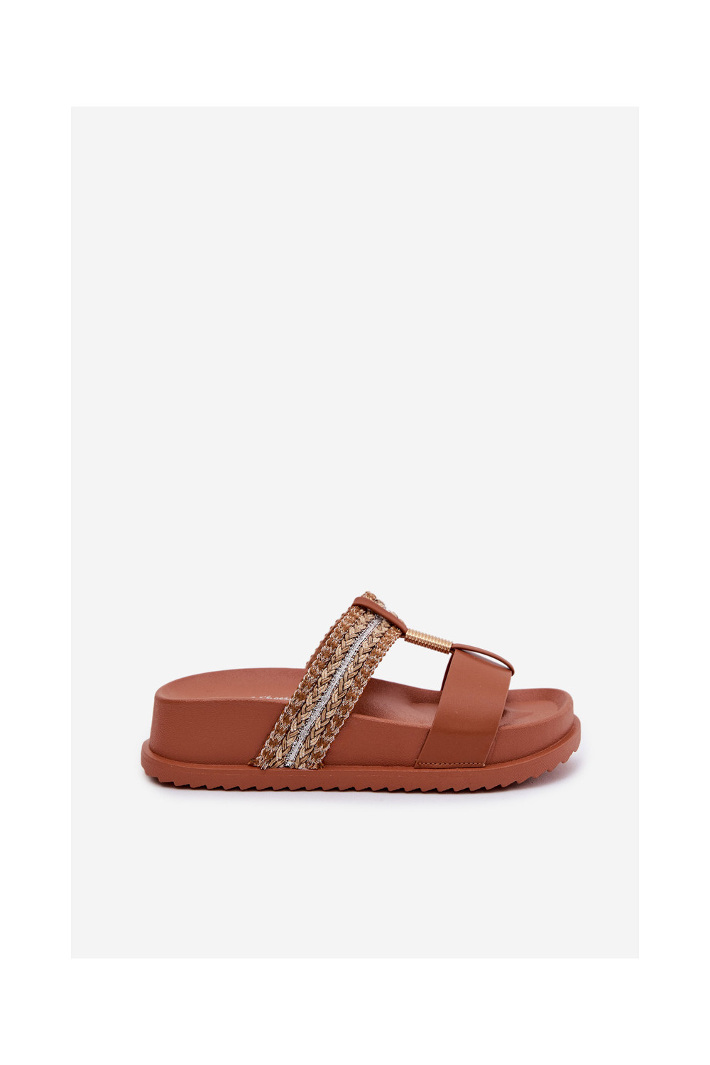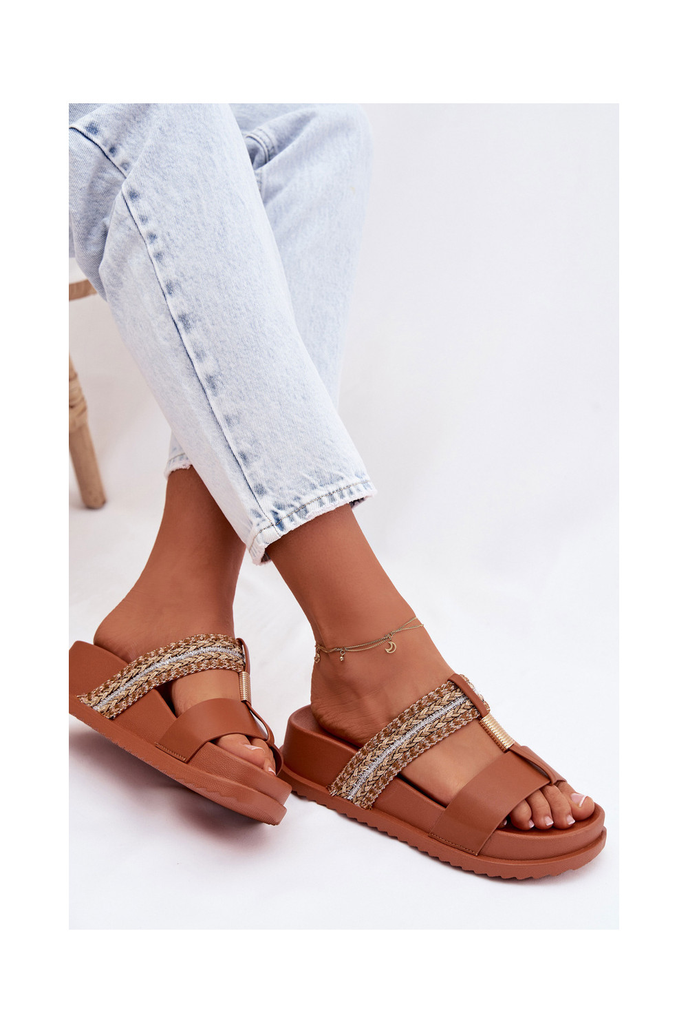 Moteriškos šlepetės su platforma su juostelėmis I aukso spalvosm Detalem rudos spalvos Tahlia
