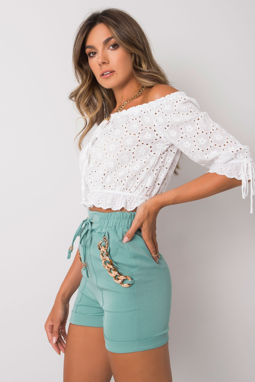 Turkio spalvos šortai su flanery grandinėmis.