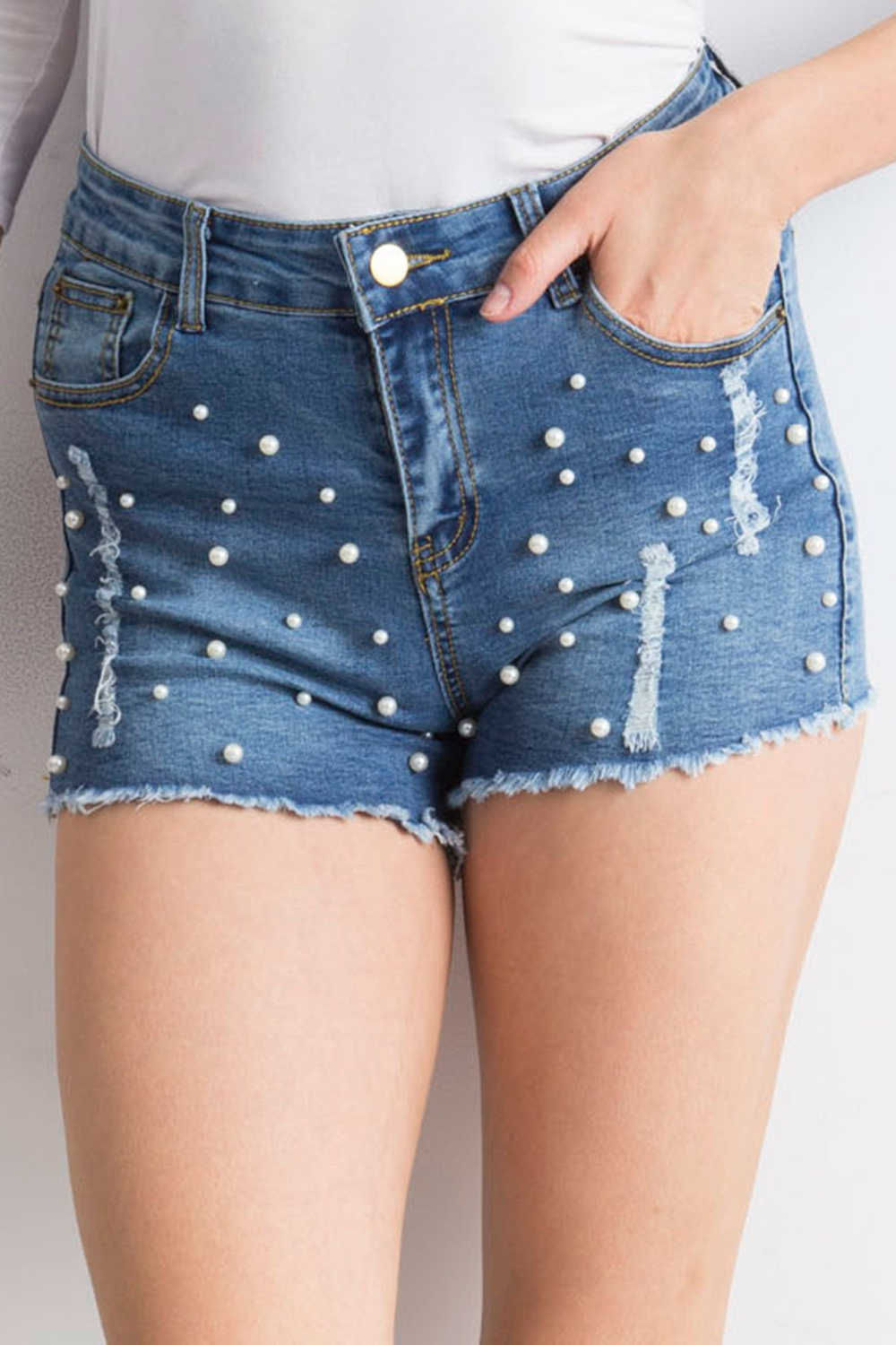 Mėlyni džinsiniai šortai su ašaromis ir perlais .