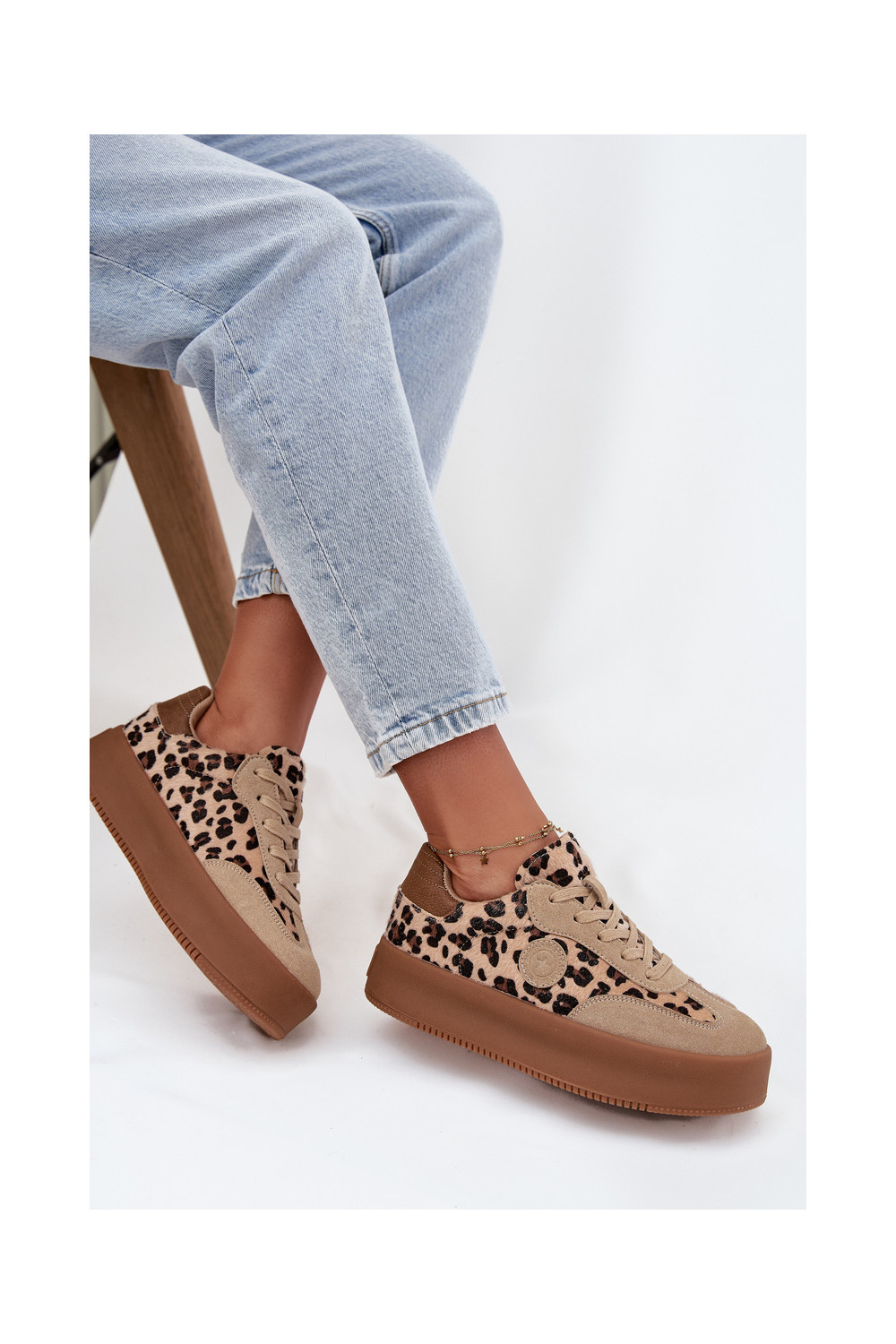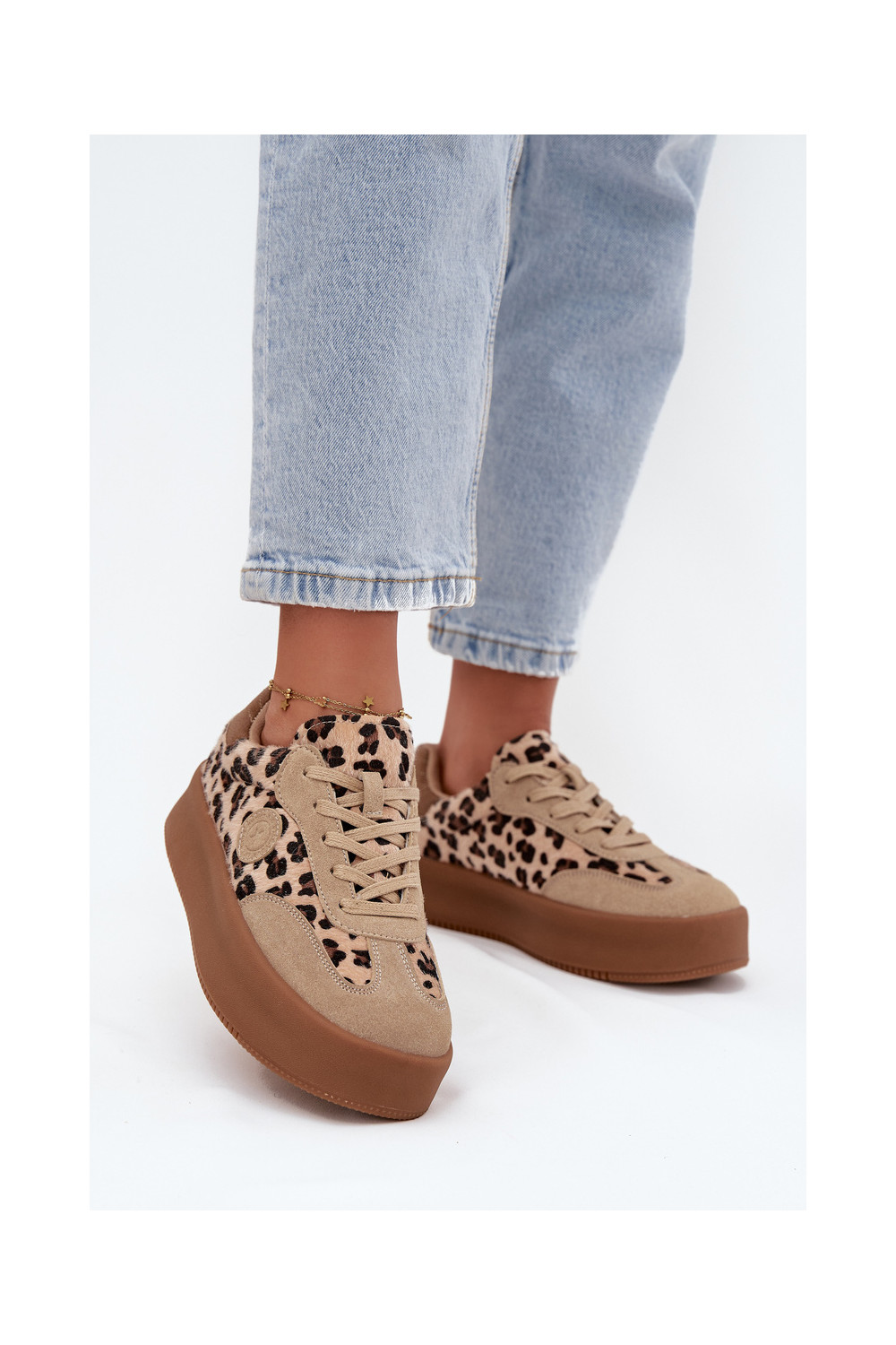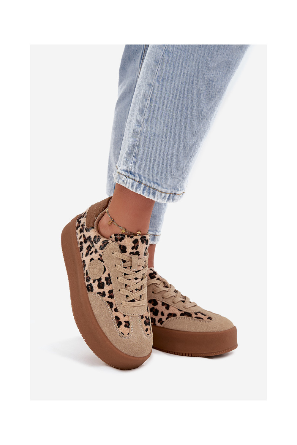 Sportbačių modelio bateliai moteriški su platforma, su leopardo kailio raštais Big Star SS274763 smėlio spalvos