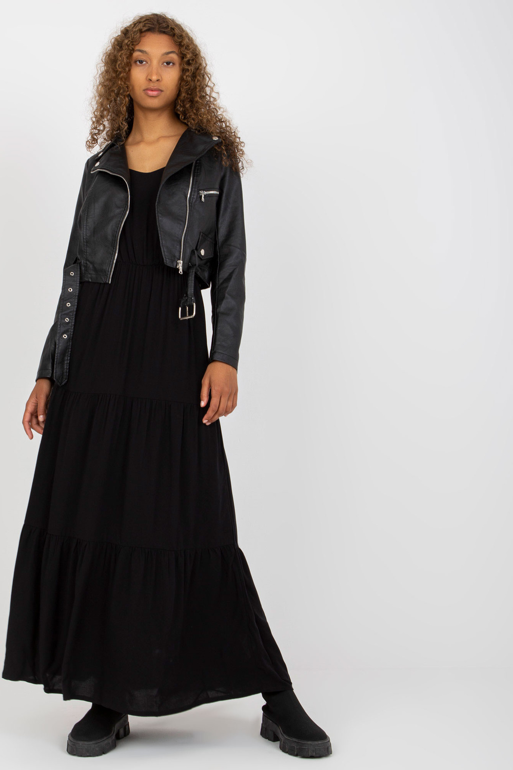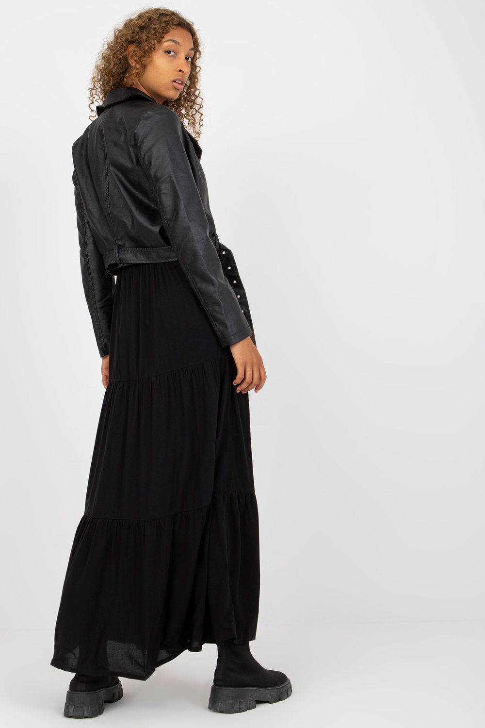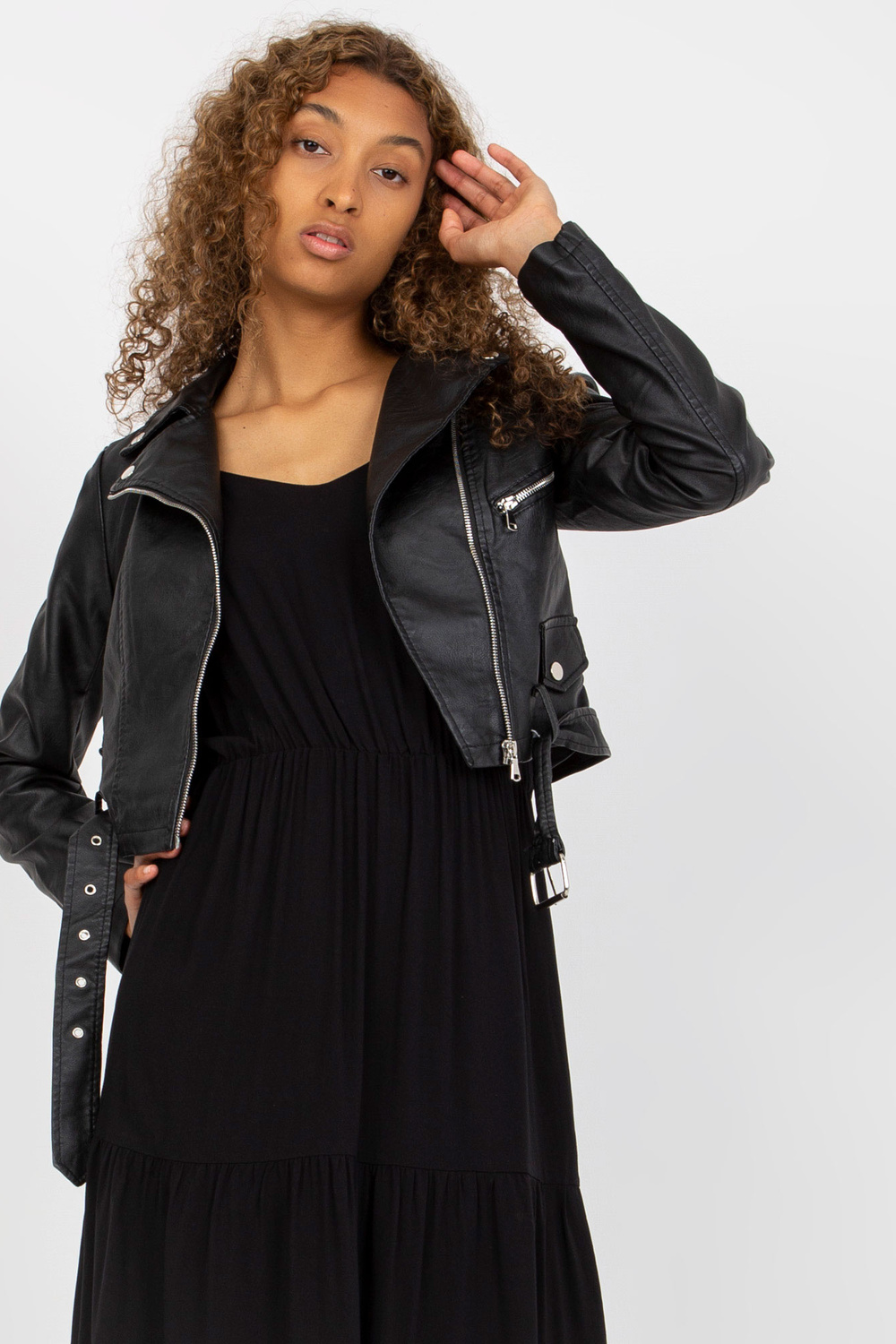 Juoda trumpa ramonezės striukė su diržu .
