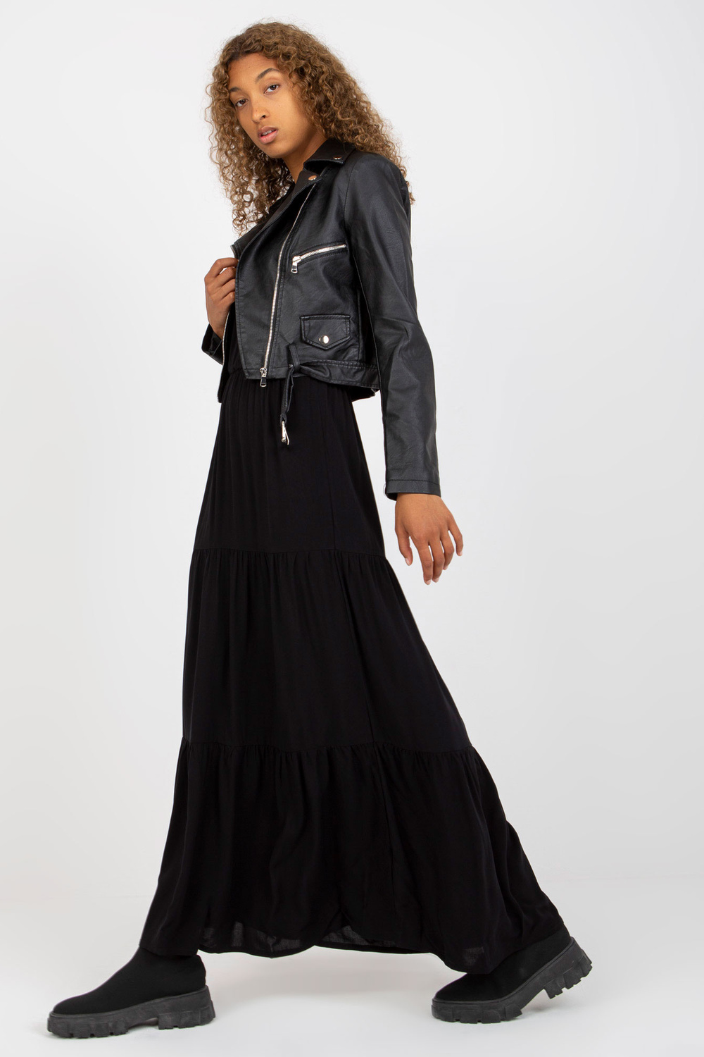 Modelis dėvi S dydį Modelio matmenys: ūgis 178 cm, krūtinė 82 cm, juosmuo 61 cm, klubai 88 cm.