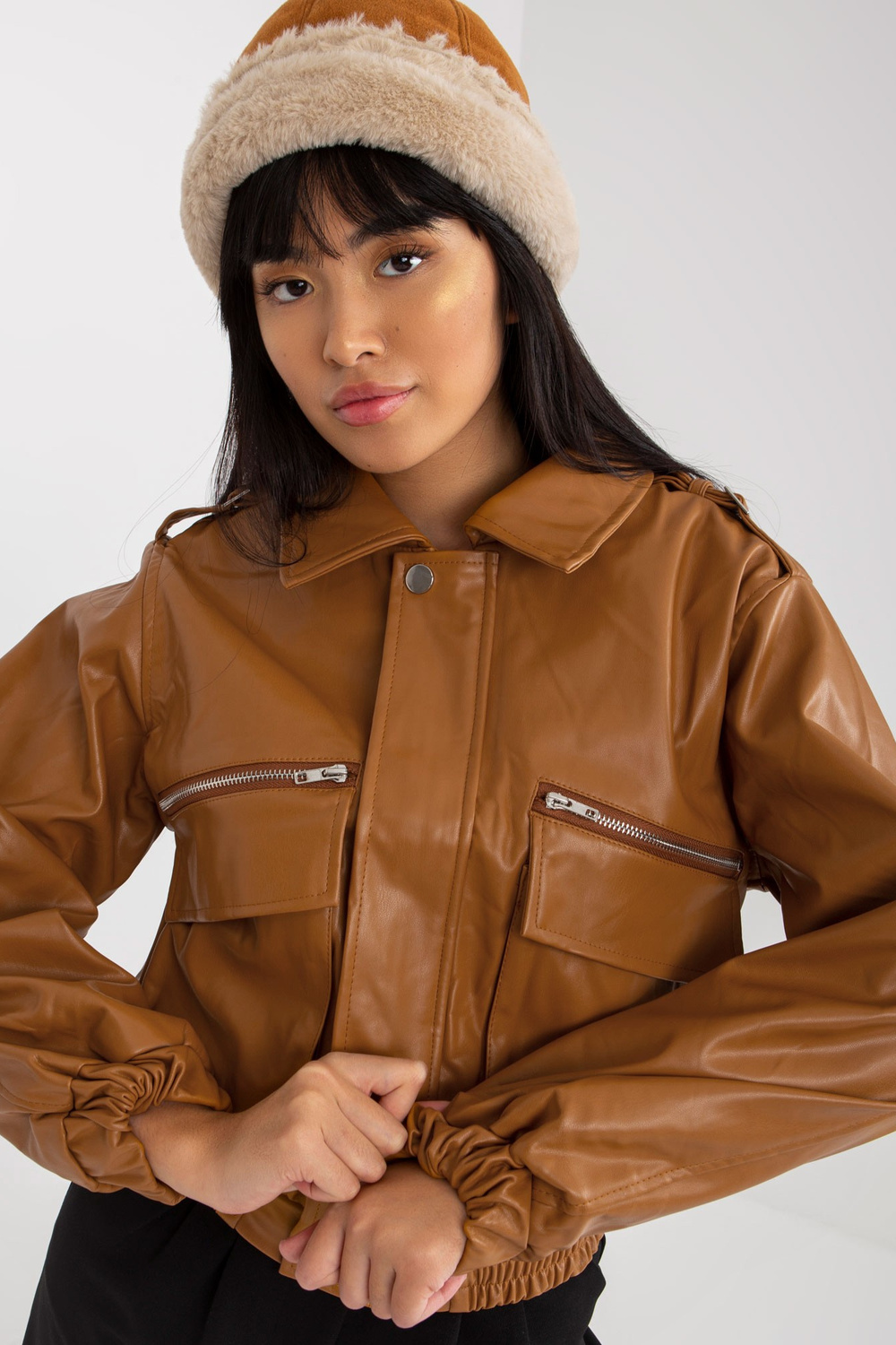 Trumpa kupranugario striukė iš ekologiškos odos su kišenėmis.