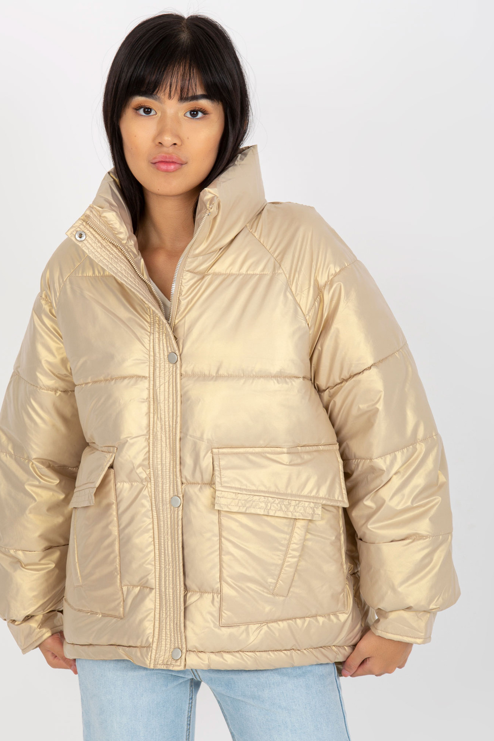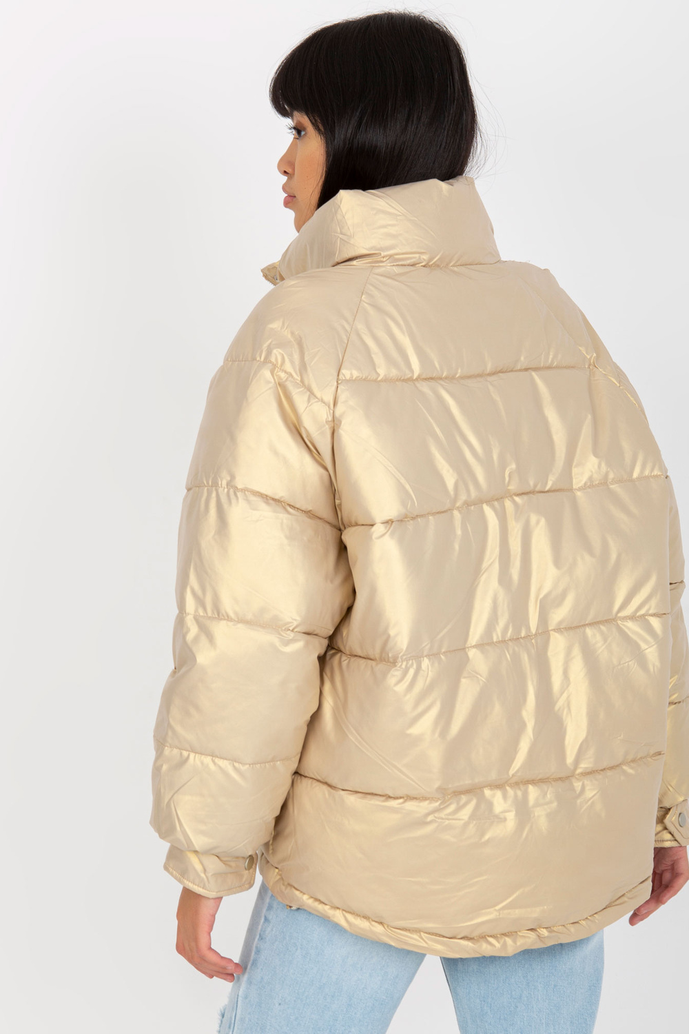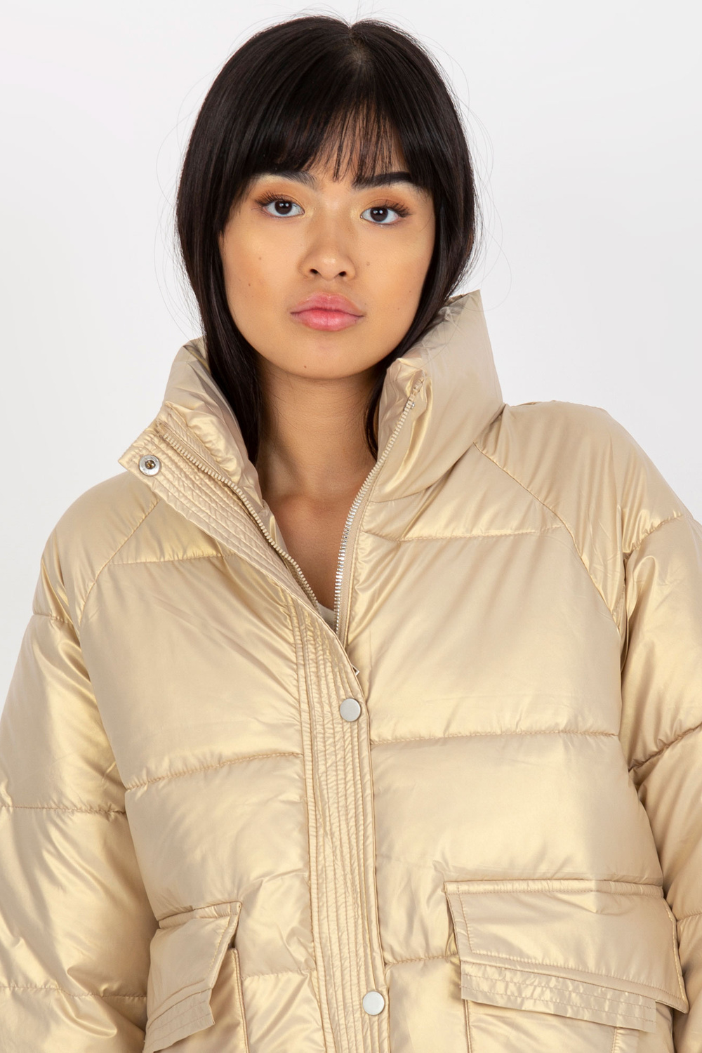 Auksinė pūkinė dygsniuota žieminė striukė be gobtuvo.