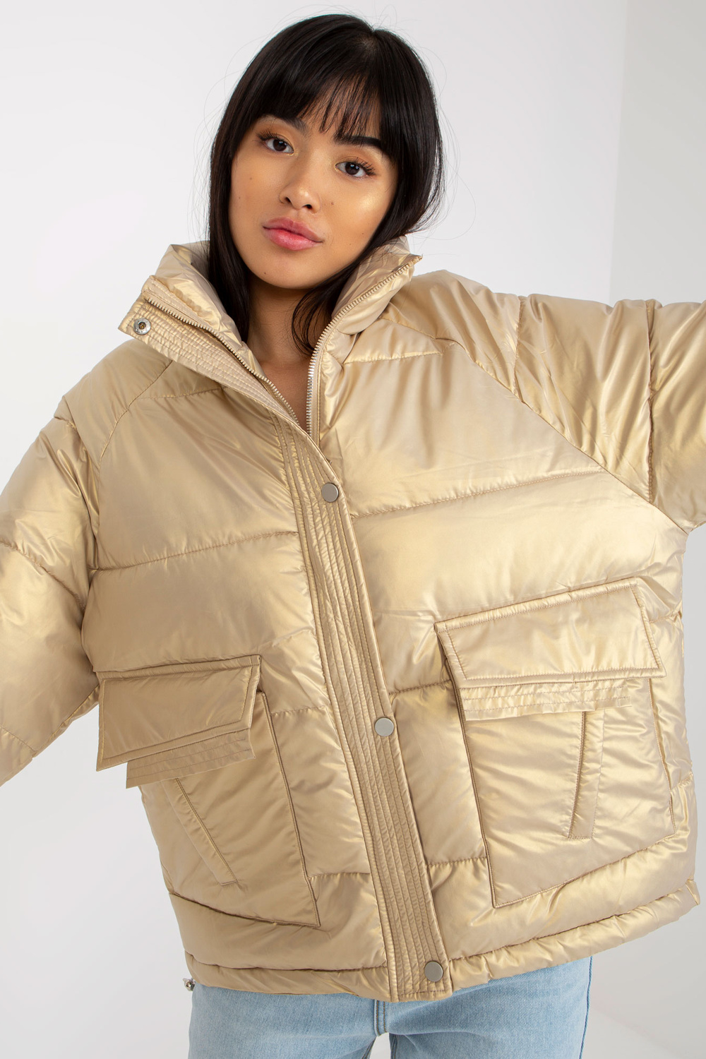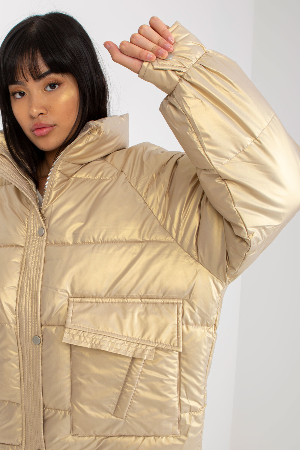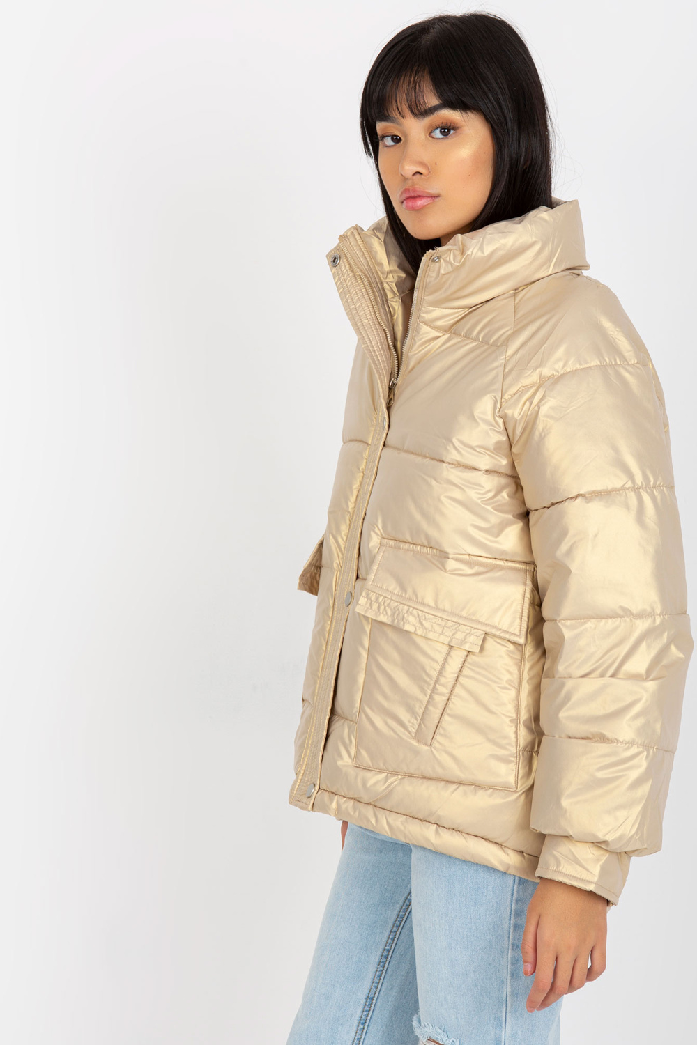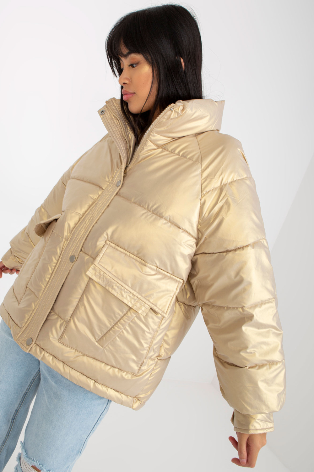 Auksinė pūkinė dygsniuota žieminė striukė be gobtuvo.