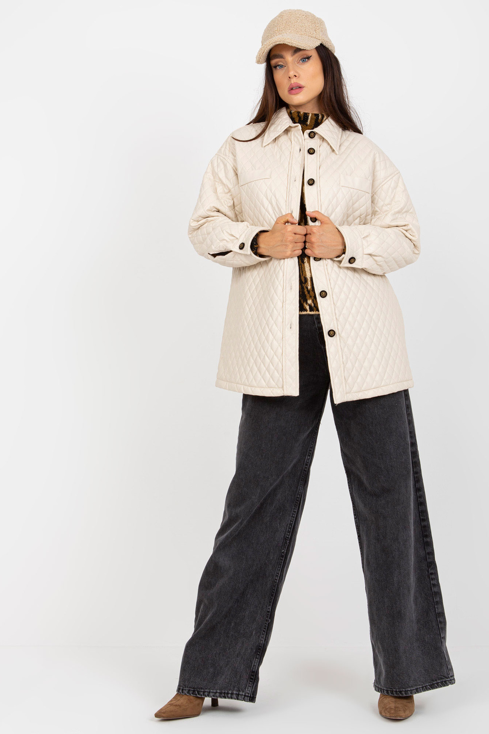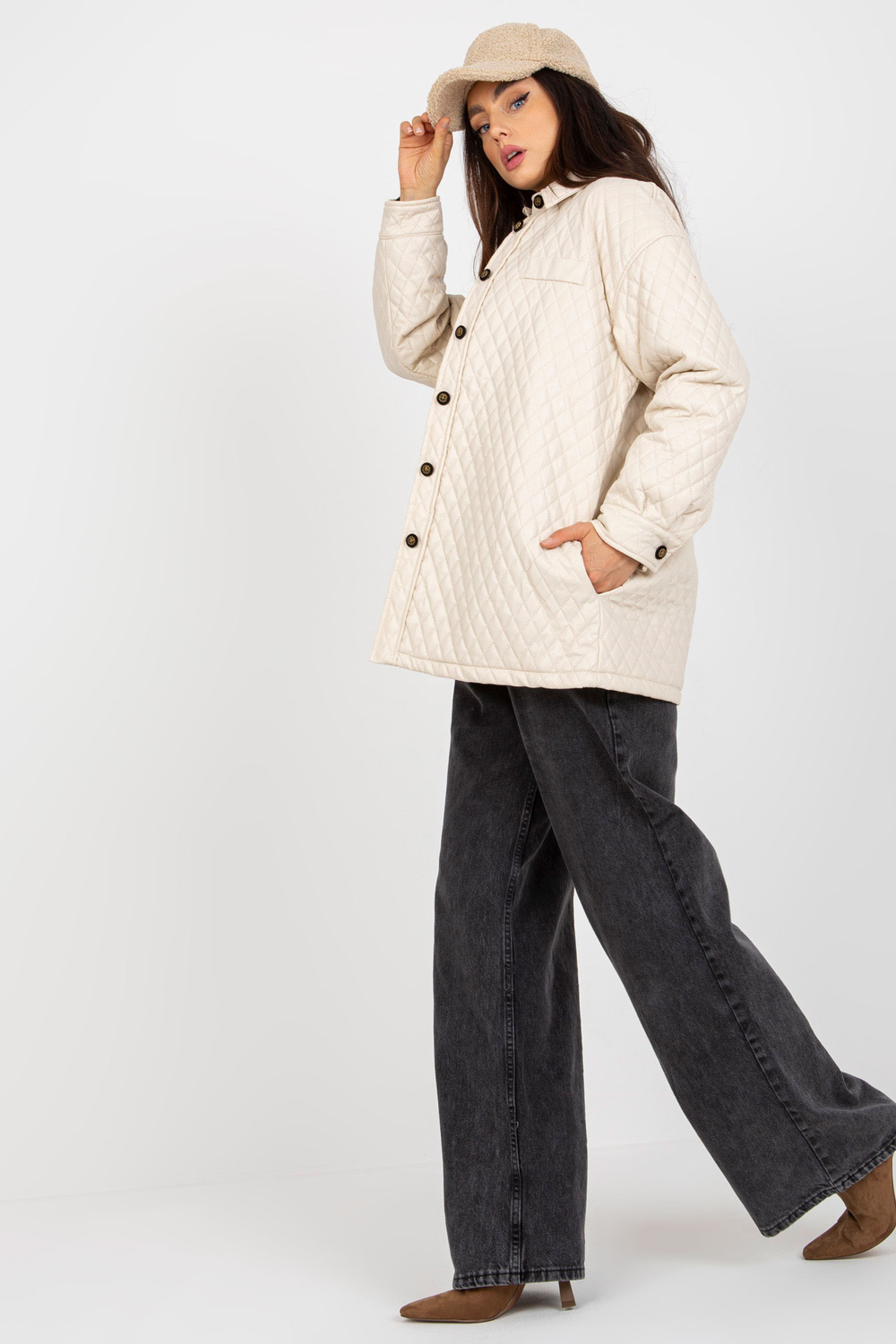 Šviesiai smėlio spalvos pereinamoji dygsniuota striukė iš ekologiškos odos. Prekės kodas: EM-KR-MC379.40P Dominuojantis raštas: lygus Stilius: laisvalaikis: laisvalaikis, į miestą, pasivaikščioti, į darbą Modelis dėvi S/M dydį. Modelio matmenys: aukštis 171 cm, krūtinė