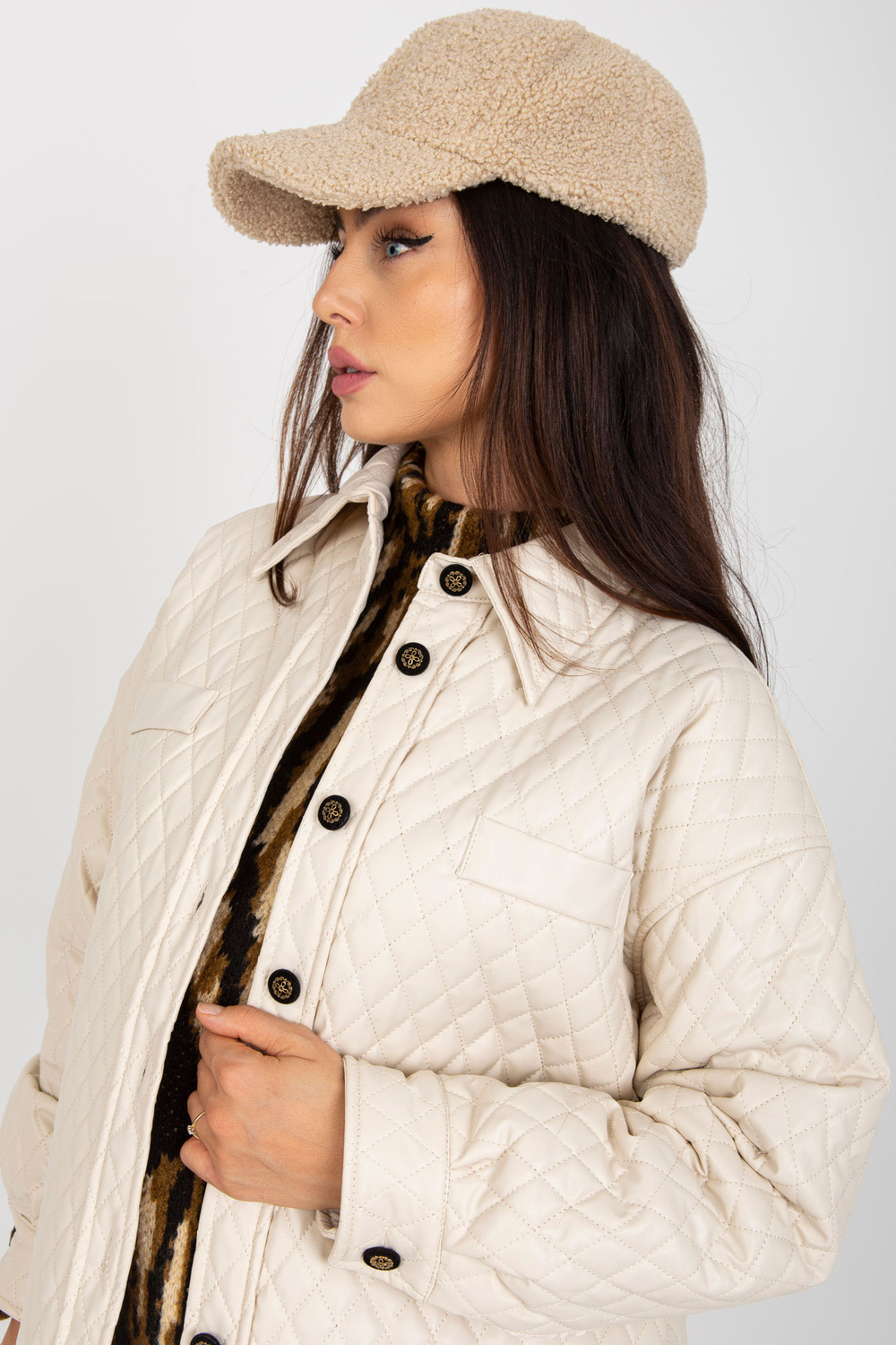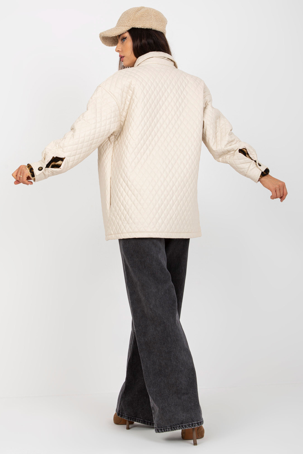 Šviesiai smėlio spalvos pereinamoji dygsniuota striukė iš ekologiškos odos.