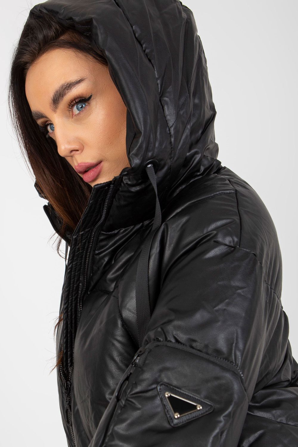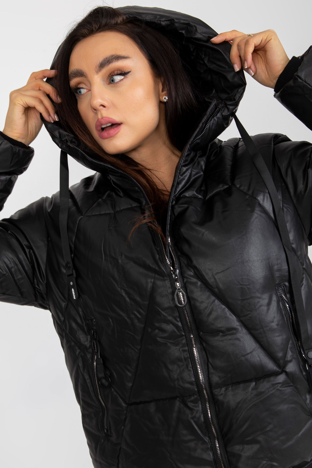 Juoda pūkinė žieminė striukė iš odos.