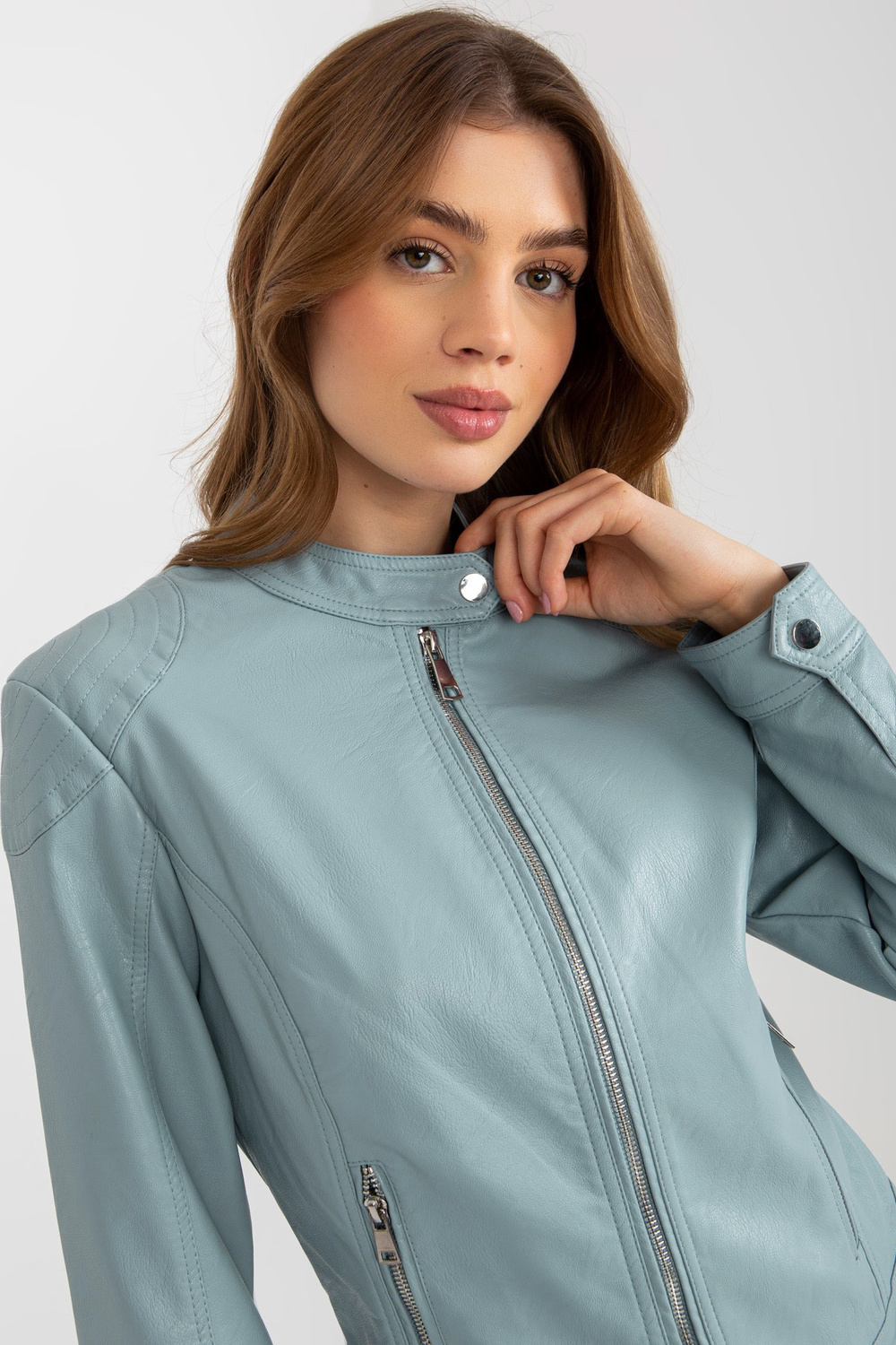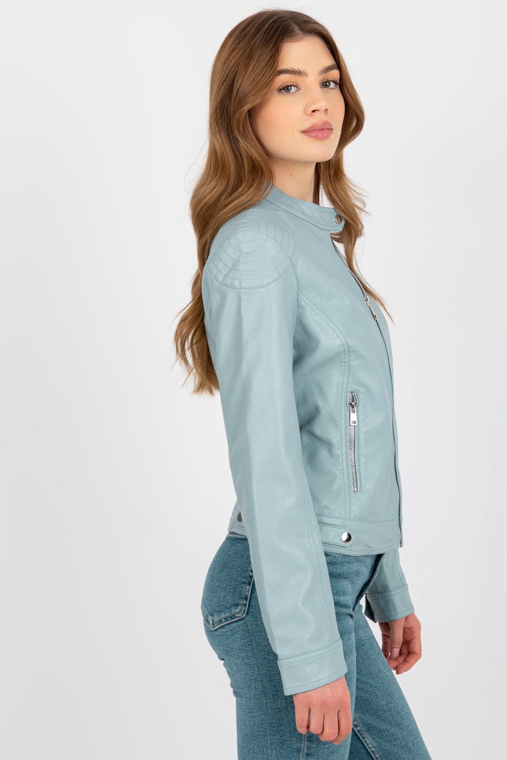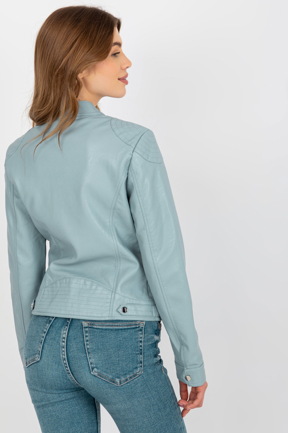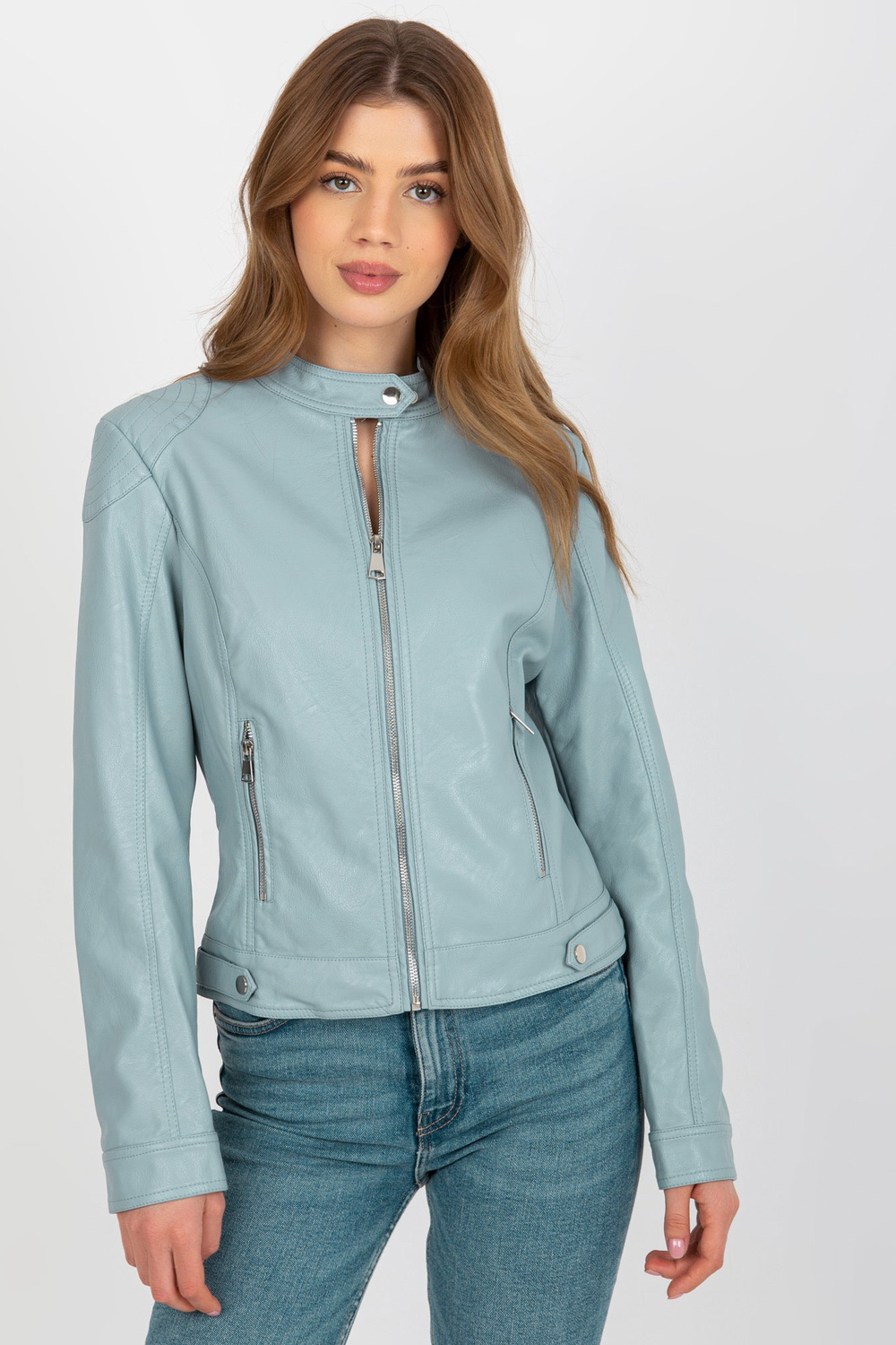 Šviesiai mėlyna dviratininko ekologiškos odos striukė su pamušalu.