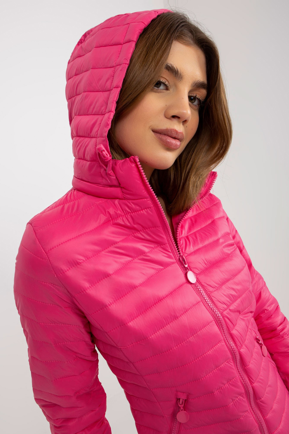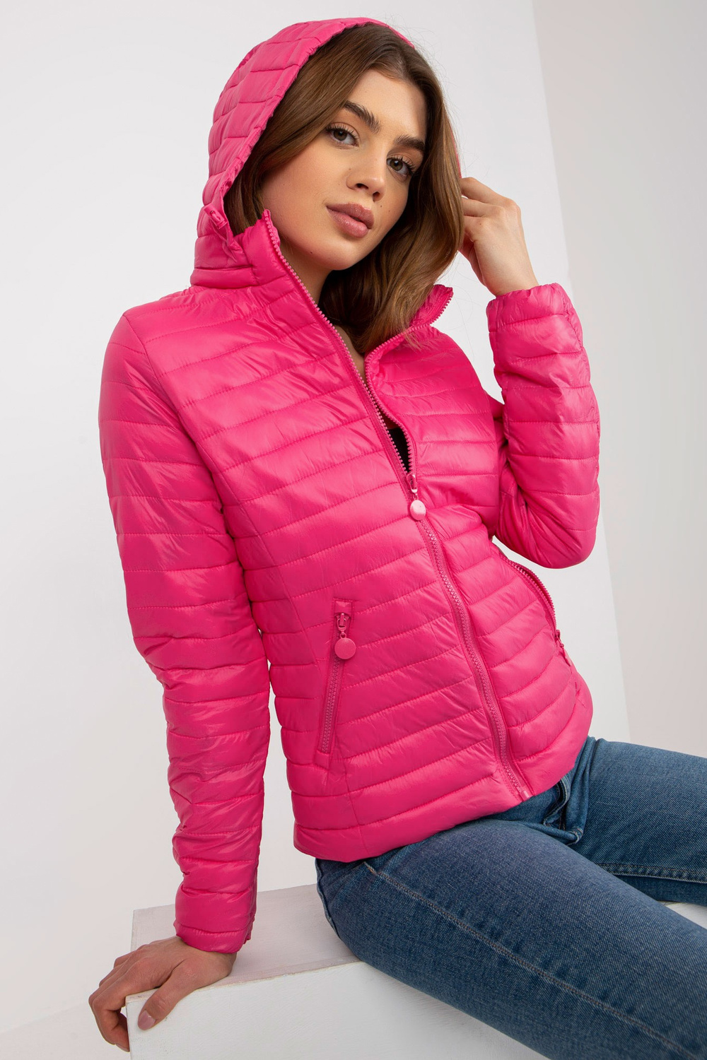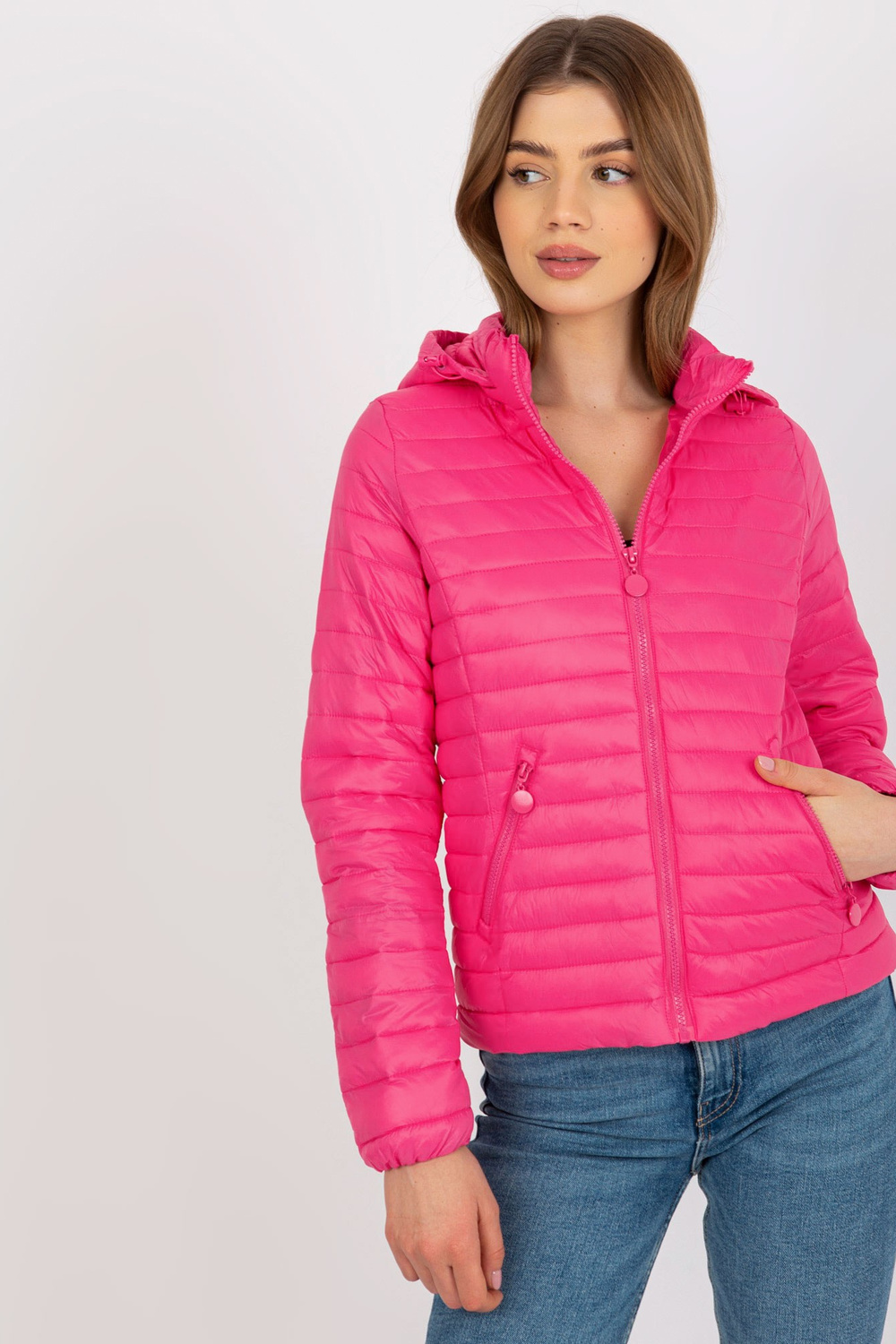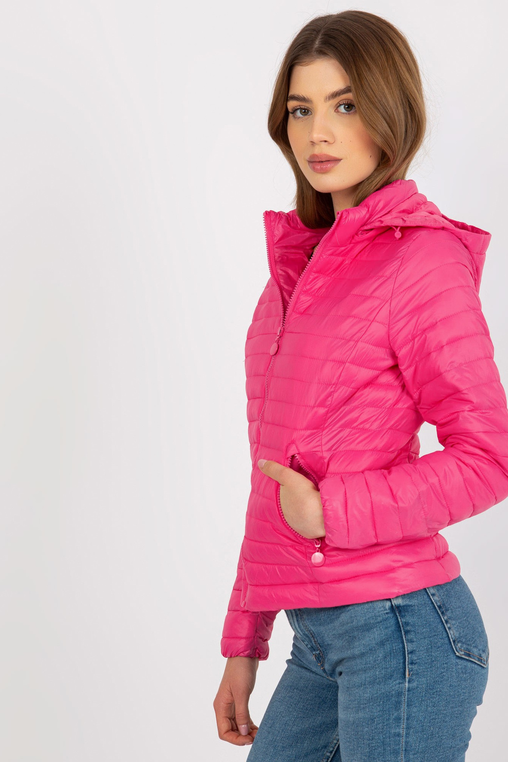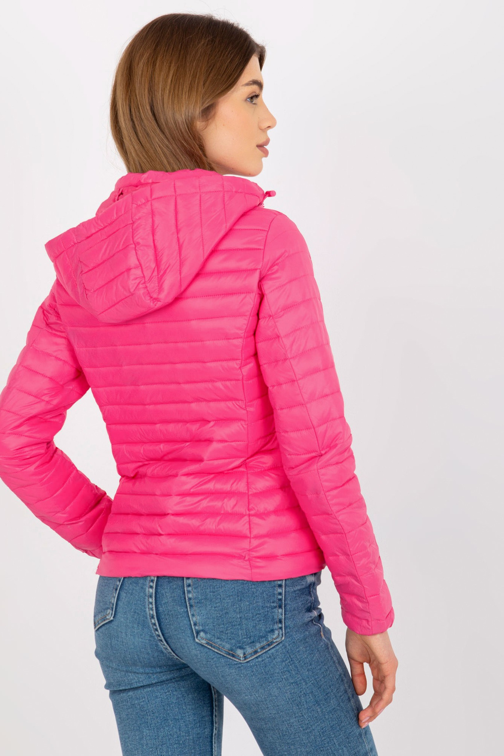 Rožinė pereinamojo laikotarpio dygsniuota striukė su nuimamu gobtuvu.