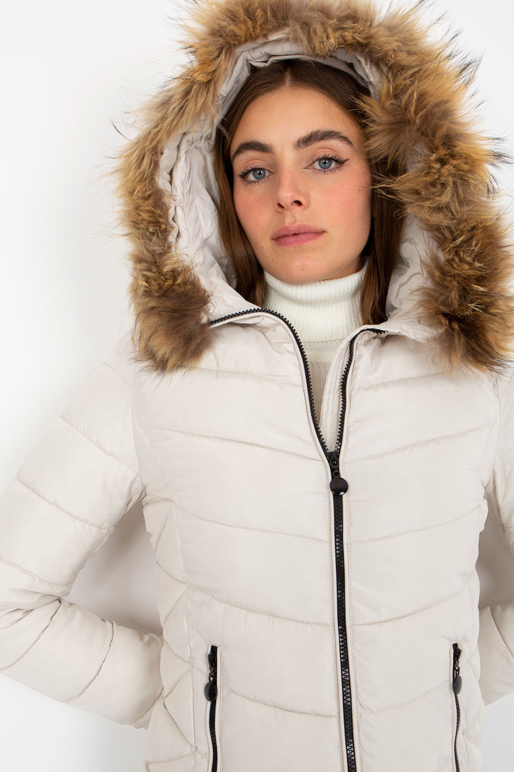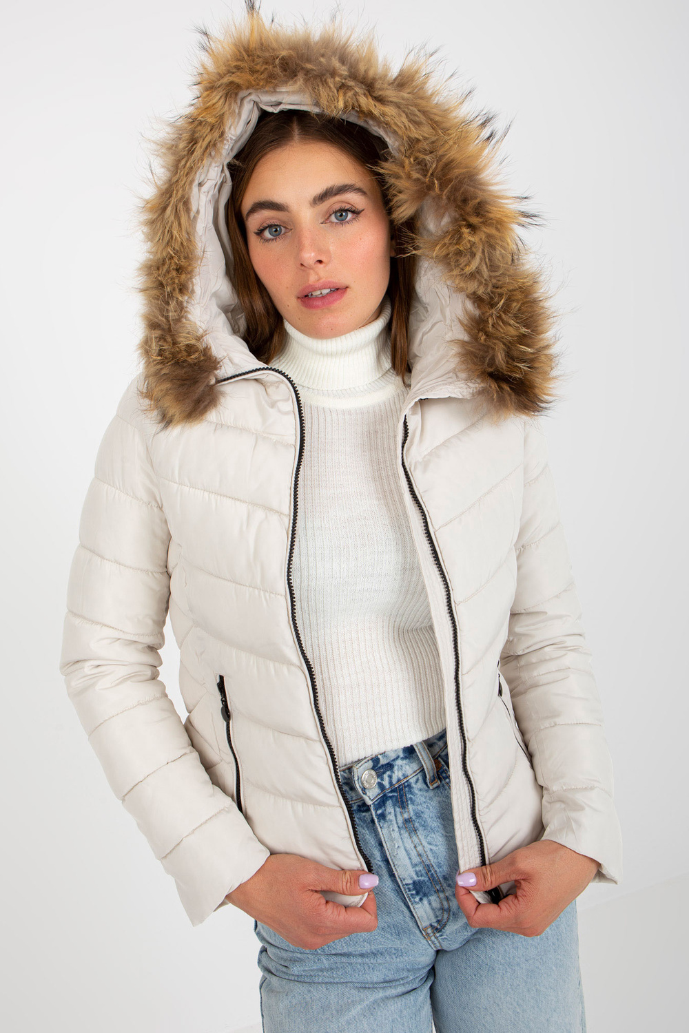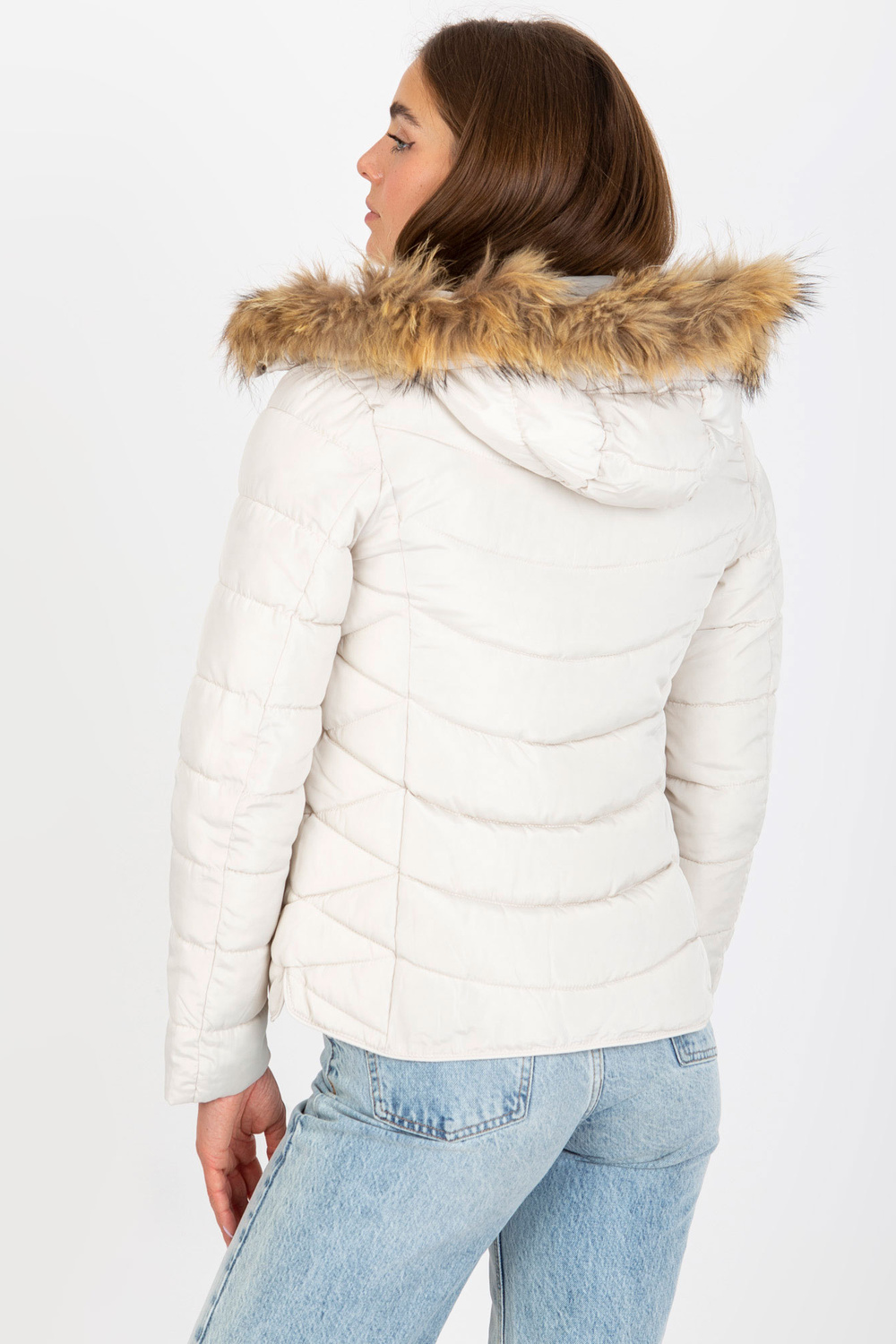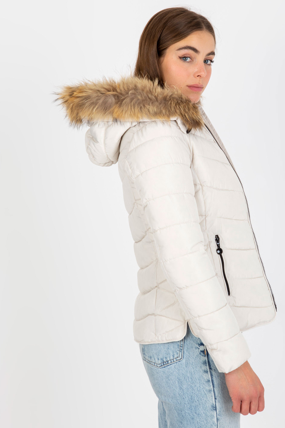 Balta dygsniuota pereinamoji striukė su kailiu ant gobtuvo.