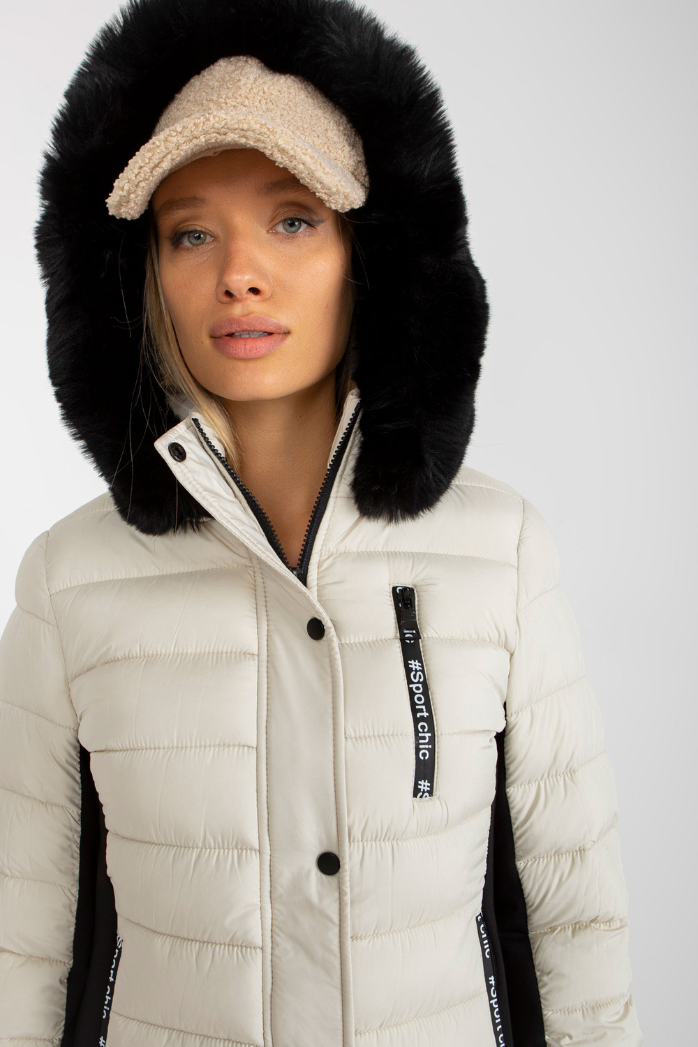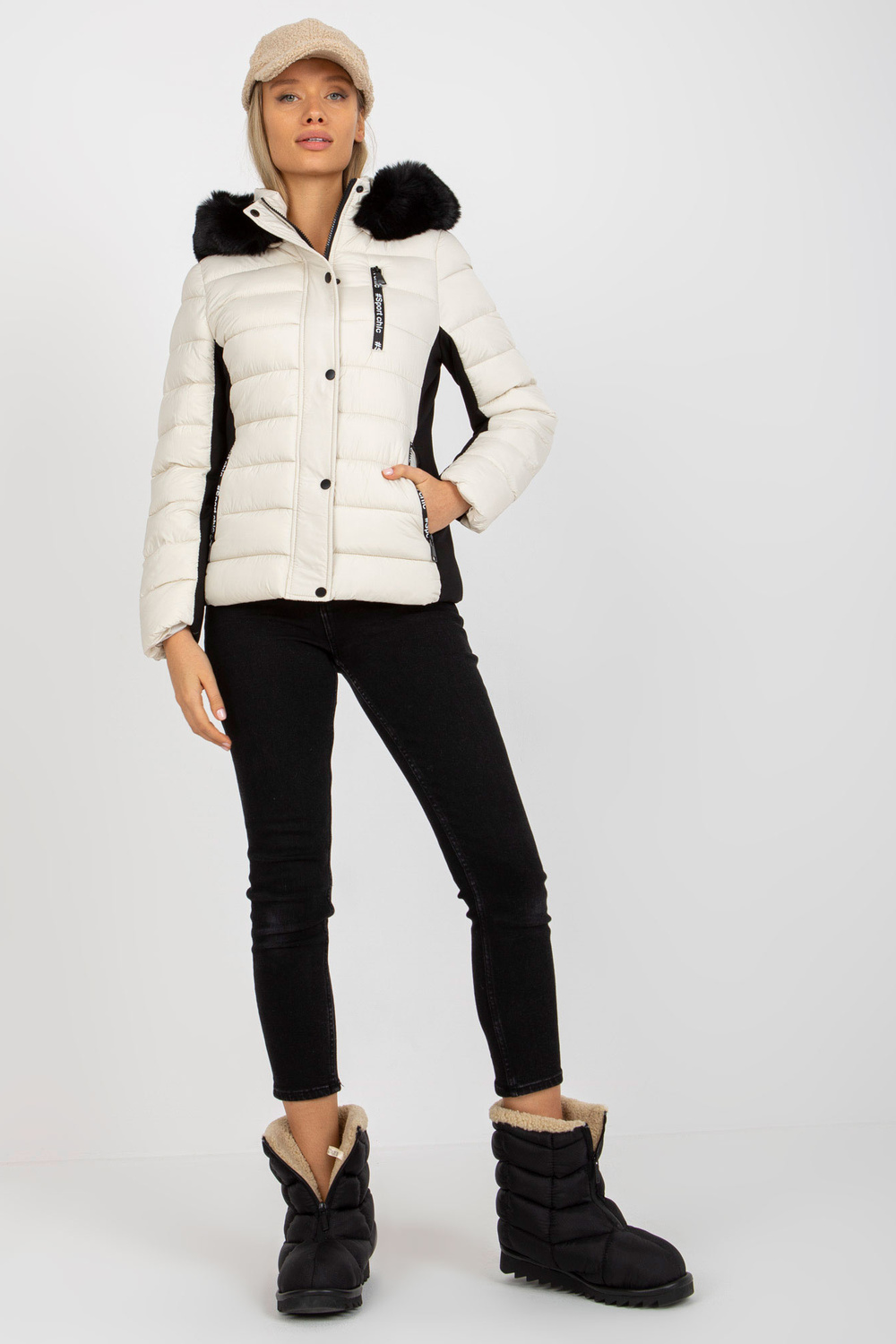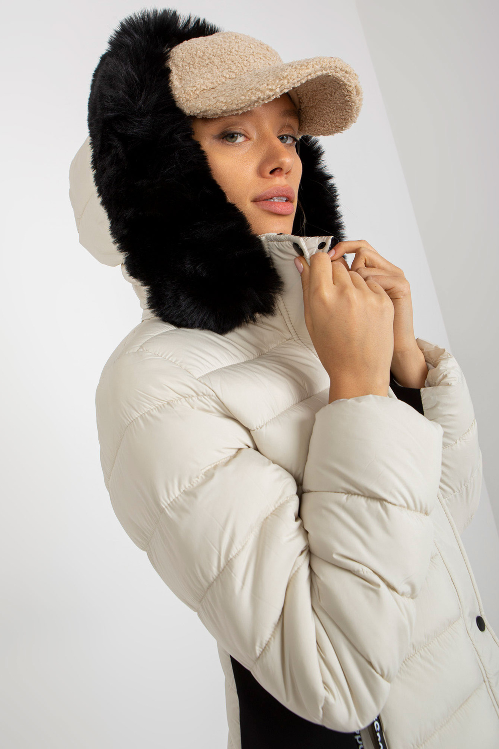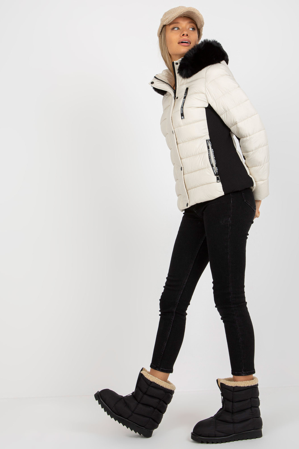 Šviesiai smėlio spalvos pereinamasis dygsniuotas švarkas su gobtuvu.