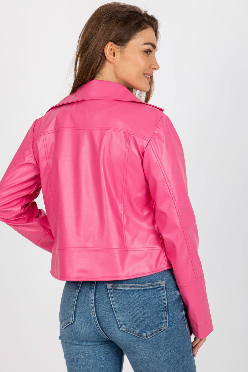 Rožinė trumpa ramonetinė striukė su kišenėmis.