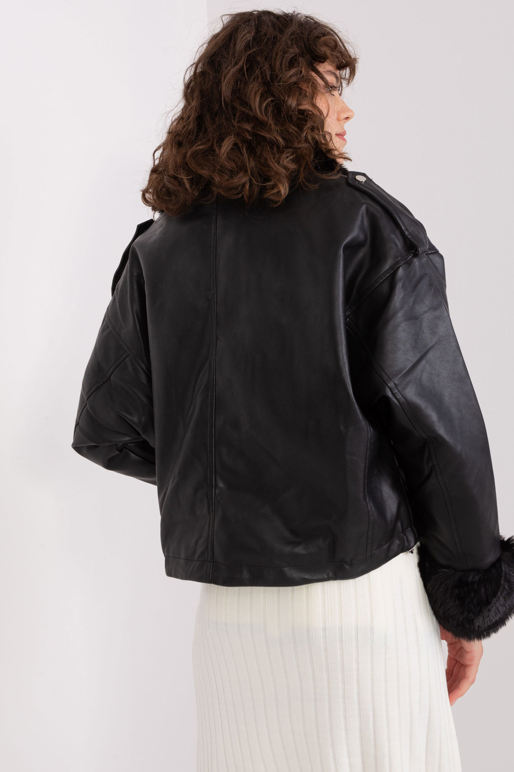 Juoda moteriška žieminė striukė iš ekologiškos odos .