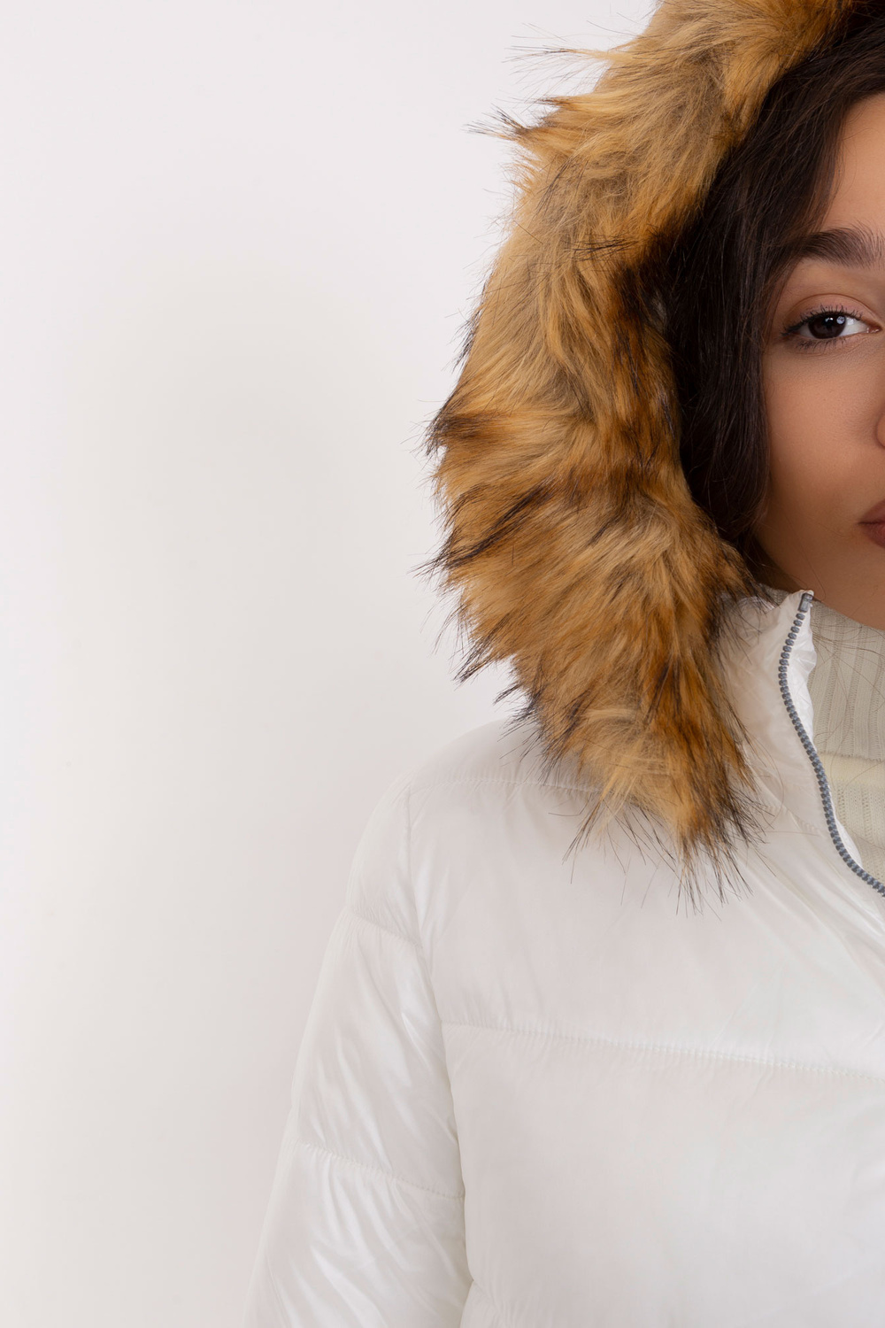 Balta žieminė striukė su nuimamu gobtuvu .
