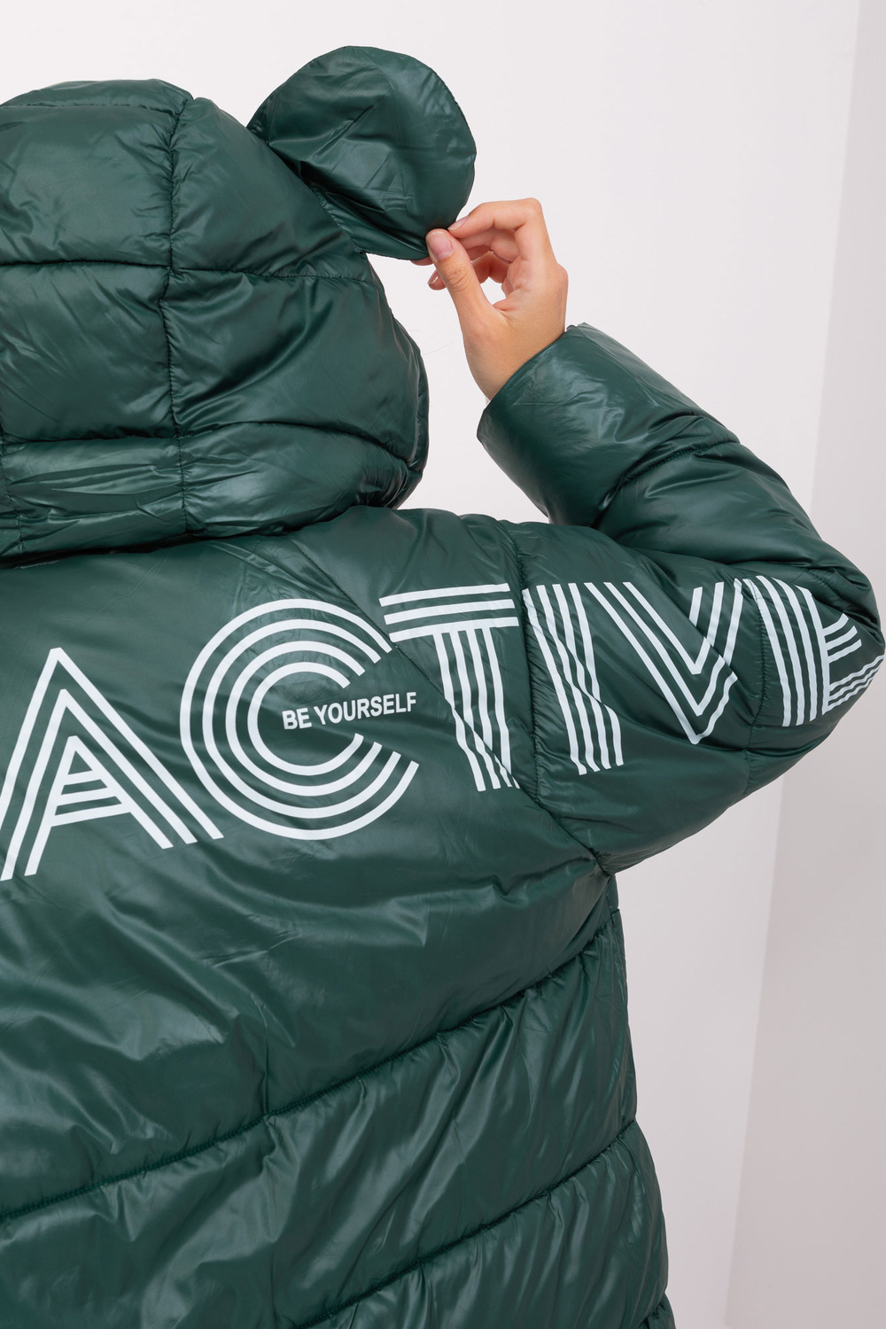 Tamsiai žalia dygsniuota žieminė striukė su gobtuvu.