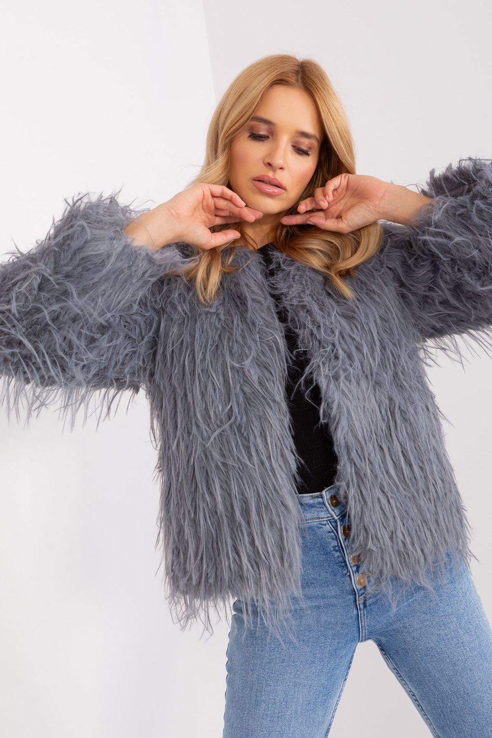 Pilko kailio pereinamasis švarkas su kišenėmis .