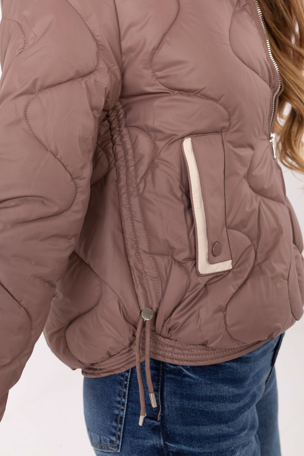 M dydžio striukės išmatavimai matuojant gulintį gaminį: plotis po pažastimis - 53 cm, rankovės ilgis - 62 cm (nuo siūlės), plotis ties klubais - 55 cm, bendras ilgis - 60 cm (priekis), bendras ilgis - 65 cm (nugara).
