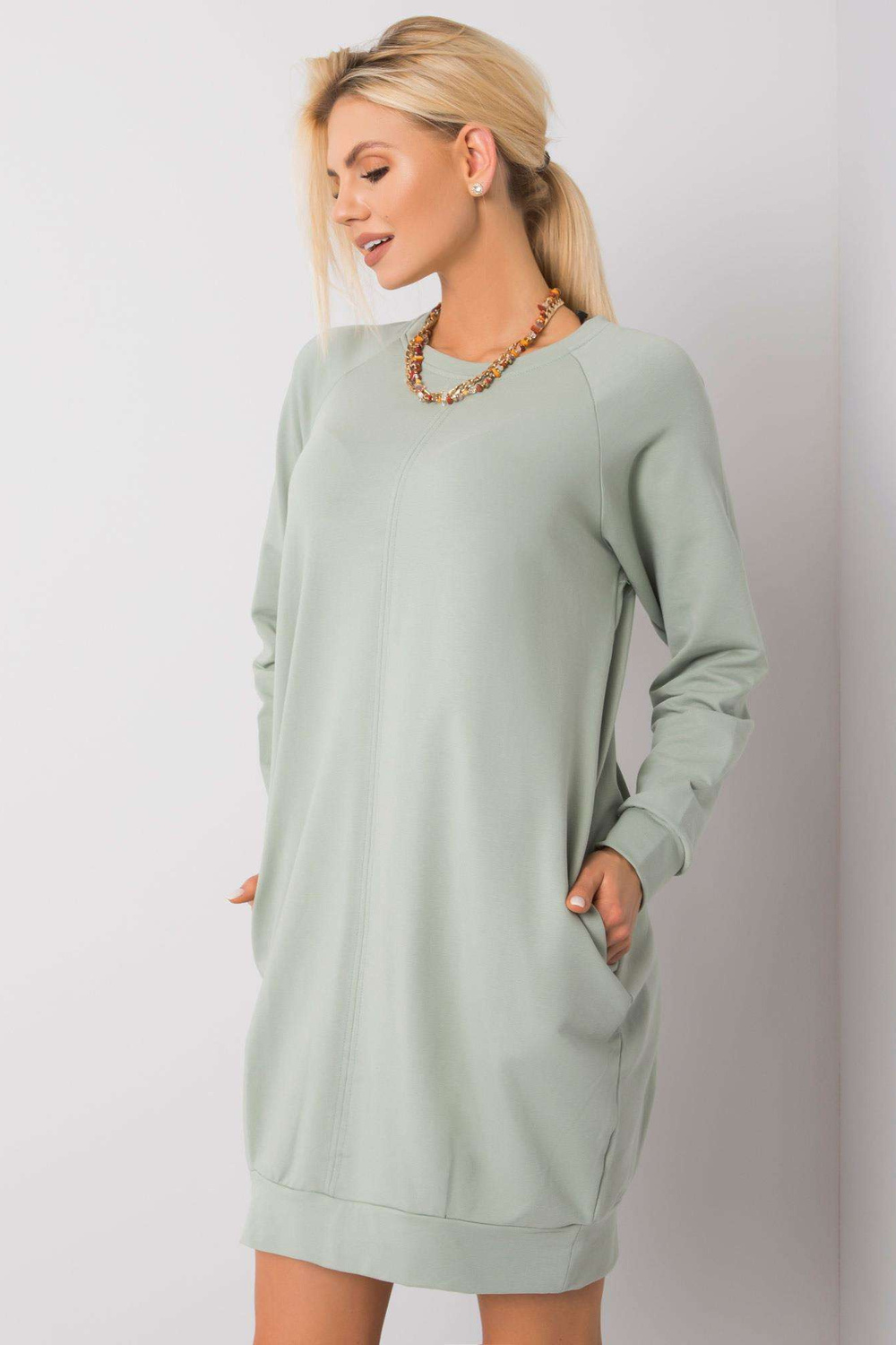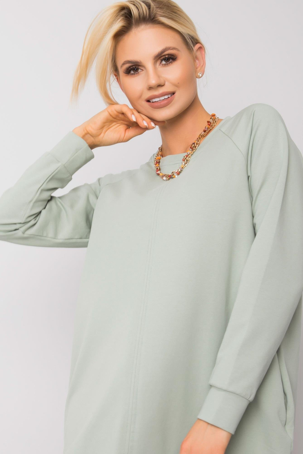 Suknelės matmenys S/M dydžiu, matuojami plokščiai: plotis po pažastimis - 56 cm, bendras ilgis - 90 cm, rankovių ilgis - 58 cm