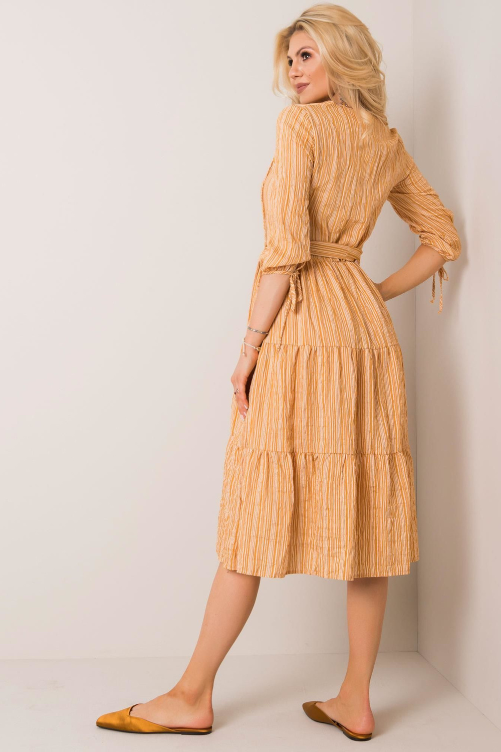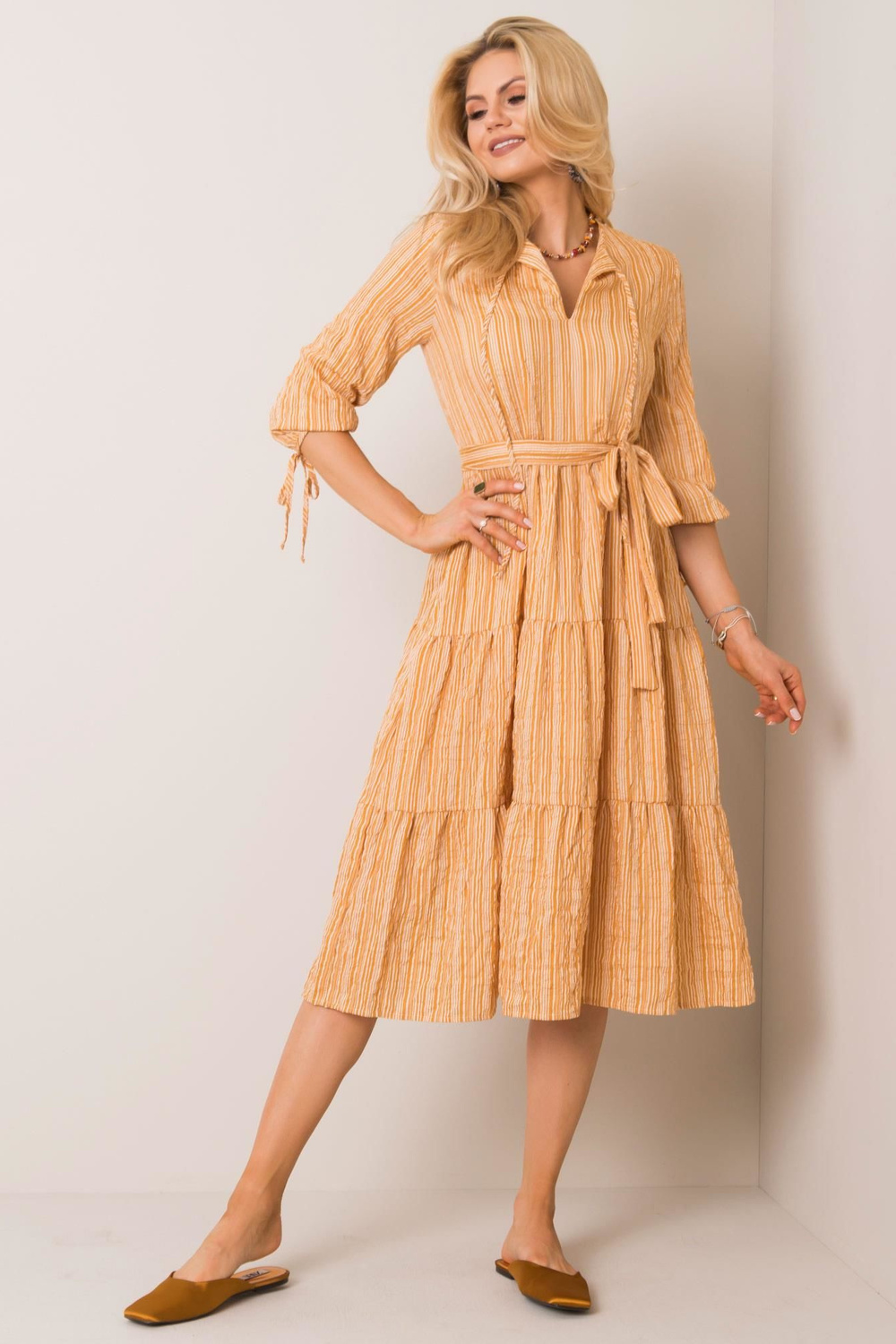 36 dydžio suknelės matmenys išmatuoti plokščiai: plotis po pažastimis - 43 cm, bendras ilgis - 117 cm, rankovių ilgis - 43 cm