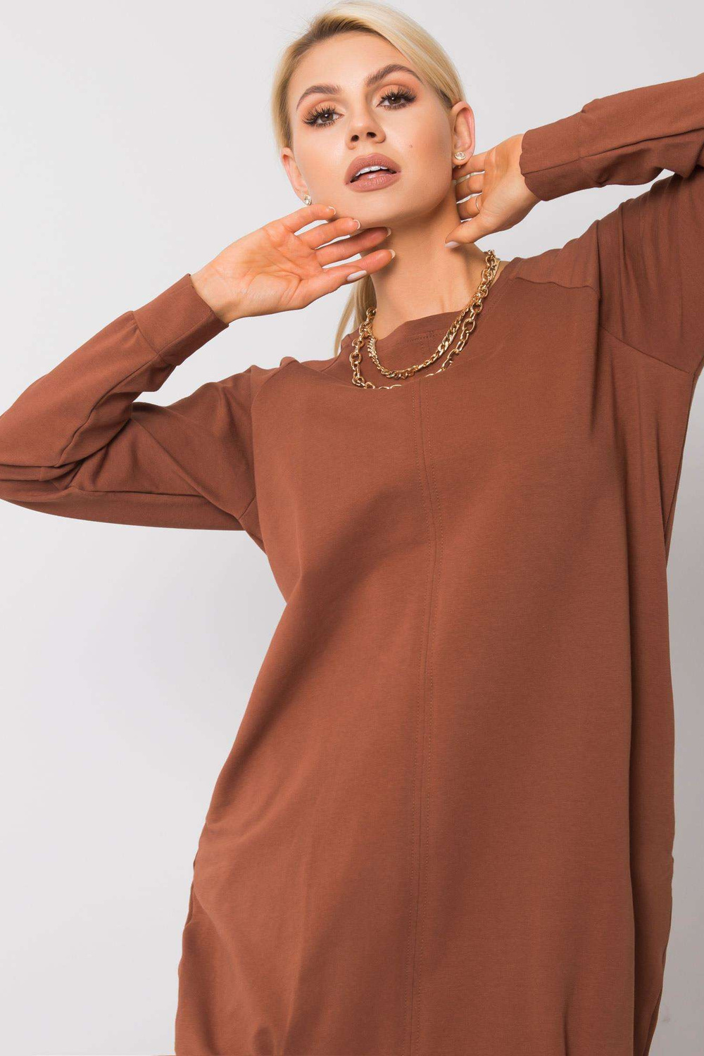Suknelės matmenys S/M dydžiu, matuojami plokščiai: plotis po pažastimis - 56 cm, bendras ilgis - 90 cm, rankovių ilgis - 58 cm