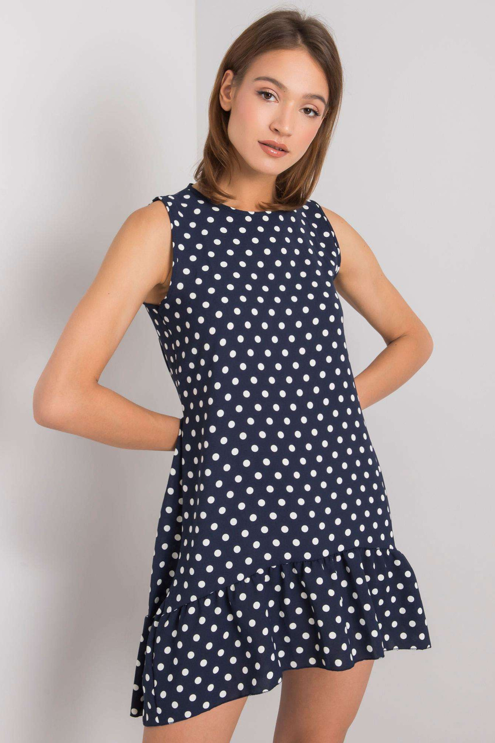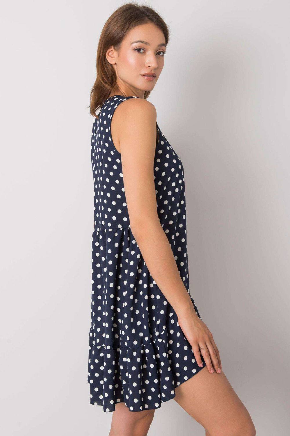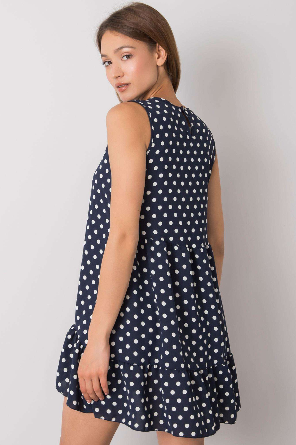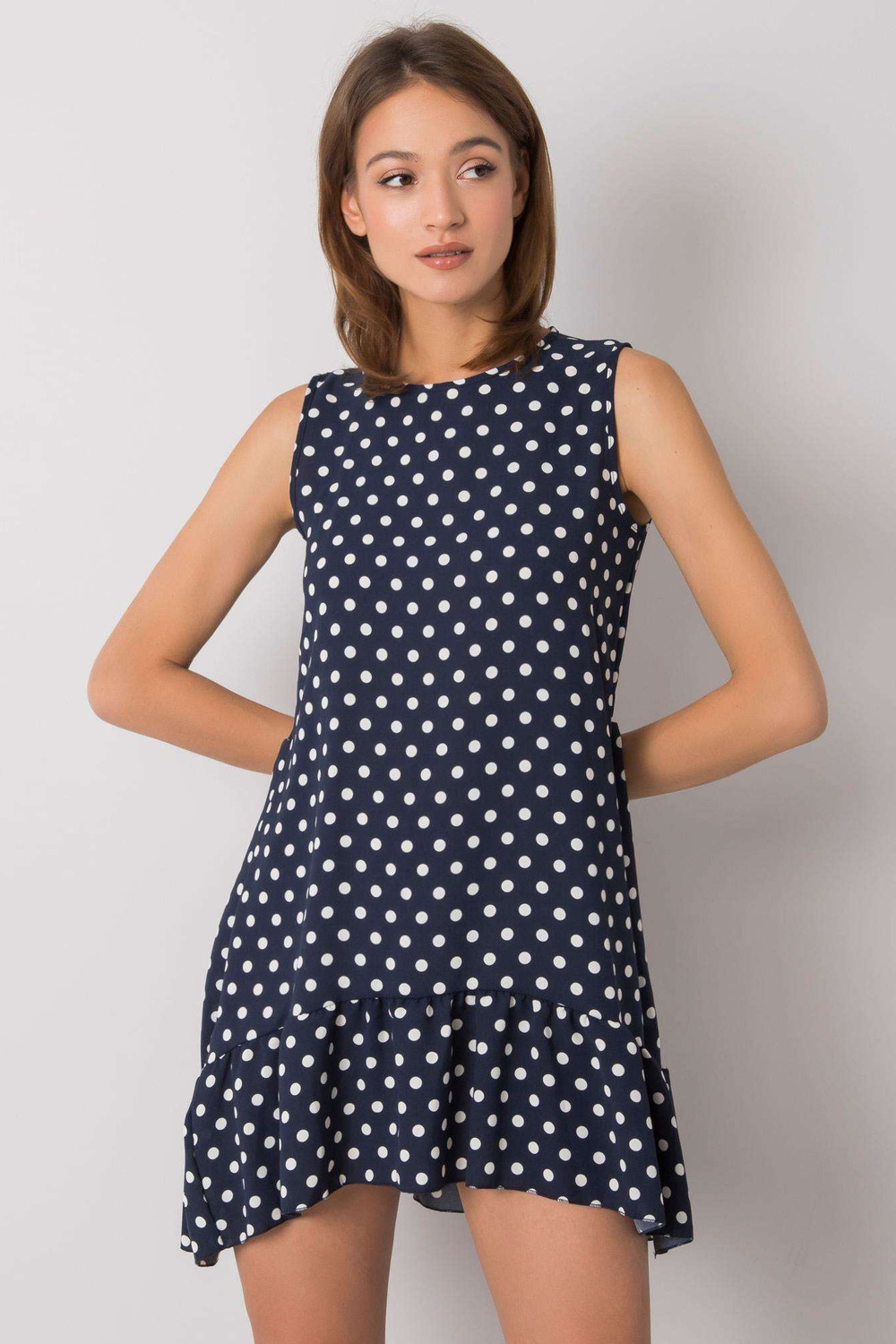Mėlyna taškuota suknelė Nicollete RUE PARIS. skalbimo būdas: skalbimas mašinoje 30°C. Modelis dėvi S dydį. Modelio išmatavimai: aukštis 180 cm, krūtinė 89 cm, juosmuo 63 cm, klubai 93 cm. S dydžio suknelės matmenys išmatuoti plokščiai: plotis po pažastimis -