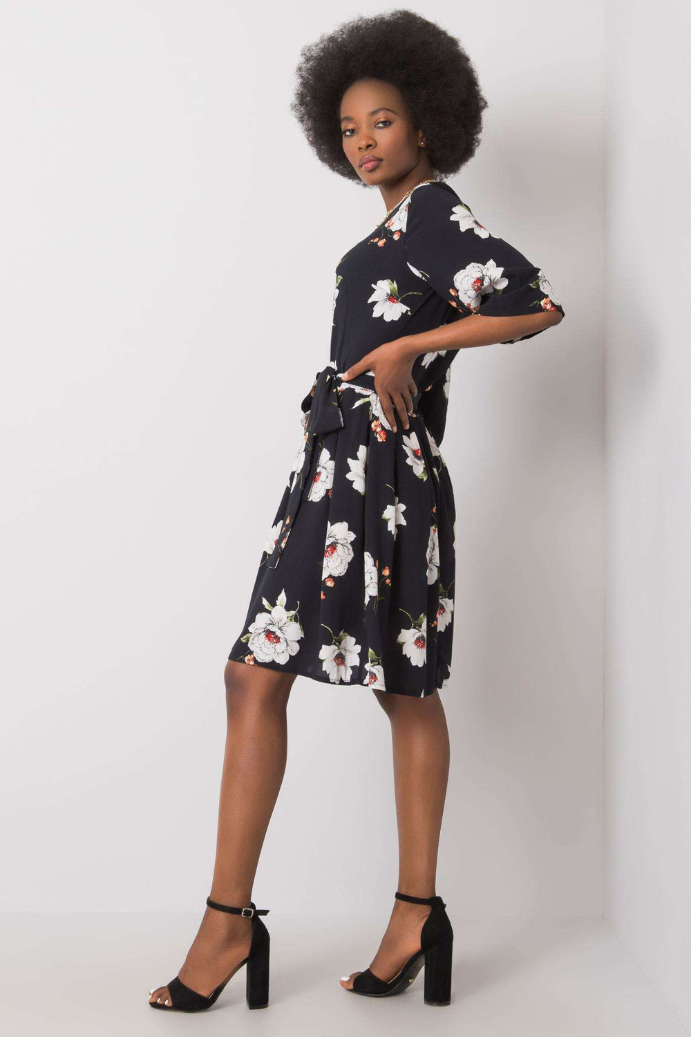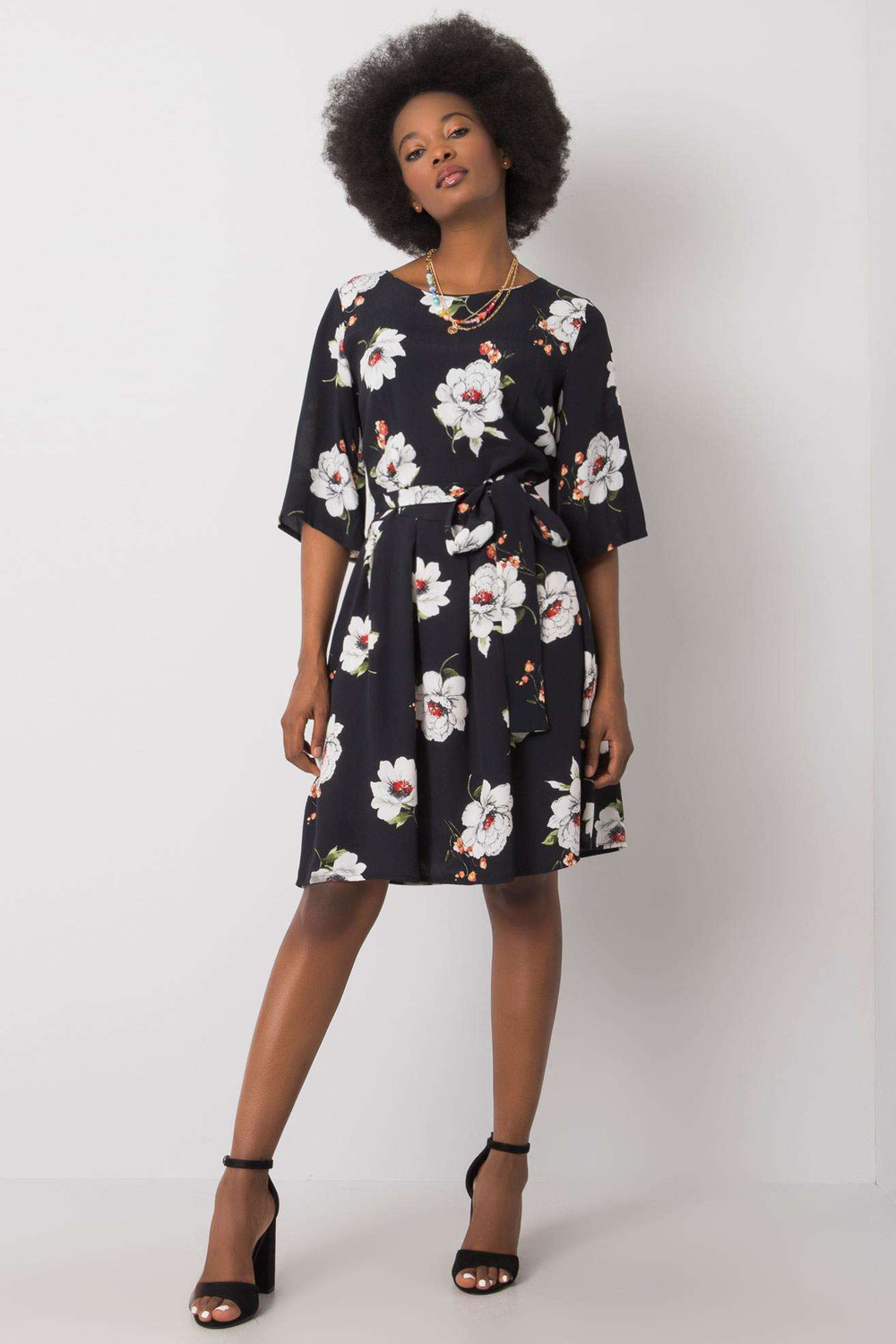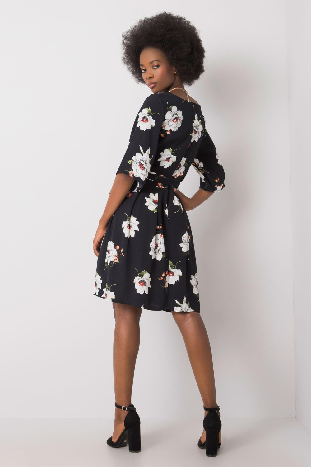 Azarijos juoda gėlių suknelė. aksesuarai: dirželis, įsiūtas užtrauktukas medžiagasudėtis: 65% medvilnė, 30% poliesteris, 5% likra skalbimo būdas: skalbimas mašinoje 30°C Modelis dėvi 36 dydį. Modelio išmatavimai: aukštis 162 cm, krūtinė 80 cm, juosmuo 63 cm, klubai