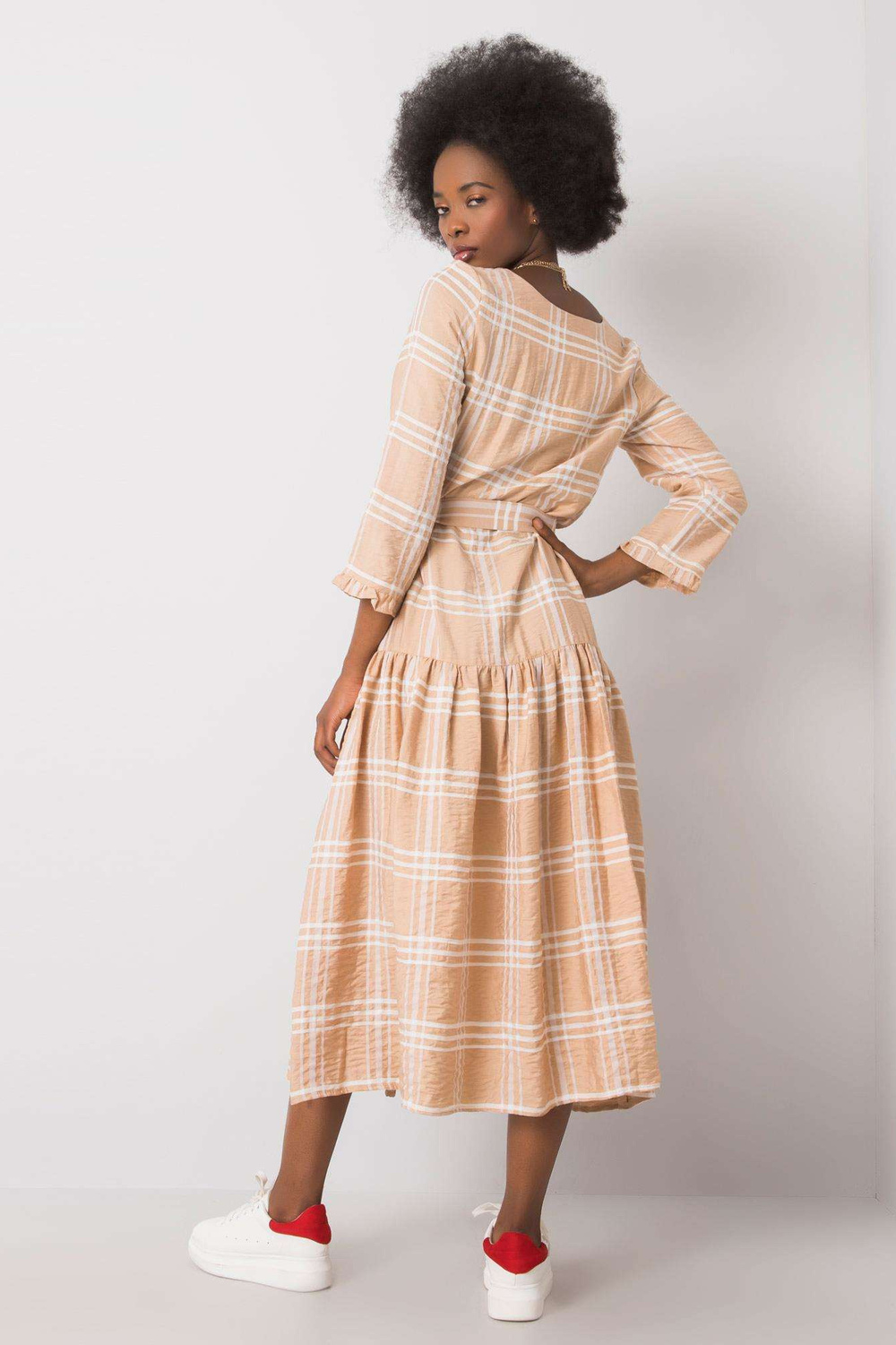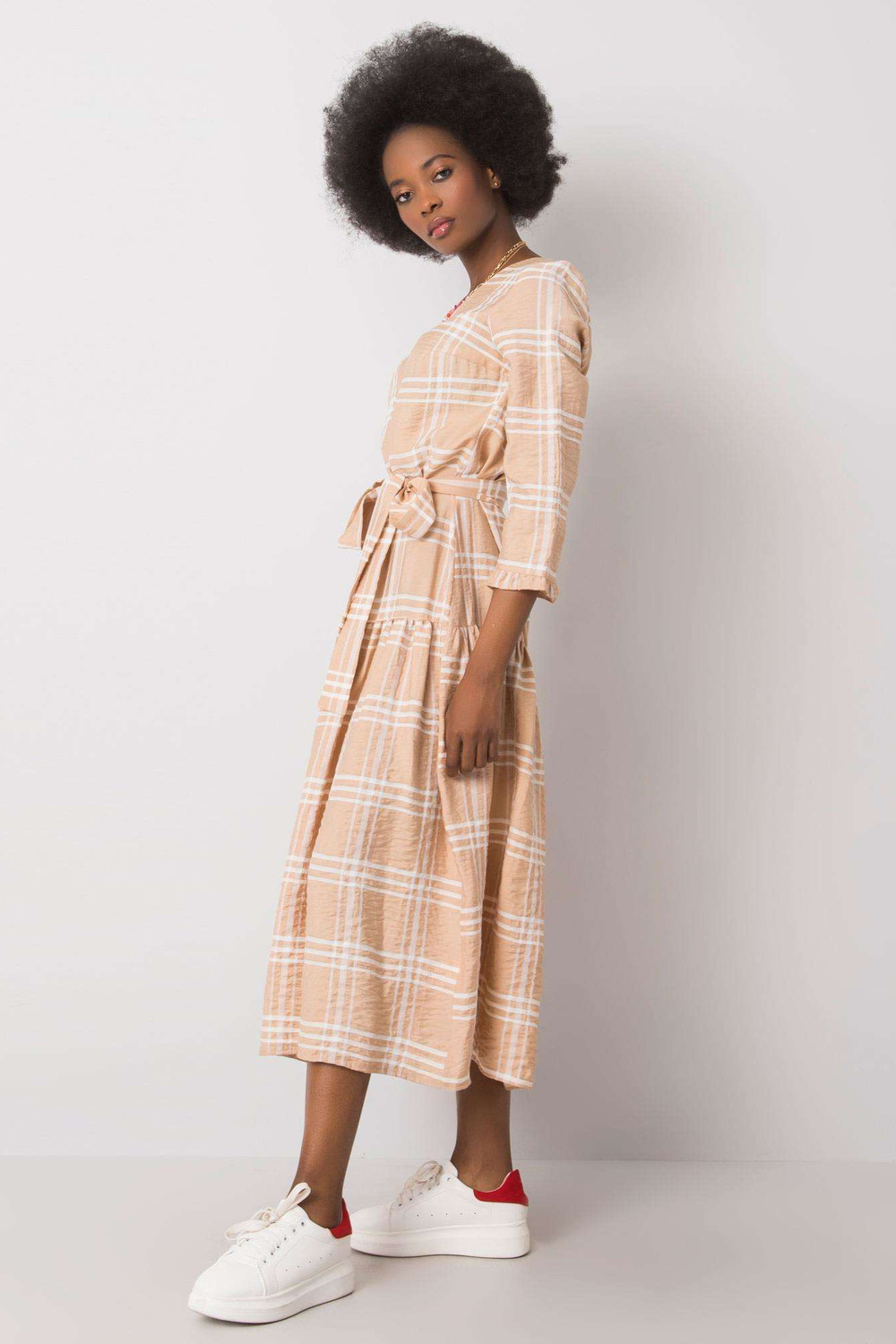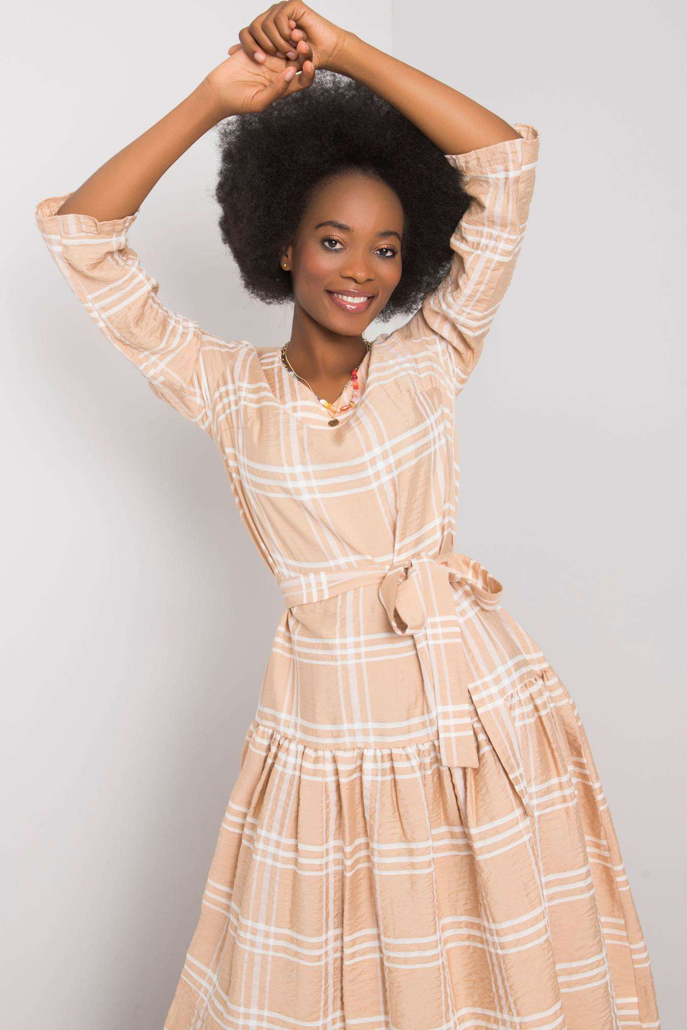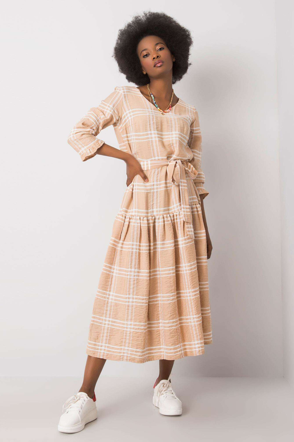 Smėlio spalvos languota Giana suknelė. priedai: dirželio medžiagasudėtis: 50% medvilnė, 35% viskozė, 15% elastanas skalbimo būdas: skalbimo mašina 30°C Modelis dėvi 36 dydį. Modelio išmatavimai: aukštis 162 cm, krūtinė 80 cm, juosmuo 63 cm, klubai 80 cm . Matmenys
