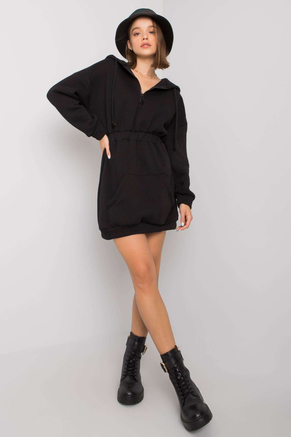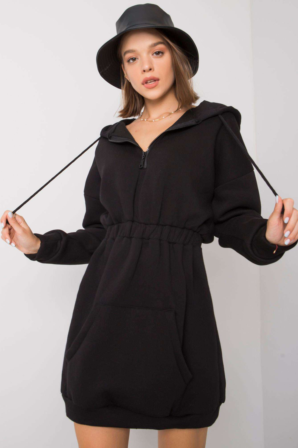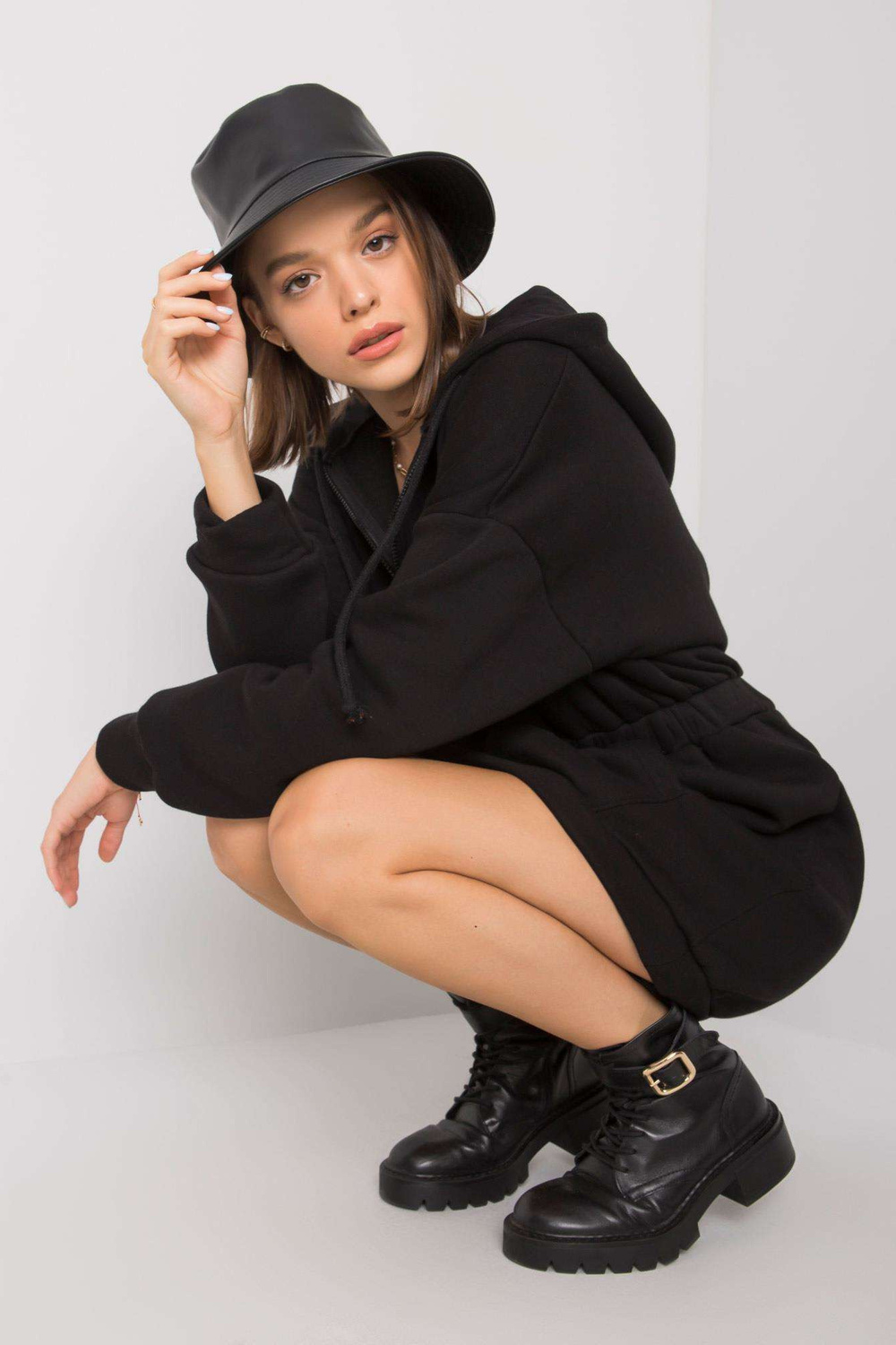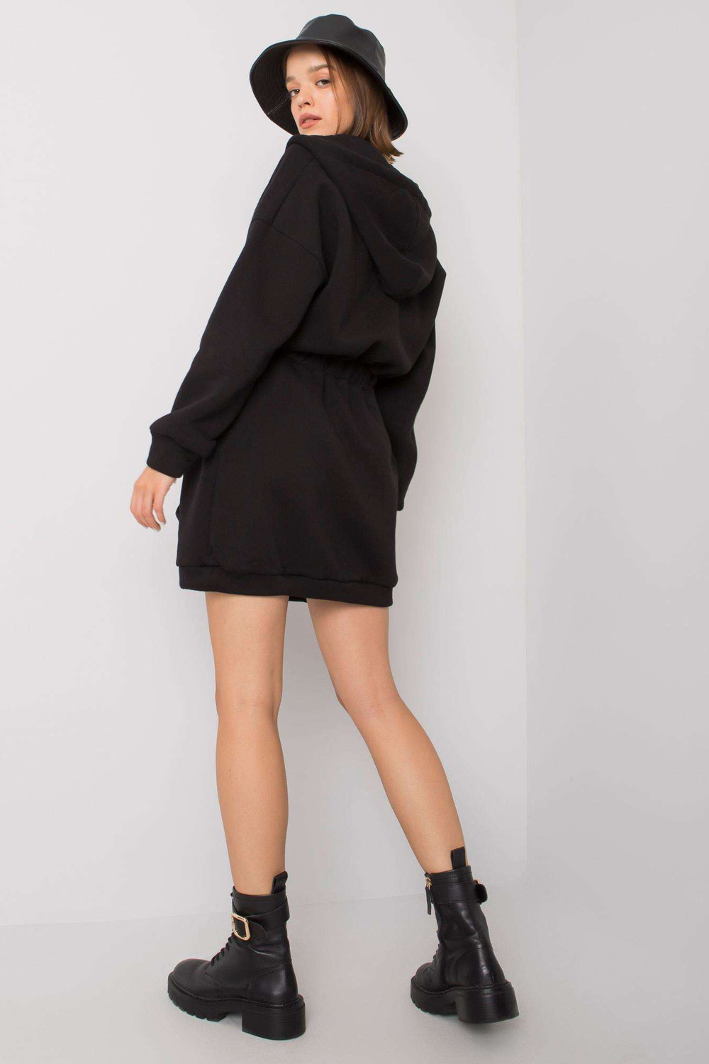 Juodų marškinėlių suknelė su „Skyla“ gobtuvu.