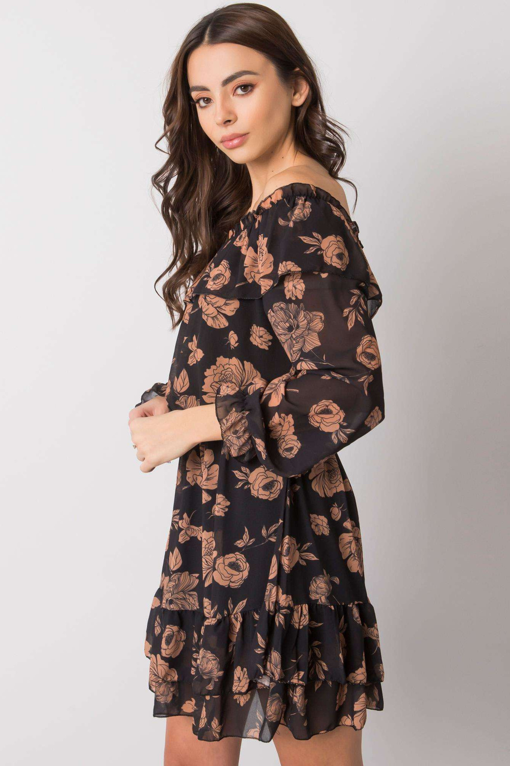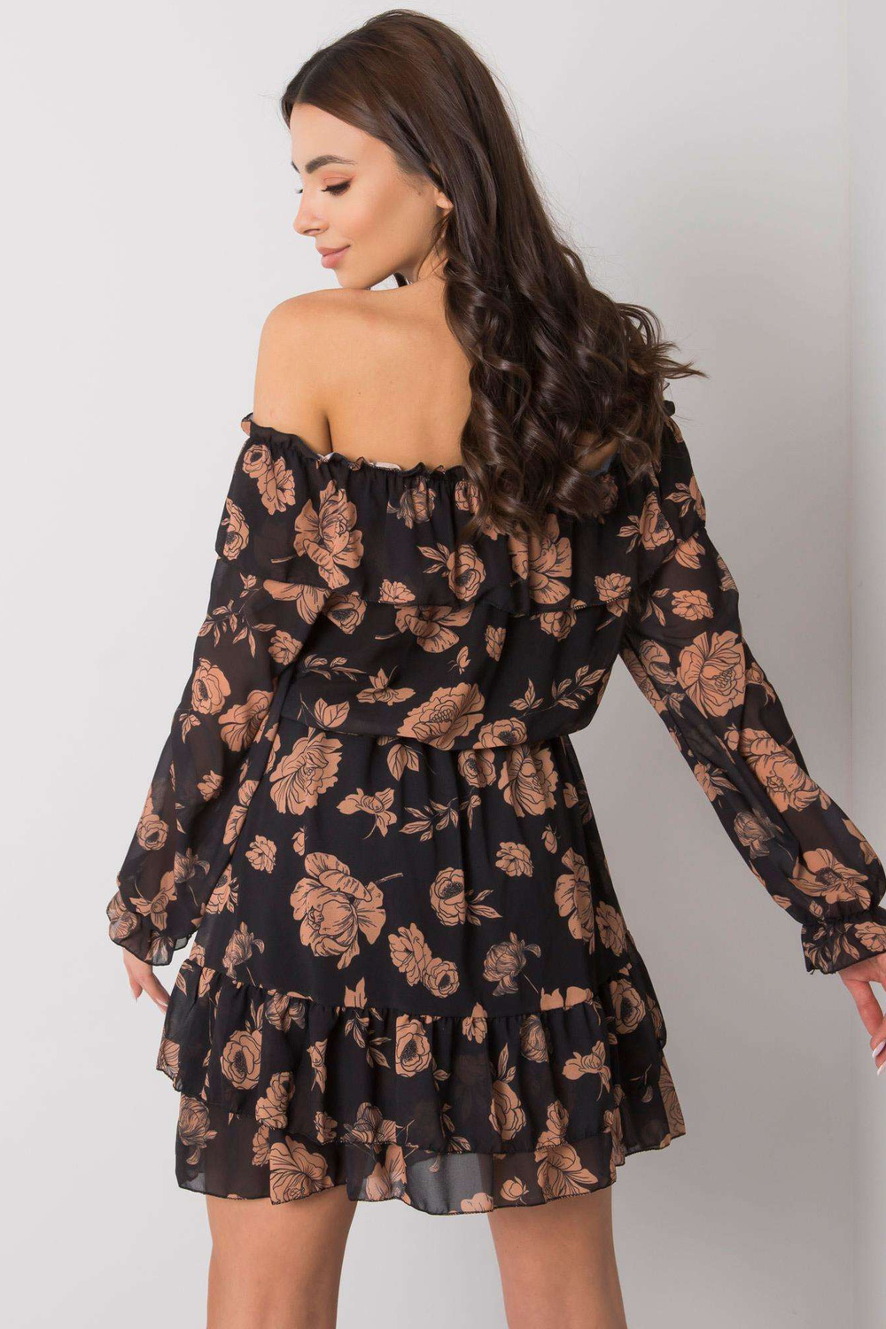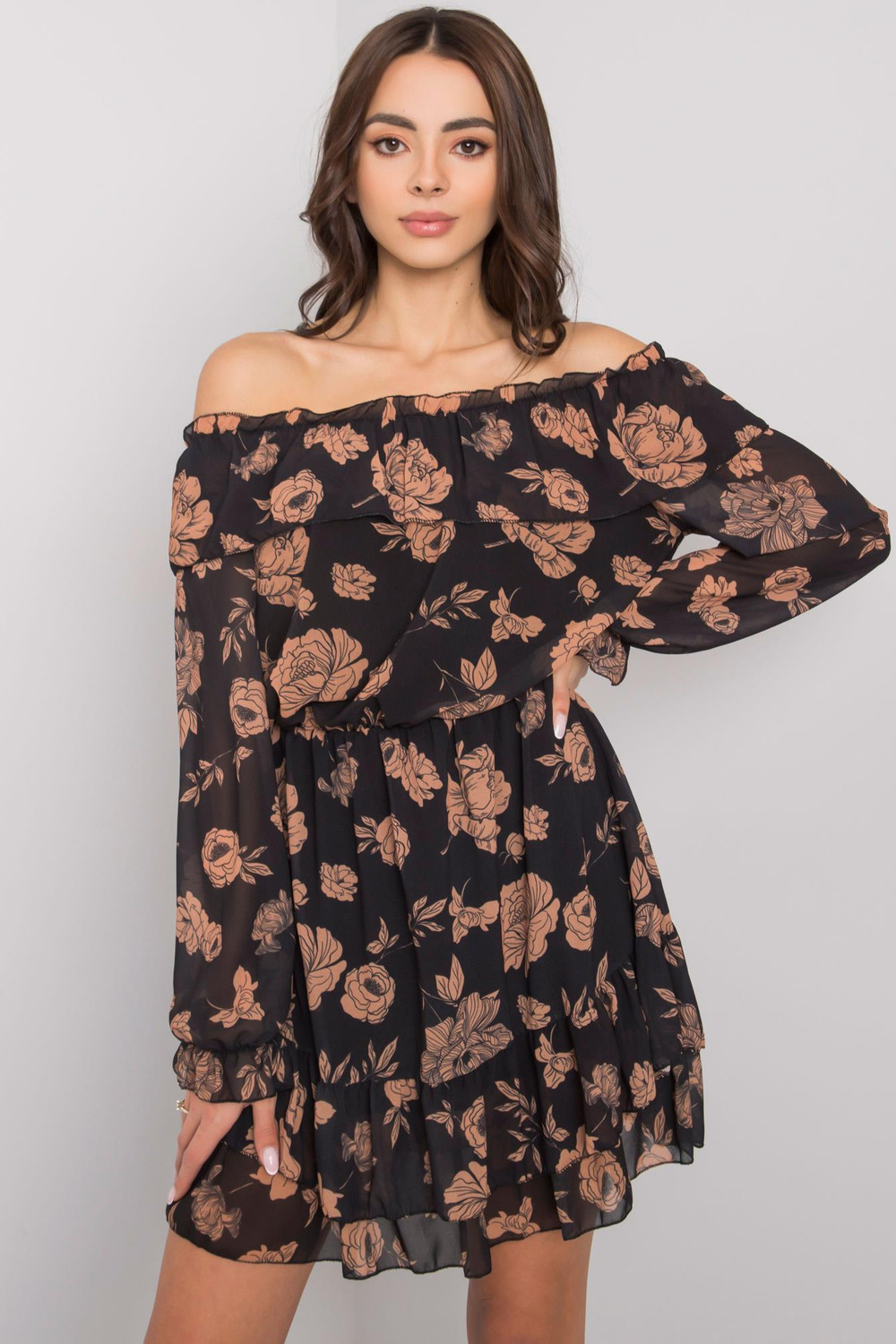 Juodos ir kupranugario spalvos suknelė su ispaniška iškirpte.