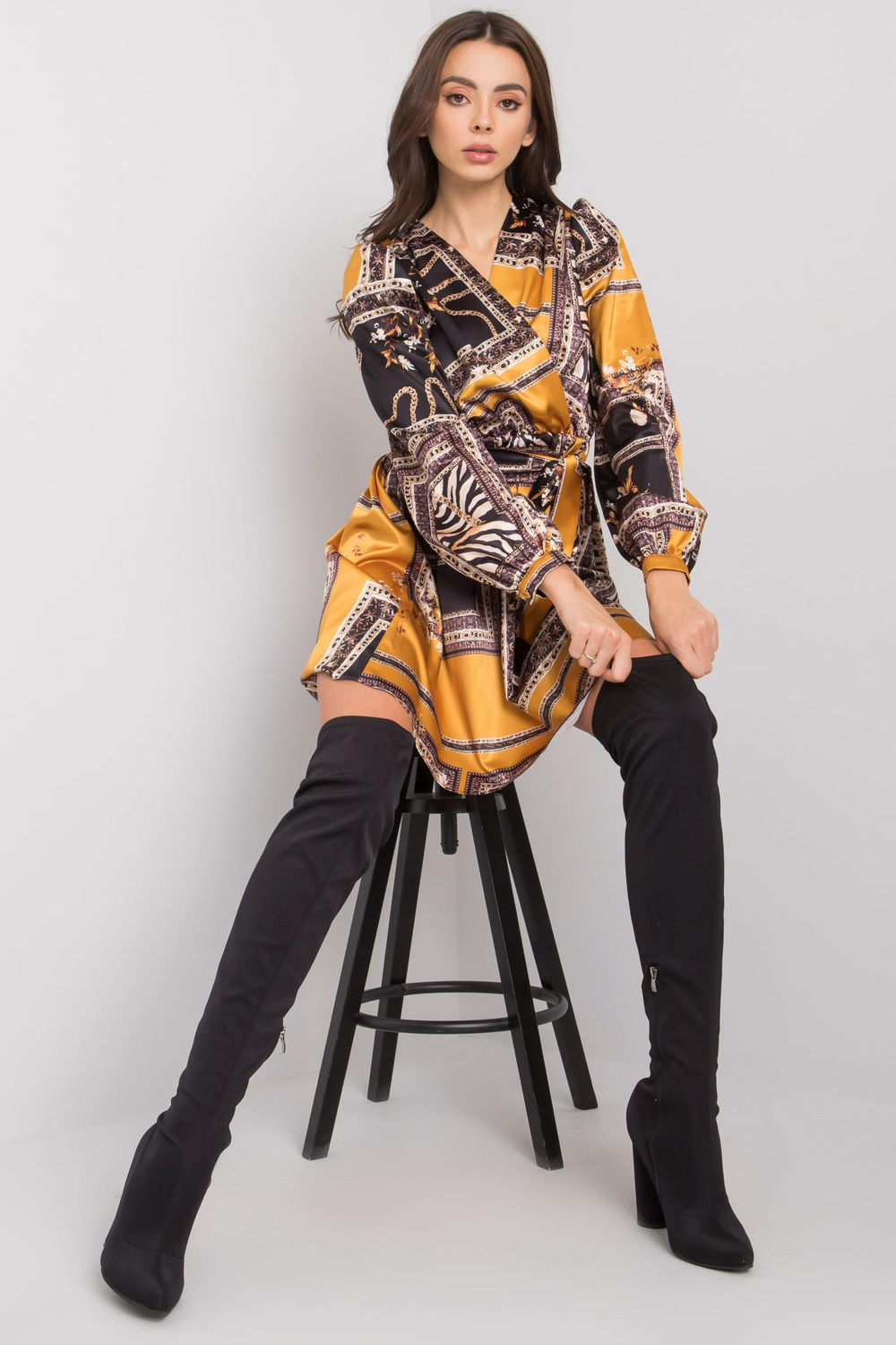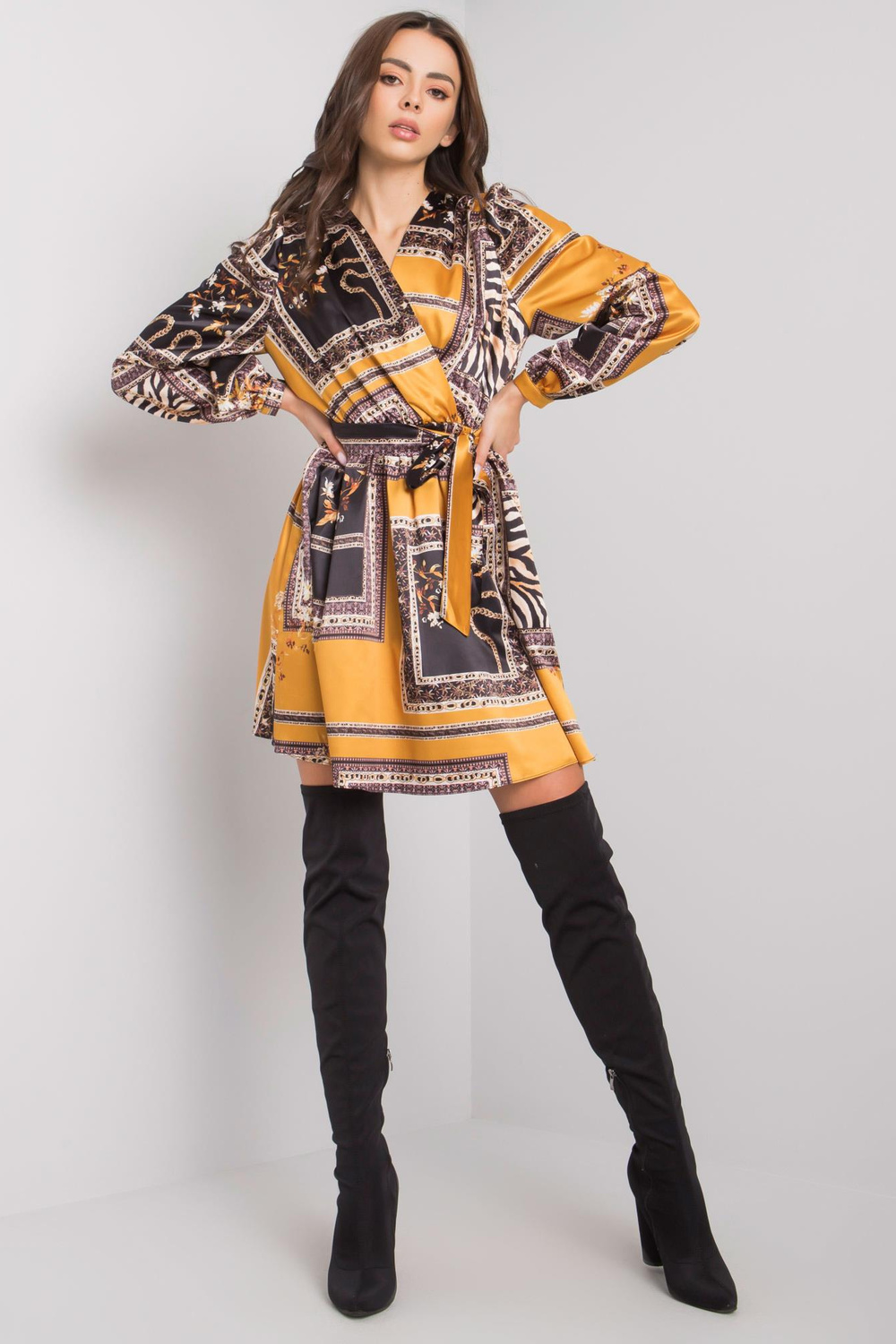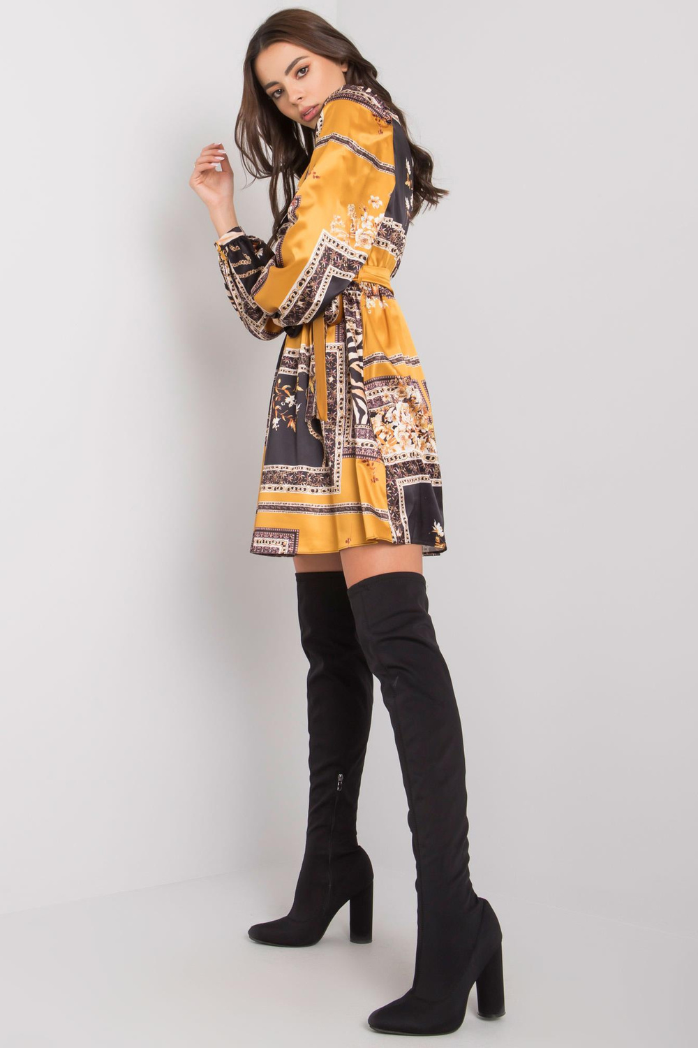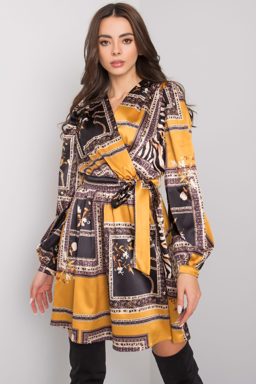 Juoda ir geltona suknelė su Alarra diržu. priedai: dirželio medžiagos sudėtis: 97% poliesteris, 3% likra Skalbimo būdas: skalbimo mašina 30°C Modelis dėvi S dydį. Modelio išmatavimai: aukštis 175 cm, krūtinė 84 cm, juosmuo 61 cm, klubai 91 cm. Matmenys