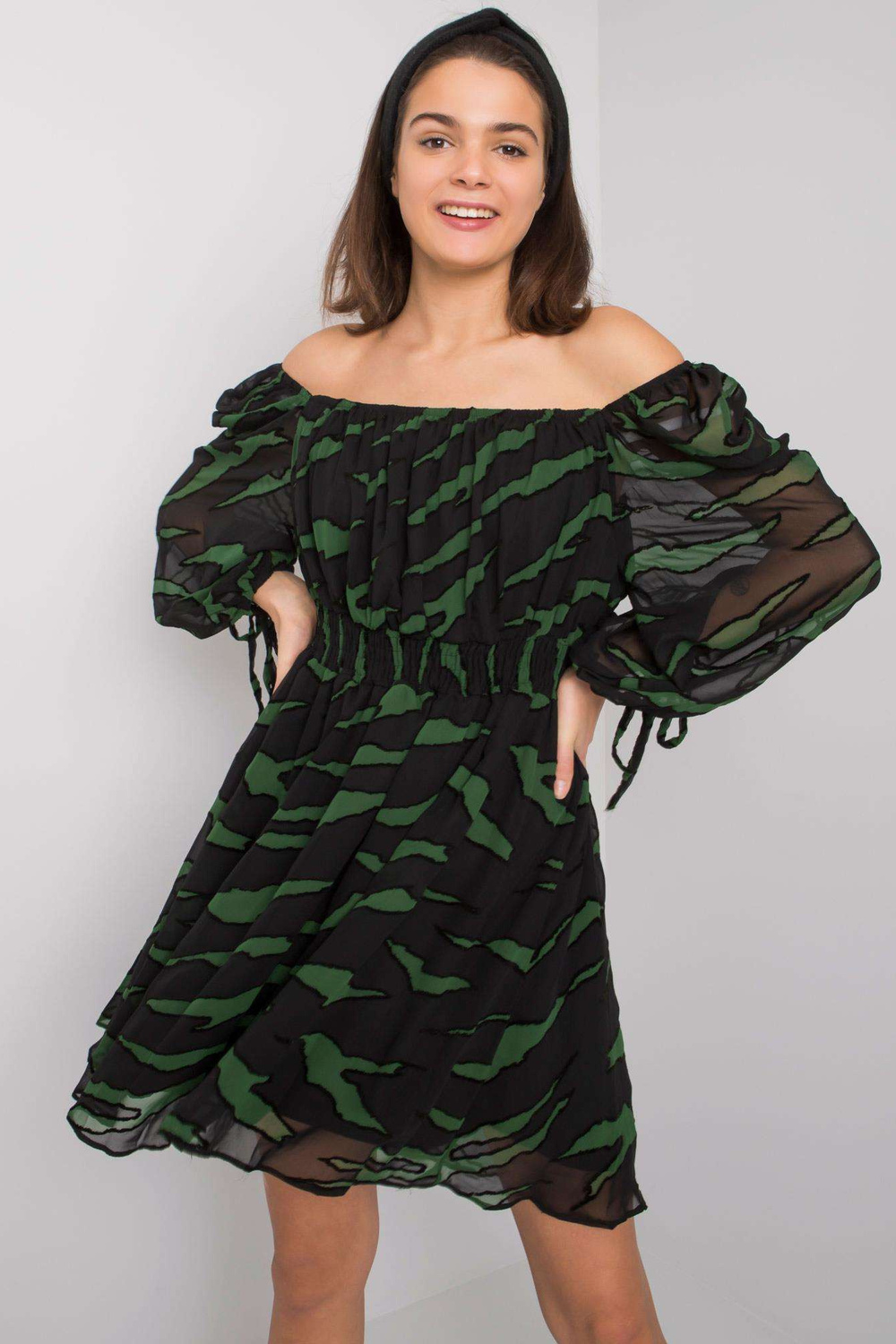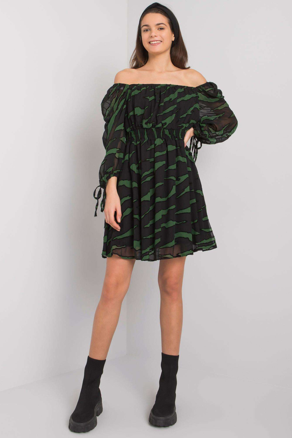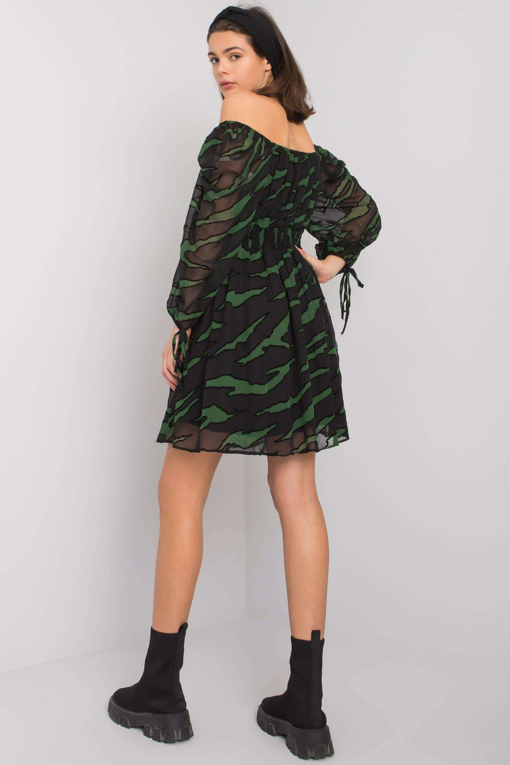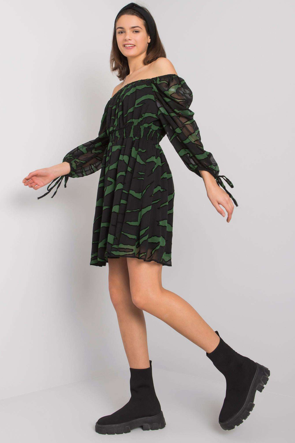 Juoda ir žalia ispaniška suknelė su Philippi raštais. priedai: pamušalas Medžiagos sudėtis: 100% poliesteris skalbimo būdas: skalbimo mašina 30°C. Modelis dėvi S dydį. Modelio išmatavimai: aukštis 175 cm, krūtinė 83 cm, juosmuo 61 cm, klubai 88 cm. Matmenys