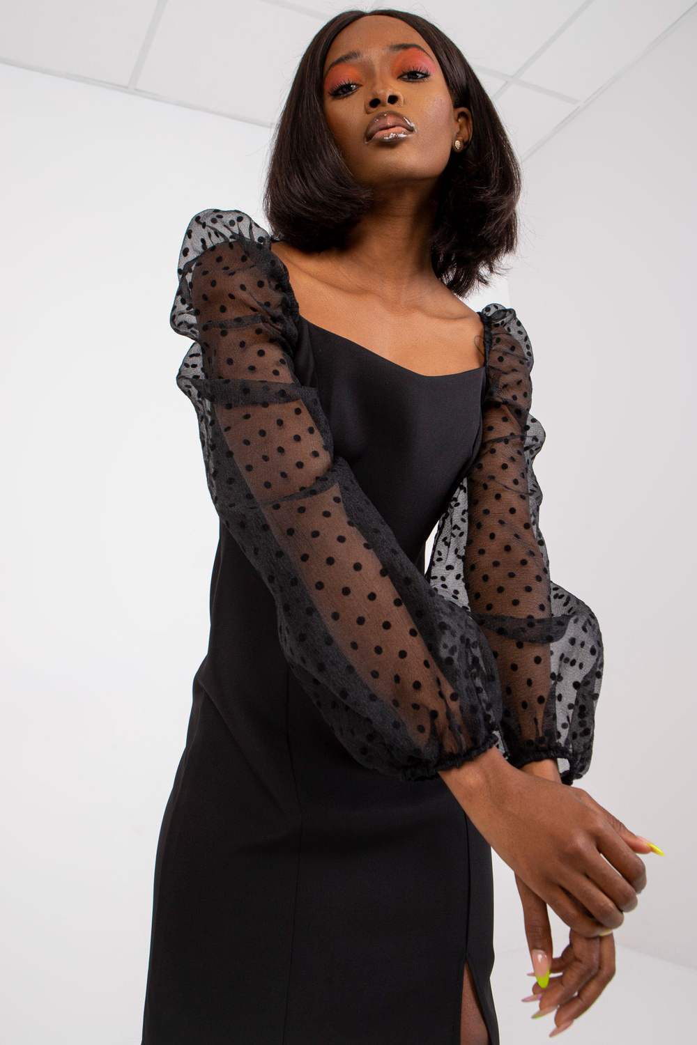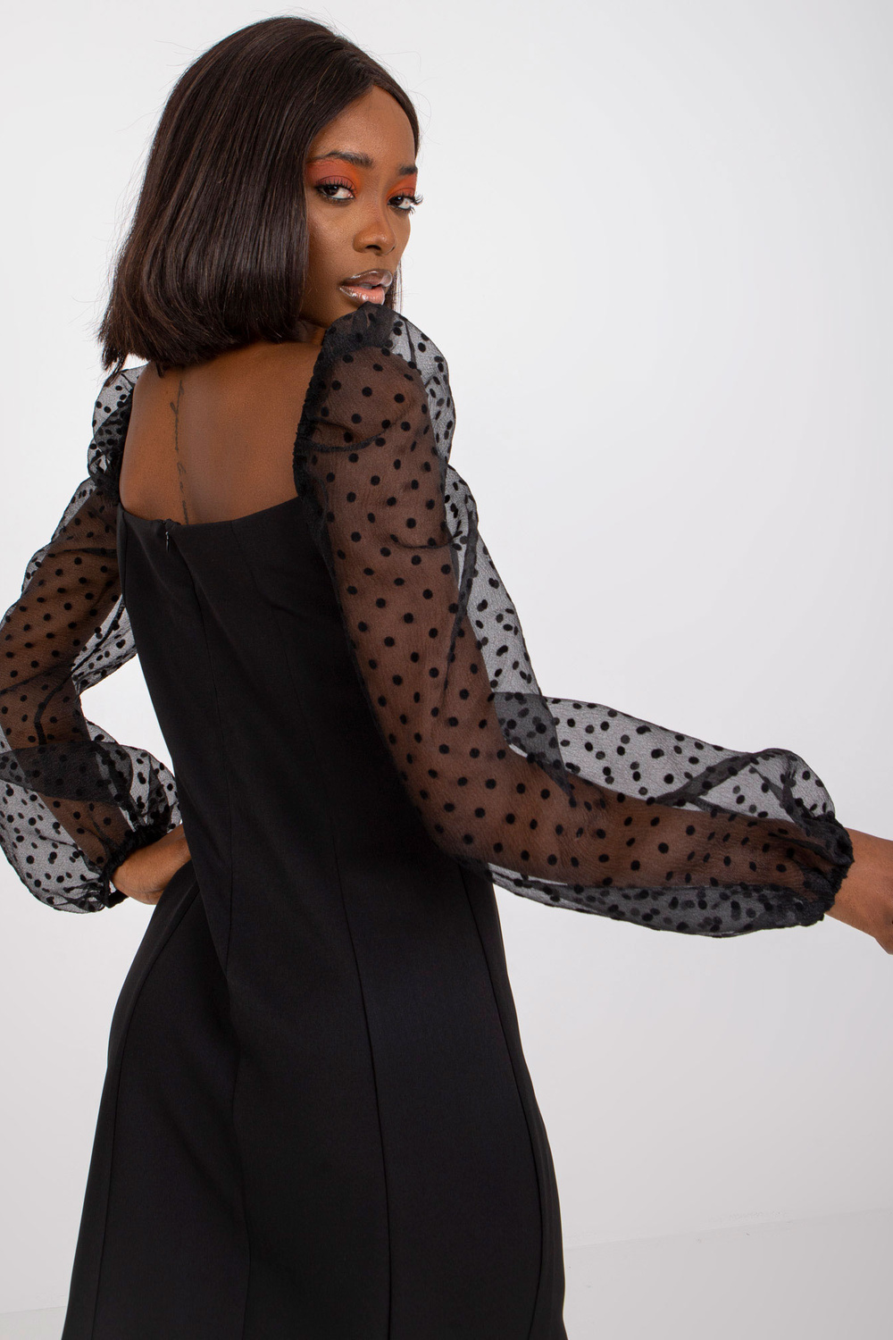 36 dydžio suknelės matmenys išmatuoti plokščiai: plotis po pažastimis - 40 cm, bendras ilgis - 90 cm, rankovių ilgis - 65 cm.