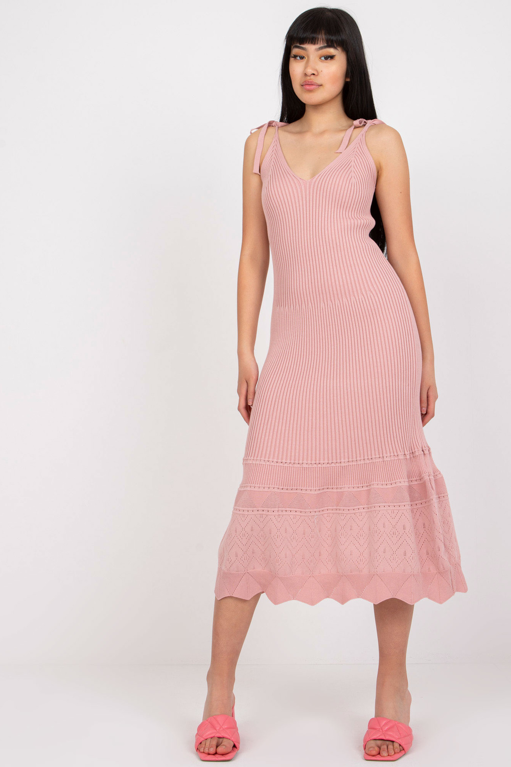 Purvinos rožinės spalvos suknelė su juostelėmis megztais petnešėlėmis.